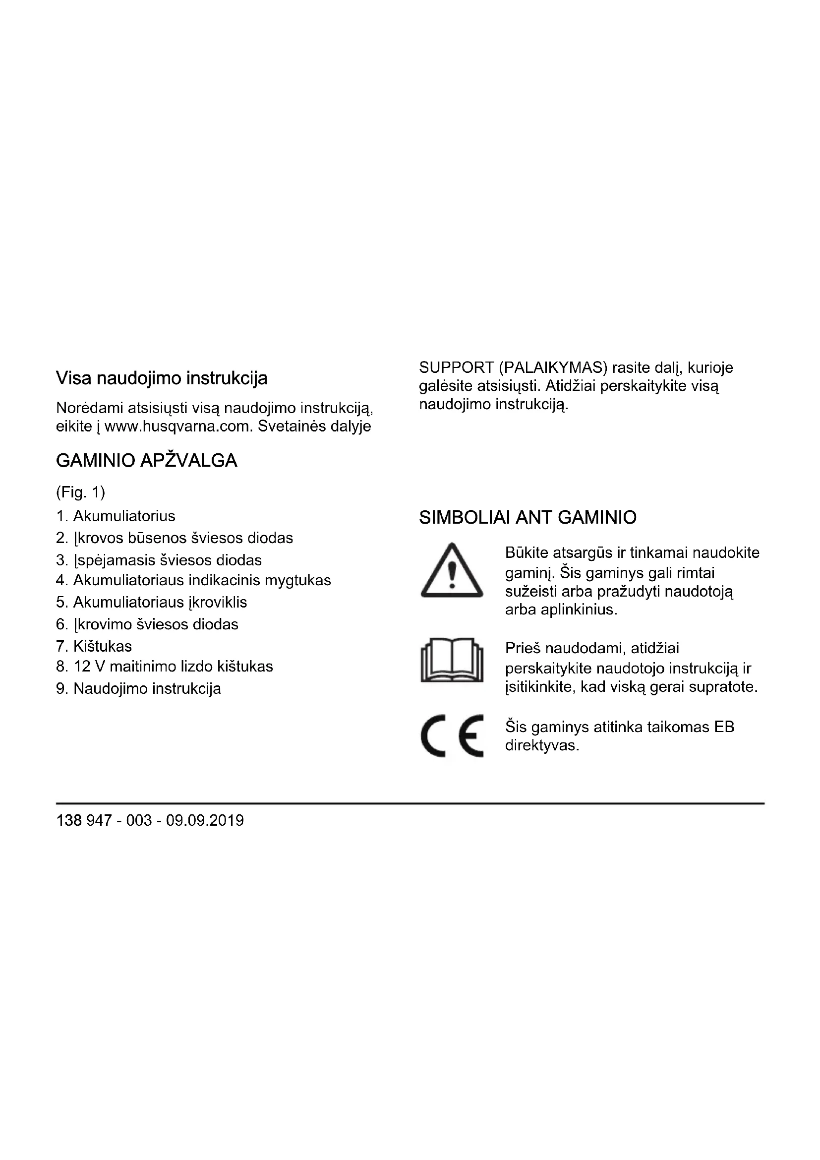 Būkite atsargūs ir tinkamai naudokite gaminį. Šis gaminys gali rimtai sužeisti arba pražudyti naudotoją arba aplinkinius. Prieš naudodami, atidžiai perskaitykite naudotojo instrukciją ir įsitikinkite, kad viską gerai supratote. Šis gaminys atitinka taikomas EB direktyvas. 138 947 - 003 - 09.09.2019Gaminys ar gaminio pakuotė nepriskiriami buitinėms atliekoms. Nuvežkite gaminį perdirbimui į atitinkamą elektros ir elektronikos įrenginių utilizavimo vietą. Saugokite gaminį nuo vandens ir lietaus. Akumuliatoriaus įkroviklį naudokite ir laikykite tik uždarose patalpose. Pasižymėkite: Kiti ant gaminio pateikti simboliai (lipdukai), skirti kitų komercinių teritorijų sertifikavimo reikalavimams.