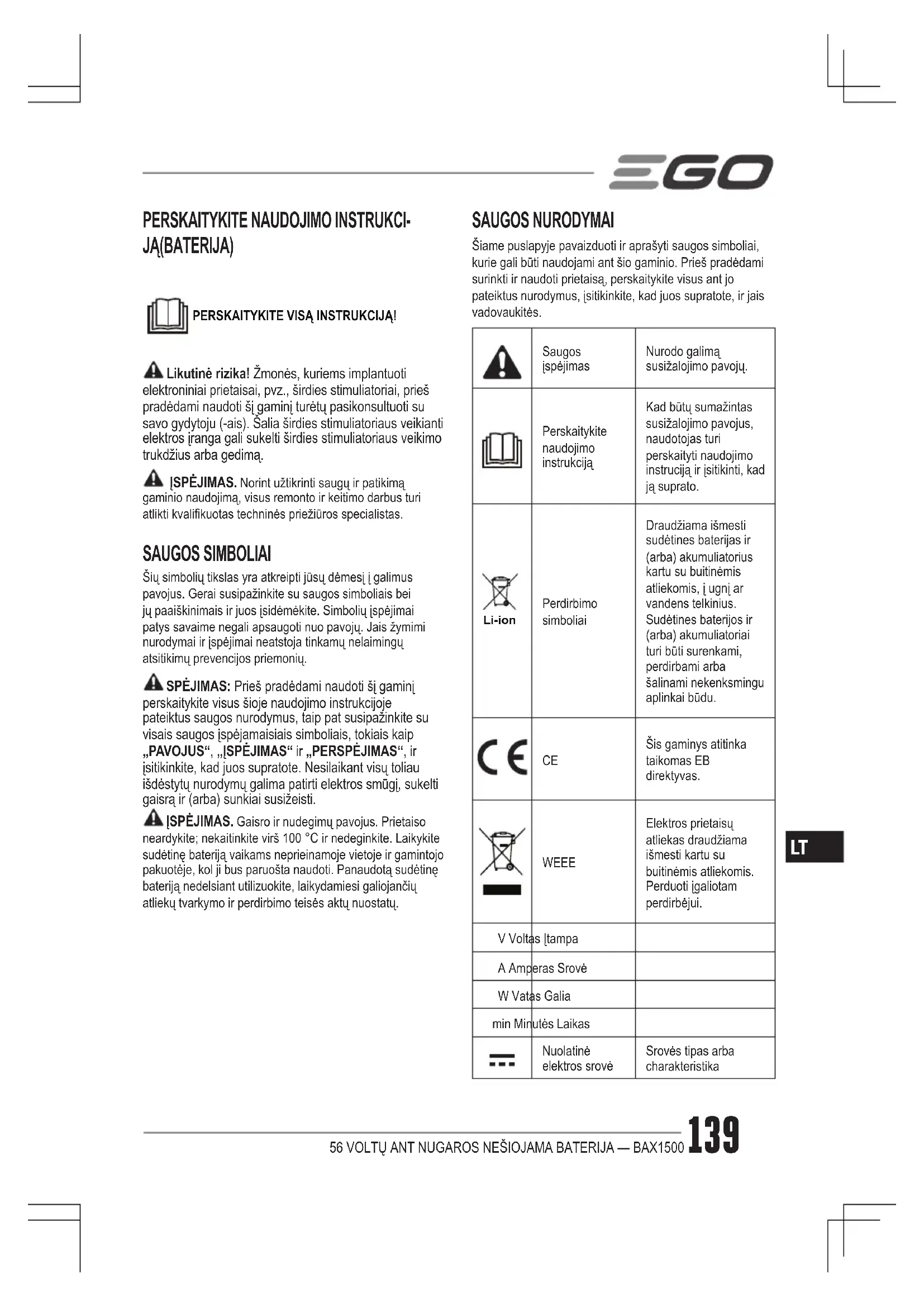 BAX1501 - Baterija EGO - Nemokama naudojimo instrukcija