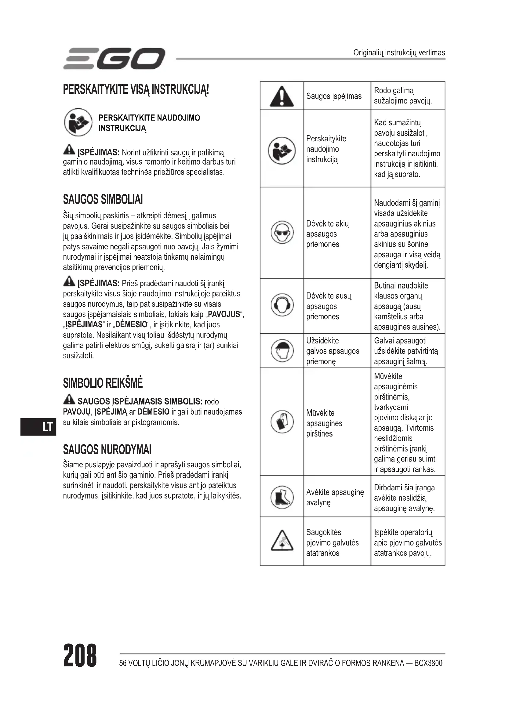 SAUGOS ĮSPĖJAMASIS SIMBOLIS: rodo PAVOJŲ, ĮSPĖJIMĄ ar DĖMESIO ir gali būti naudojamas su kitais simboliais ar piktogramomis. SAUGOS NURODYMAI Šiame puslapyje pavaizduoti ir aprašyti saugos simboliai, kurių gali būti ant šio gaminio. Prieš pradėdami įrankį surinkinėti ir naudoti, perskaitykite visus ant jo pateiktus nurodymus, įsitikinkite, kad juos supratote, ir jų laikykitės. Saugos įspėjimas Rodo galimą sužalojimo pavojų. Perskaitykite naudojimo instrukciją Kad sumažintų pavojų susižaloti, naudotojas turi perskaityti naudojimo instrukciją ir įsitikinti, kad ją suprato. Dėvėkite akių apsaugos priemones Naudodami šį gaminį visada užsidėkite apsauginius akinius arba apsauginius akinius su šonine apsauga ir visą veidą dengiantį skydelį. Dėvėkite ausų apsaugos priemones Būtinai naudokite klausos organų apsaugą (ausų kamštelius arba apsaugines ausines). Užsidėkite galvos apsaugos priemonę Galvai apsaugoti užsidėkite patvirtintą apsauginį šalmą. Mūvėkite apsaugines pirštines Mūvėkite apsauginėmis pirštinėmis, tvarkydami pjovimo diską ar jo apsaugą. Tvirtomis neslidžiomis pirštinėmis įrankį galima geriau suimti ir apsaugoti rankas. Avėkite apsauginę avalynę Dirbdami šia įranga avėkite neslidžią apsauginę avalynę. Saugokitės pjovimo galvutės atatrankos Įspėkite operatorių apie pjovimo galvutės atatrankos pavojų. Originalių instrukcijų vertimas56 VOLTŲ LIČIO JONŲ KRŪMAPJOVĖ SU VARIKLIU GALE IR DVIRAČIO FORMOS RANKENA — BCX3800