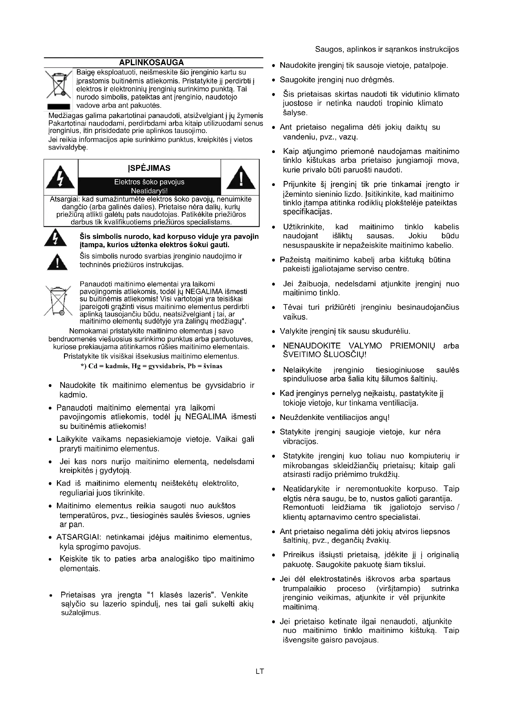 - Panaudoti maitinimo elementai yra laikomi pavojingomis atliekomis, todel ju NEGALIMA iSmesti su buitinemis atliekomis!
