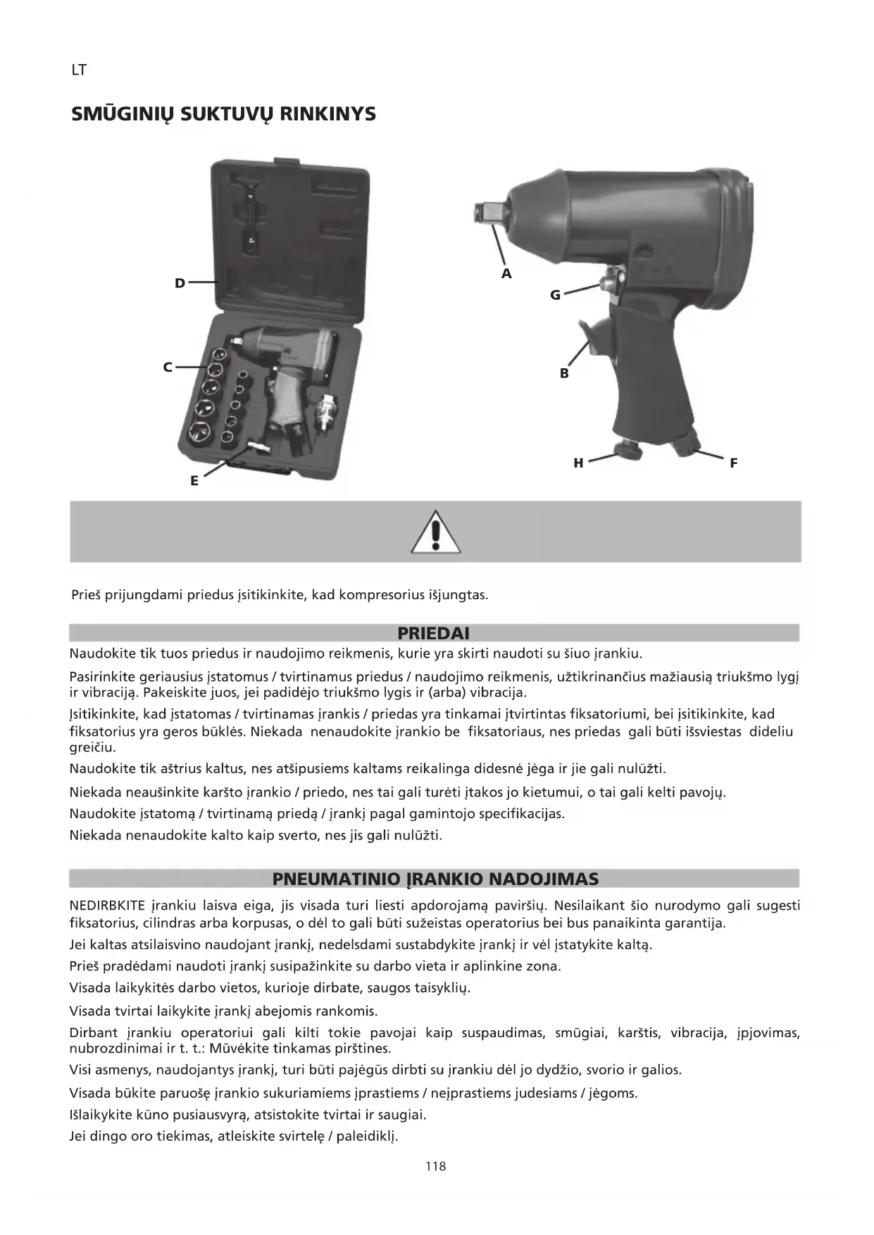 118LT Naudodami pneumatinį įrankį galite justi diskomfortą riešuose, rankose, pečiuose, kakle ir kitose kūno dalyse. Jei jaučiate tokius simptomus kaip nuolatinis ar pasikartojantis diskomfortas, skausmas, tvinkčiojimas, maudimas, dilgčiojimas, užtirpimas, deginimo pojūtis ar sustingimas: neignoruokite šių įspėjamųjų požymių. Nebenaudokite įrankio, pasakykite apie tai savo darbdaviui ir pasikonsultuokite su kvalikuotu sveikatos specialistu.