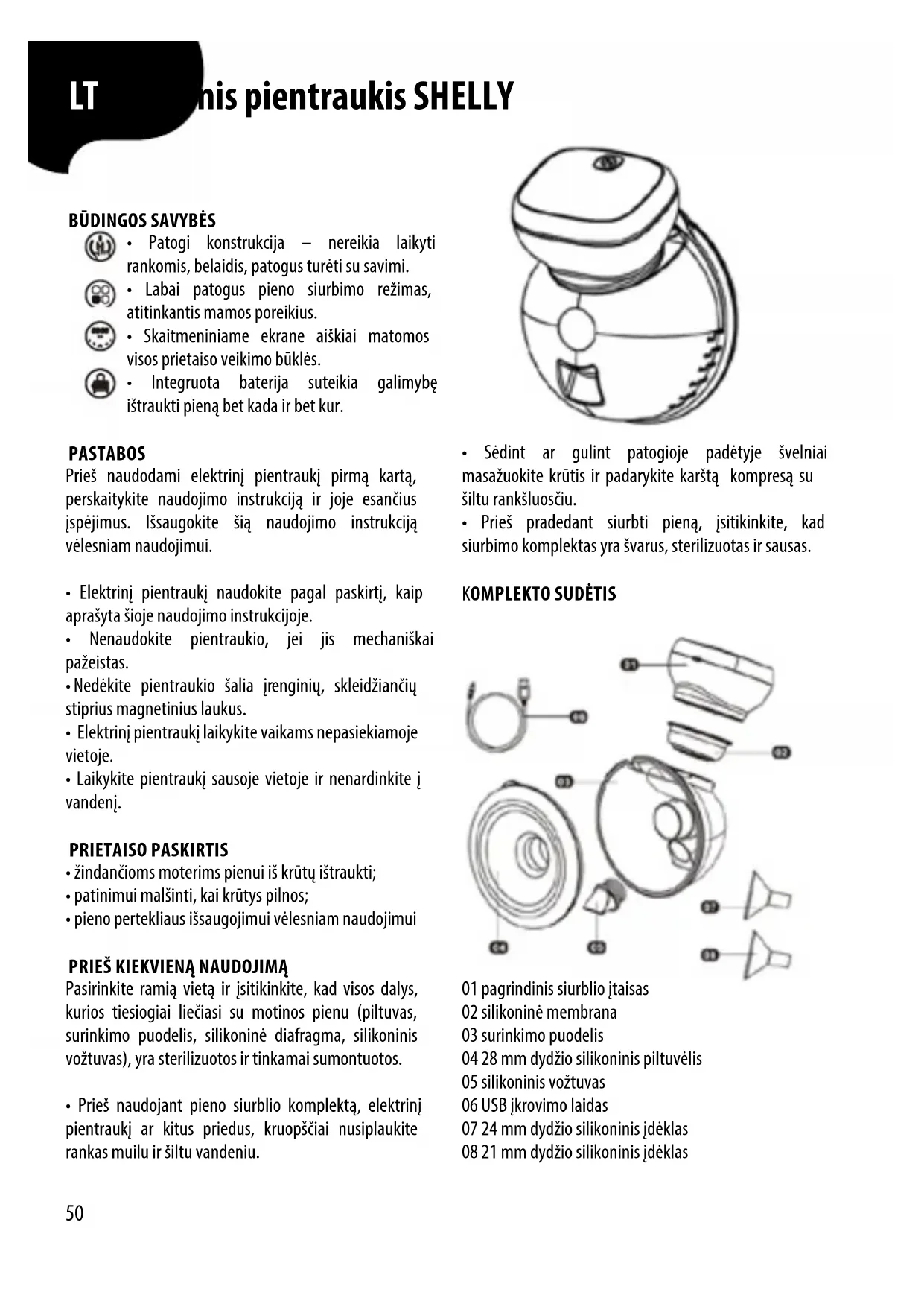 - Prieš naudojant pieno siurblio komplektą, elektrinį pientraukį ar kitus priedus, kruopščiai nusiplaukite rankas muilu ir šiltu vandeniu. LT Elektrinis pientraukis SHELLY