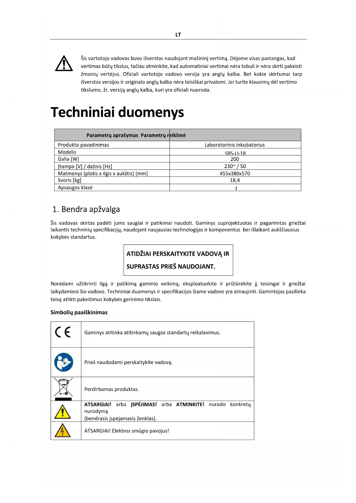 ATSARGIAI! Perskaitykite visus saugos įspėjimus ir instrukcijas. Perspėjimų ir instrukcijų nesilaikymas gali sukelti elektros smūgį, gaisrą ir (arba) rimtus sužalojimus arba mirtį. Įspėjimuose ir instrukcijose esantis terminas „prietaisas“ arba „produktas“ reiškia LABORATORINĮ INKUBATORIUS. 2.1. Elektros sauga a) Prietaiso maitinimo laido kištukas turi tilpti į elektros lizdą. Jokiu būdu nemodifikuokite kištuko. Originalūs maitinimo laido kištukai ir atitinkami maitinimo lizdai sumažina elektros smūgio riziką. b) Nelieskite įžemintų objektų, pvz., vamzdynų, radiatorių, šildytuvų ir šaldytuvų. Jei jūsų kūnas yra įžemintas ir liečiate prietaisą, veikiamą tiesioginio lietaus, šlapios grindys arba veikiant drėgnoje aplinkoje, padidėja elektros smūgio rizika. Jei į prietaisą prasiskverbia vanduo, padidėja prietaiso sugadinimo ir elektros smūgio pavojus. c) Nelieskite prietaiso šlapiomis ar drėgnomis rankomis. d) Nenaudokite maitinimo laido jokiu nenumatytu būdu. Niekada nenaudokite jo prietaisui nešti arba ištraukti kištuką iš elektros lizdo. Laikykite maitinimo laidą toliau nuo šilumos šaltinių, alyvos, aštrių briaunų ar judančių dalių. Pažeisti arba susipainioję laidai padidina elektros smūgio riziką. e) Jei negalite išvengti prietaiso naudojimo drėgnoje aplinkoje, naudokite liekamosios srovės įtaisą (RCD), kad prijungtumėte prietaisą prie elektros tinklo. RCD naudojimas sumažina elektros smūgio riziką. f) Nenaudokite prietaiso, jei maitinimo laidas yra pažeistas arba yra nusidėvėjimo požymių. Pažeistą maitinimo laidą turi pakeisti kvalifikuotas elektrikas arba gamintojo techninė tarnyba. g) Kad išvengtumėte elektros smūgio, nemerkite maitinimo laido, jo kištuko ar paties prietaiso į vandenį ar kitą skystį. Nenaudokite prietaiso ant šlapių paviršių. 2.2. Darbo vietos sauga a) Laikykite darbo vietą tvarkingą ir gerai apšviestą. b) Jei abejojate, ar prietaisas veikia, susisiekite su gamintojo technine tarnyba.LT c) Prietaiso remontą gali atlikti tik gamintojo servisas. Nebandykite taisyti gaminio patys! d) Užsidegimo ar gaisro atveju sausus miltelinius arba CO2 gesintuvus naudokite tik prietaiso gaisrui nuslopinti, jei įtampa yra elektros įtampa. e) Vaikai ar pašaliniai asmenys į darbo vietą neįleidžiami. f) Prietaisą naudokite gerai vėdinamoje patalpoje. g) Kilus pavojui sveikatai ar gyvybei, avarinei situacijai ar sugedus, išjunkite prietaisą paspausdami maitinimo jungiklį! h) Reguliariai tikrinkite saugos įspėjamųjų lipdukų būklę. Pakeiskite juos, jei jie neįskaitomi.