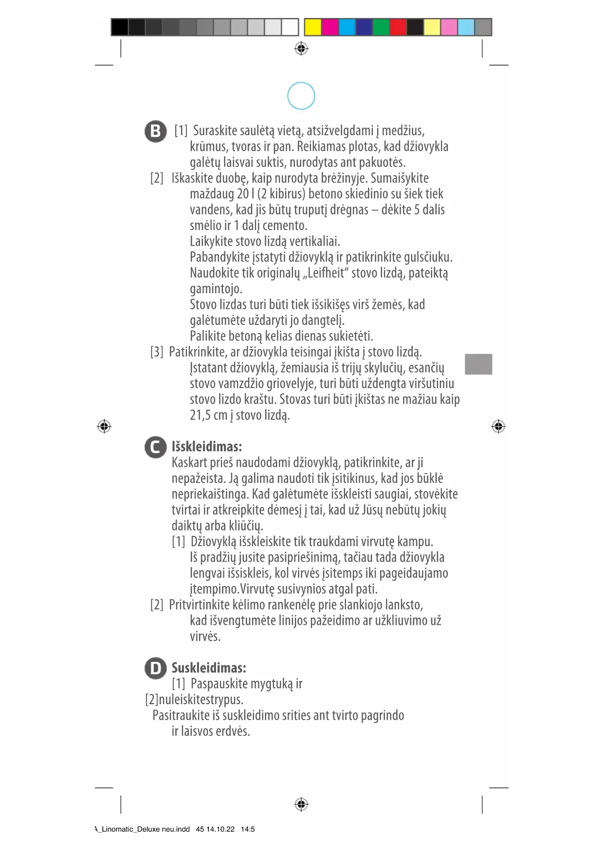 wskazówek dotyczących obsługi; W przypadku skorzystania z gwarancji rma Leifheit dokona według własnego uznania naprawy uszkodzonych części lub wymiany produktu. Jeśli nie da się dokonać naprawy, a identyczny produkt nie jest już dostępny w asortymencie w celu wymiany, klient otrzyma produkt zastępczy o jak najbardziej zbliżonej wartości. Gwarancja nie przewiduje zwrotu ceny zakupu. Gwarancja nie zapewnia również żadnych roszczeń odszkodowawczych. W celu skorzystania z gwarancji należy zwrócić się do sprzedawcy, u którego zakupiono produkt oraz przedstawić uszkodzony produkt i dowód zakupu (kopię). Niniejsza gwarancja jest ważna na całym świecie. Ustawowe prawa konsumenta, w szczególności prawa gwarancyjne, obowiązują w każdym wypadku i nie są ograniczone gwarancją. Lietuvių Gerbiamas „Leifheit“ „Linomatic“ kliente Pasirinkote kokybišką „Leifheit“rotacinę džiovyklą. Mes užtikriname, kad kiekviena „Linomatic“ džiovykla yra aukštos kokybės – jas tikriname gamybos metu, o pagamintą džiovyklą pažymime unikaliu kokybės numeriu. Šį numerį rasite ant stovo, maždaug 50 cm nuo apačios. Patariame iš karto įrašyti šį numerį į garantijos pažymėjimą. Kad „Linomatic“ džiovykla tarnautų ilgai ir kokybiškai, laikykitės priežiūros nurodymų. Atidžiai perskaitykite ir išsaugokite šią naudojimo instrukciją kartu su pirkimo kvitu. Kokybės numeris *BA_Linomatic_Deluxe neu.indd 44 14.10.22 14:56B [1] Suraskite saulėtą vietą, atsižvelgdami į medžius, krūmus, tvoras ir pan. Reikiamas plotas, kad džiovykla galėtų laisvai suktis, nurodytas ant pakuotės. [2] Iškaskite duobę, kaip nurodyta brėžinyje. Sumaišykite maždaug 20 l (2 kibirus) betono skiedinio su šiek tiek vandens, kad jis būtų truputį drėgnas – dėkite 5 dalis smėlio ir 1 dalį cemento. Laikykite stovo lizdą vertikaliai. Pabandykite įstatyti džiovyklą ir patikrinkite gulsčiuku. Naudokite tik originalų „Leifheit“ stovo lizdą, pateiktą gamintojo. Stovo lizdas turi būti tiek išsikišęs virš žemės, kad galėtumėte uždaryti jo dangtelį. Palikite betoną kelias dienas sukietėti. [3] Patikrinkite, ar džiovykla teisingai įkišta į stovo lizdą. Įstatant džiovyklą, žemiausia iš trijų skylučių, esančių stovo vamzdžio griovelyje, turi būti uždengta viršutiniu stovo lizdo kraštu. Stovas turi būti įkištas ne mažiau kaip 21,5 cm į stovo lizdą.