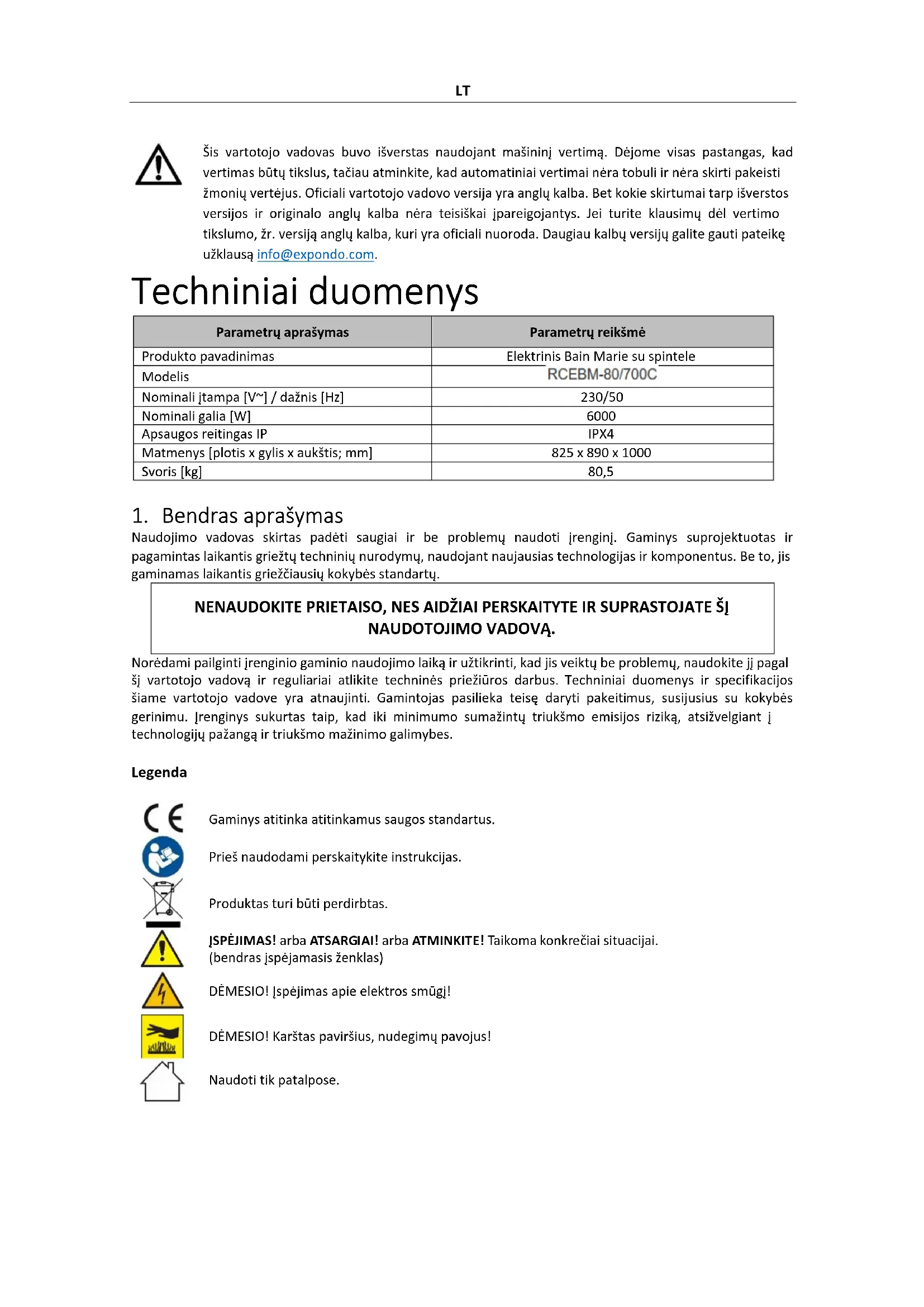 Šis vartotojo vadovas buvo išverstas naudojant mašininį vertimą. Dėjome visas pastangas, kad vertimas būtų tikslus, tačiau atminkite, kad automatiniai vertimai nėra tobuli ir nėra skirti pakeisti žmonių vertėjus. Oficiali vartotojo vadovo versija yra anglų kalba. Bet kokie skirtumai tarp išverstos versijos ir originalo anglų kalba nėra teisiškai įpareigojantys. Jei turite klausimų dėl vertimo tikslumo, žr. versiją anglų kalba, kuri yra oficiali nuoroda. Daugiau kalbų versijų galite gauti pateikę užklausą info@expondo.com. Techniniai duomenys Parametrų aprašymas Parametrų reikšmė Produkto pavadinimas Elektrinis Bain Marie su spintele Modelis