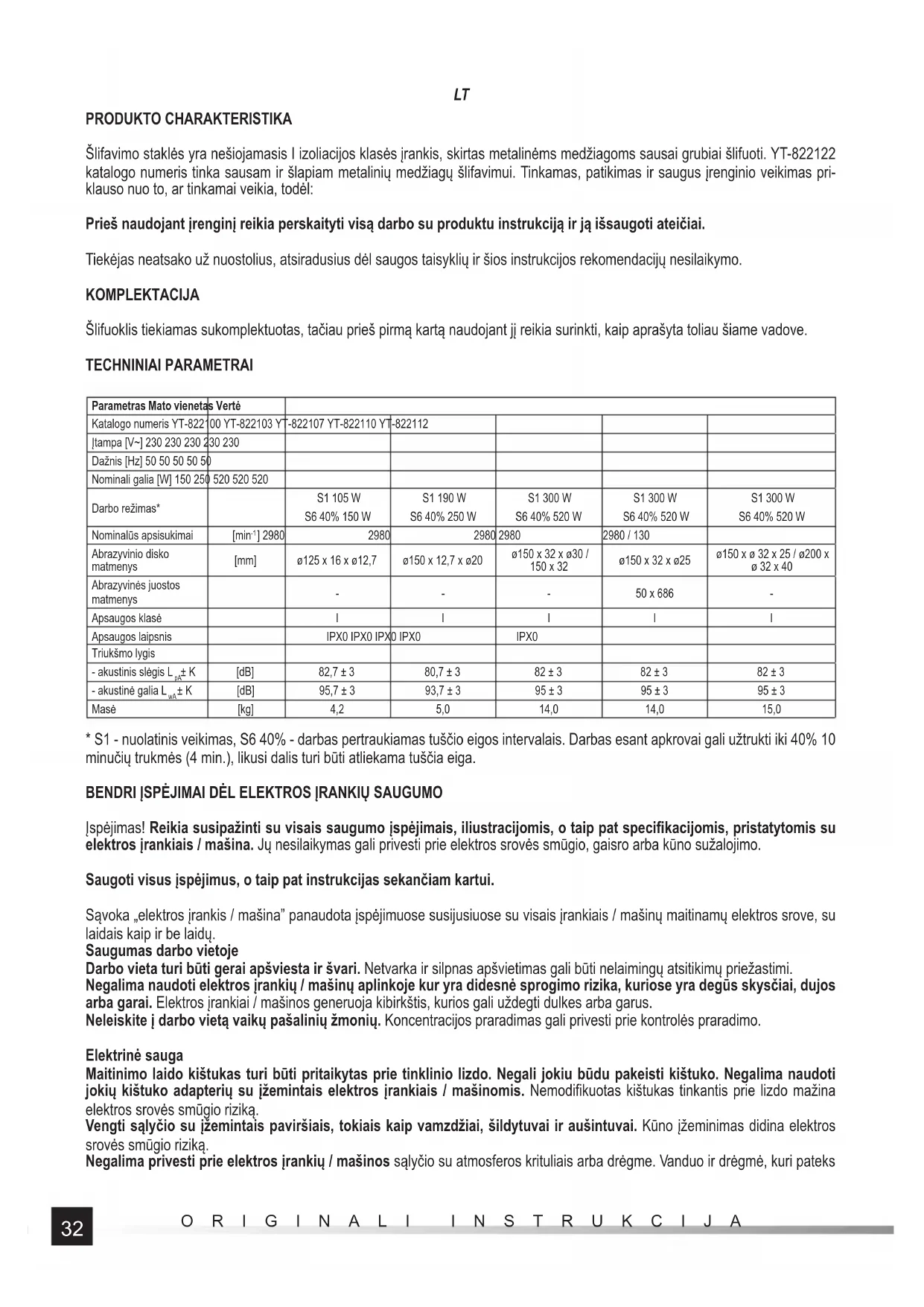 PRODUKTO CHARAKTERISTIKA Šlifavimo staklės yra nešiojamasis I izoliacijos klasės įrankis, skirtas metalinėms medžiagoms sausai grubiai šlifuoti. YT-822122 katalogo numeris tinka sausam ir šlapiam metalinių medžiagų šlifavimui. Tinkamas, patikimas ir saugus įrenginio veikimas pri- klauso nuo to, ar tinkamai veikia, todėl: Prieš naudojant įrenginį reikia perskaityti visą darbo su produktu instrukciją ir ją išsaugoti ateičiai. Tiekėjas neatsako už nuostolius, atsiradusius dėl saugos taisyklių ir šios instrukcijos rekomendacijų nesilaikymo. KOMPLEKTACIJA Šlifuoklis tiekiamas sukomplektuotas, tačiau prieš pirmą kartą naudojant jį reikia surinkti, kaip aprašyta toliau šiame vadove. TECHNINIAI PARAMETRAI Parametras Mato vienetas Vertė Katalogo numeris YT-822100 YT-822103 YT-822107 YT-822110 YT-822112 Įtampa [V~] 230 230 230 230 230 Dažnis [Hz] 50 50 50 50 50 Nominali galia [W] 150 250 520 520 520 Darbo režimas* S1 105 W S6 40% 150 W S1 190 W S6 40% 250 W S1 300 W S6 40% 520 W S1 300 W S6 40% 520 W S1 300 W S6 40% 520 W Nominalūs apsisukimai [min