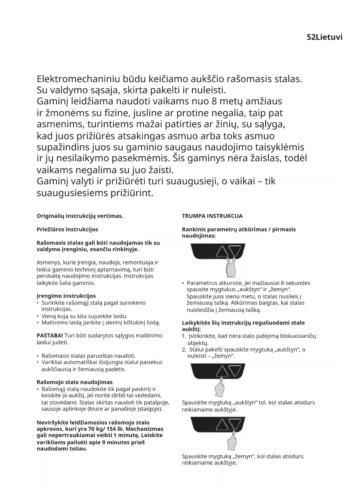 nuleisti – „žemyn“. Spauskite mygtuką „aukštyn“ tol. kol stalas atsidurs reikiamame aukštyje. Spauskite mygtuką „žemyn“, kol stalas atsidurs reikiamame aukštyje. Elektromechaniniu būdu keičiamo aukščio rašomasis stalas. Su valdymo sąsaja, skirta pakelti ir nuleisti. Gaminį leidžiama naudoti vaikams nuo 8 metų amžiaus ir žmonėms su zine, jusline ar protine negalia, taip pat asmenims, turintiems mažai patirties ar žinių, su sąlyga, kad juos prižiūrės atsakingas asmuo arba toks asmuo supažindins juos su gaminio saugaus naudojimo taisyklėmis ir jų nesilaikymo pasekmėmis. Šis gaminys nėra žaislas, todėl vaikams negalima su juo žaisti. Gaminį valyti ir prižiūrėti turi suaugusieji, o vaikai – tik suaugusiesiems prižiūrint.53 Judėjimasvisoseribose. Atleiskite mygtuką „žemyn“ žemiausiame saugiame taške, o po 5 sekundžių dar kartą nuspauskite mygtuką „žemyn“. Stalas nusileis į mechaniškai žemiausią tašką, iš kurio galės kilti. Atmintis