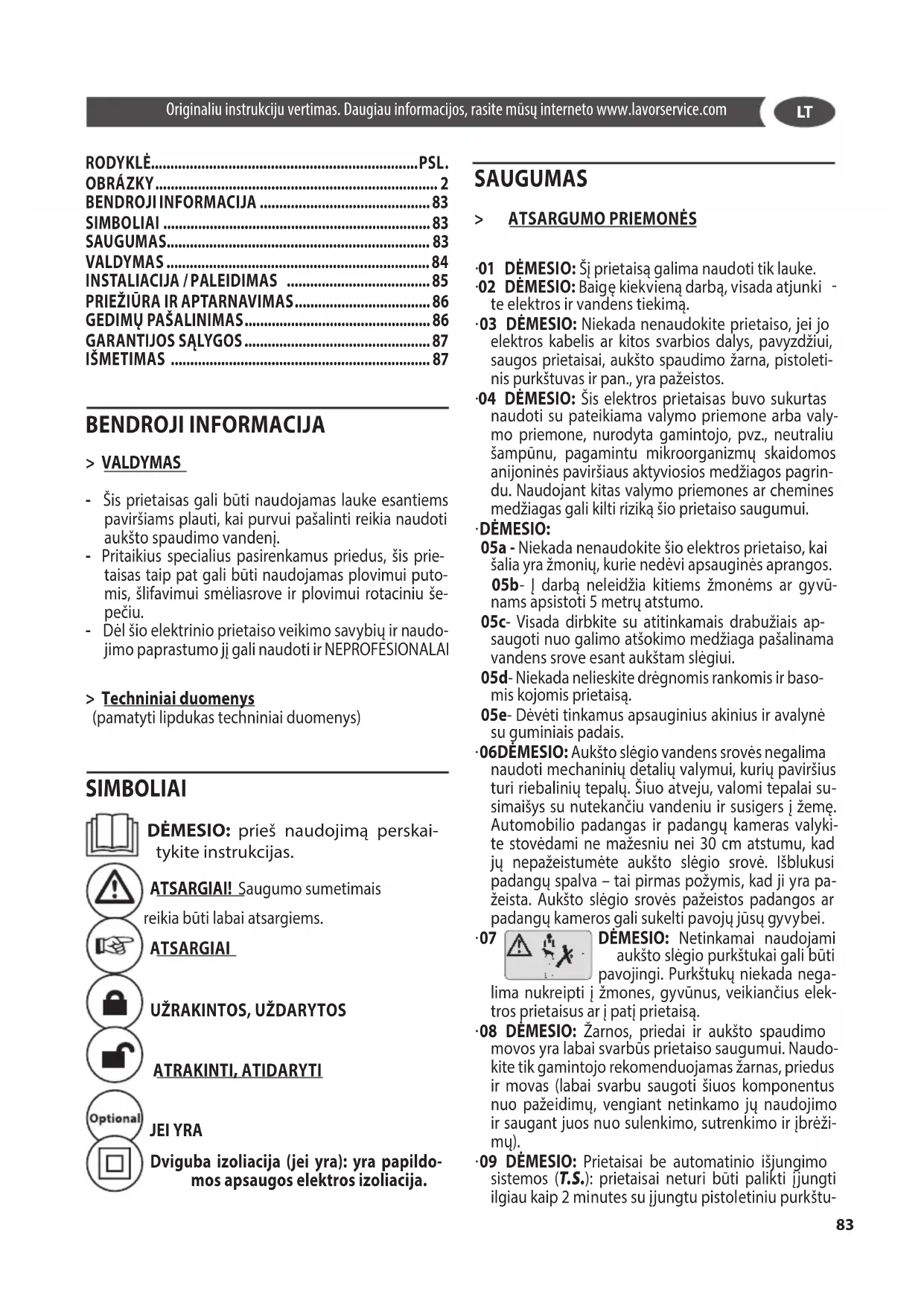 MAS, JEIGU: užsiteršė purkštukai, vožtuvai ir įrenginys nustojo veikti dėl susidariusių kalkinių apnašų, sugadin- tos kitos įrenginio dalys (pvz.: sulankstyta aukšto slėgio žarna), įrenginys tinkamai veikia. IŠMETIMAS Įstatymas (remiantis ES direktyva 2012/19/EU dėl elektros ir elektroninės įrangos (EEĮ) atliekų bei nacionaliniais ES valstybių narių, įgyvendi- nusių minėtą direktyvą, įstatymais) elektros ar elektronikos prietaisų savininkams draudžia išmesti šį gaminį ar jo elektros / elektronikos priedus kaip kietą- sias buitines (komunalines) atliekas. EEĮ atliekas privalo- ma pristatyti į specialius atliekų surinkimo centrus. EEĮ atliekas taip pat galima grąžinti gamintojui perkant naują gaminį, atitinkantį išmetamą prietaisą. Jei EEĮ bus išmetama į aplinką, gali kilti rimtas pavojus aplinkai ir žmogaus sveikatai. Paveikslėlyje pateiktas komunalinių atliekų konteinerio simbolis, griežtai draudžiama iš- mesti įrenginį į tokius konteinerius. Tuo atveju, jei ne- bus laikomasi direktyvos 2012/19/EU nurodymų bei atitinkamų ES valstybių narių taikymo dekretų, bus ski- riamos administracinės sankcijosOriģinālo instrukciju tulkojums. Lai iegūtu papildu informāciju, apmeklējiet mūsu vietni www.lavorservice.com