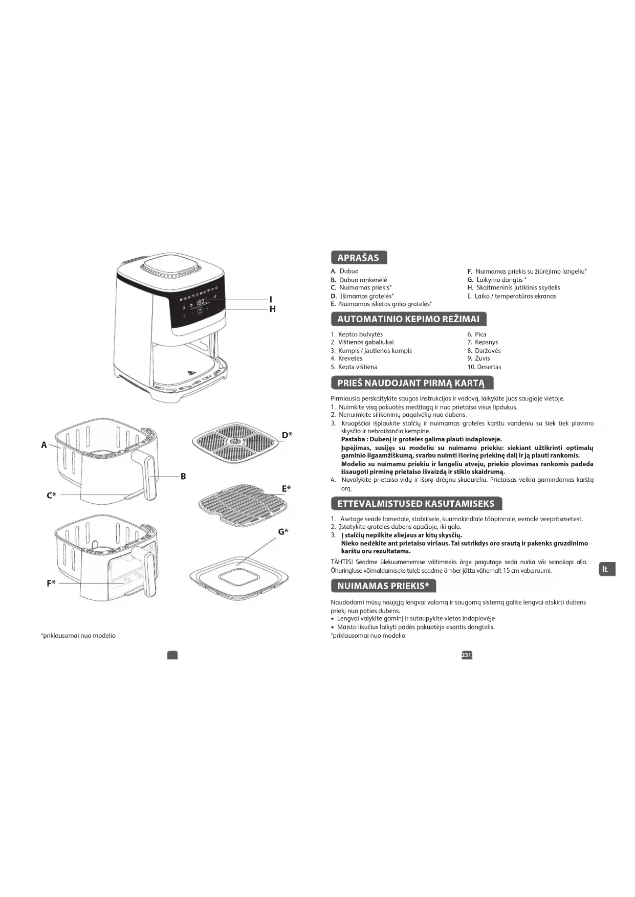 *priklausomai nuo modelio APRAŠAS A. Dubuo B. Dubuo rankenėlė C. Nuimamas priekis* D. Išimamos grotelės* E. Nuimamos išlietos grilio grotelės* F. Nuimamas priekis su žiūrėjimo langeliu* G. Laikymo dangtis * H. Skaitmeninis jutiklinis skydelis