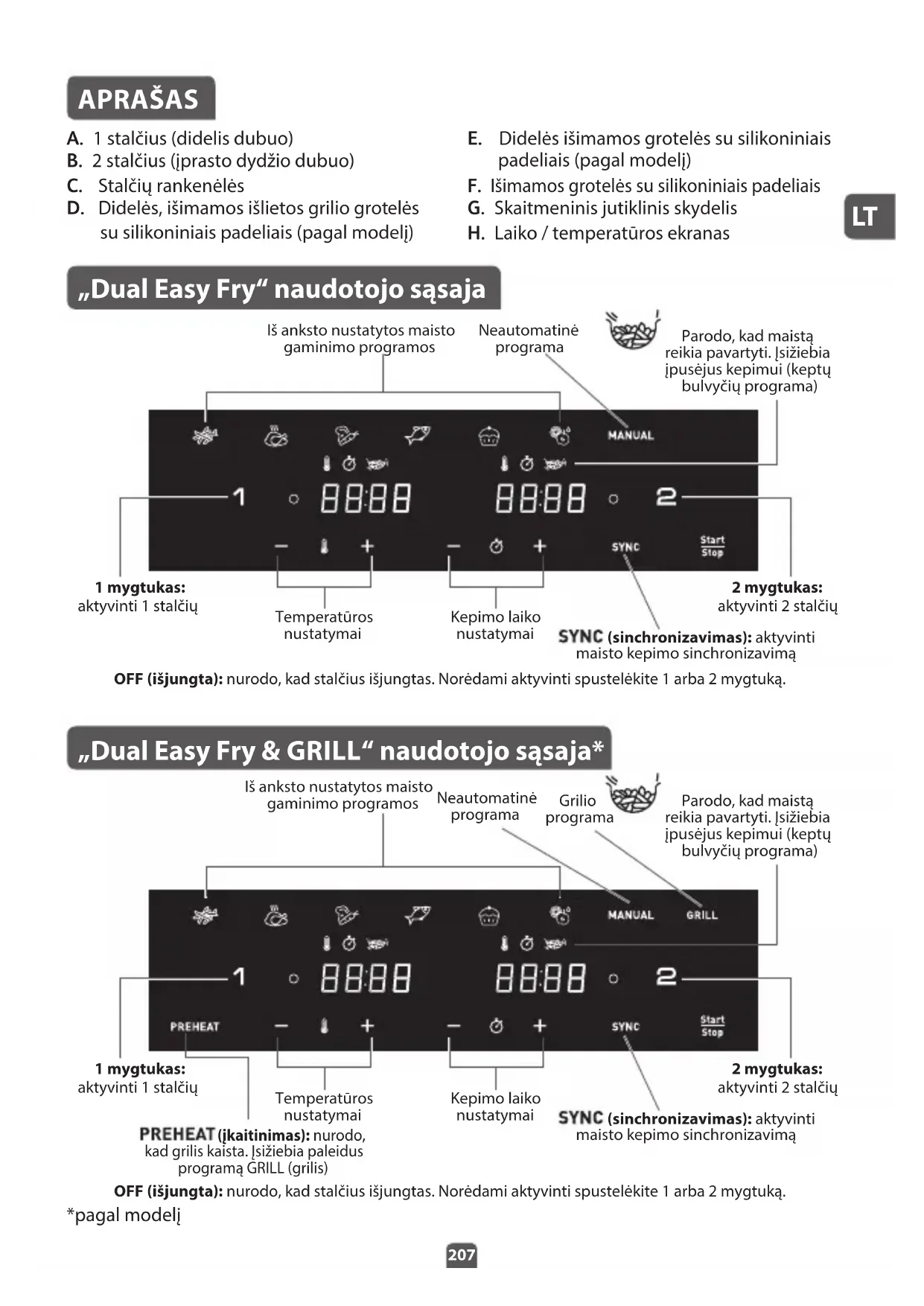 APRAŠAS A. 1 stalčius (didelis dubuo) B. 2 stalčius (įprasto dydžio dubuo) C. Stalčių rankenėlės D. Didelės, išimamos išlietos grilio grotelės su silikoniniais padeliais (pagal modelį) E. Didelės išimamos grotelės su silikoniniais padeliais (pagal modelį) F. Išimamos grotelės su silikoniniais padeliais G. Skaitmeninis jutiklinis skydelis H. Laiko / temperatūros ekranas „Dual Easy Fry“ naudotojo sąsaja „Dual Easy Fry & GRILL“ naudotojo sąsaja* OFF (išjungta): nurodo, kad stalčius išjungtas. Norėdami aktyvinti spustelėkite 1 arba 2 mygtuką. (įkaitinimas): nurodo, kad grilis kaista. Įsižiebia paleidus programą GRILL (grilis) *pagal modelį Iš anksto nustatytos maisto gaminimo programos Parodo, kad maistą reikia pavartyti. Įsižiebia įpusėjus kepimui (keptų bulvyčių programa) Neautomatinė programa (sinchronizavimas): aktyvinti maisto kepimo sinchronizavimą Temperatūros nustatymai Kepimo laiko nustatymai 1 mygtukas: aktyvinti 1 stalčių 2 mygtukas: aktyvinti 2 stalčių Iš anksto nustatytos maisto gaminimo programos Parodo, kad maistą reikia pavartyti. Įsižiebia įpusėjus kepimui (keptų bulvyčių programa) Neautomatinė programa Grilio programa OFF (išjungta): nurodo, kad stalčius išjungtas. Norėdami aktyvinti spustelėkite 1 arba 2 mygtuką. (sinchronizavimas): aktyvinti maisto kepimo sinchronizavimą Temperatūros nustatymai Kepimo laiko nustatymai 1 mygtukas: aktyvinti 1 stalčių 2 mygtukas: aktyvinti 2 stalčiųLT