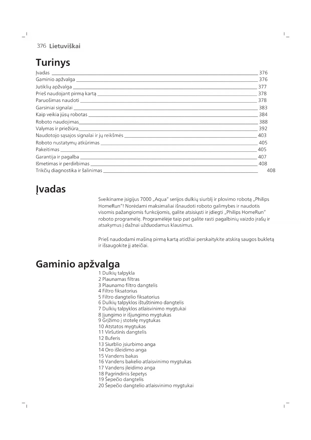 Lietuviškai Turinys Įvadas ____________________________________________________________________________________ 376 Gaminio apžvalga __________________________________________________________________________ 376 Jutiklių apžvalga ___________________________________________________________________________ 377 Prieš naudojant pirmą kartą _________________________________________________________________ 378 Paruošimas naudoti ________________________________________________________________________ 378 Garsiniai signalai ___________________________________________________________________________ 383 Kaip veikia jūsų robotas _____________________________________________________________________ 384 Roboto naudojimas_________________________________________________________________________ 388 Valymas ir priežiūra_________________________________________________________________________ 392 Naudotojo sąsajos signalai ir jų reikšmės ______________________________________________________ 403 Roboto nustatymų atkūrimas ________________________________________________________________ 405 Pakeitimas ________________________________________________________________________________ 405 Garantija ir pagalba ________________________________________________________________________ 407 Išmetimas ir perdirbimas ____________________________________________________________________ 408 Trikčių diagnostika ir šalinimas _______________________________________________________________ 408 Įvadas Sveikiname įsigijus 7000 „Aqua“ serijos dulkių siurblį ir plovimo robotą „Philips HomeRun“! Norėdami maksimaliai išnaudoti roboto galimybes ir naudotis visomis pažangiomis funkcijomis, galite atsisiųsti ir įdiegti „Philips HomeRun“ roboto programėlę. Programėlėje taip pat galite rasti pagalbinių vaizdo įrašų ir atsakymus į dažnai užduodamus klausimus. Prieš naudodami mašiną pirmą kartą atidžiai perskaitykite atskirą saugos bukletą ir išsaugokite jį ateičiai. Gaminio apžvalga 1 Dulkių talpykla 2 Plaunamasfiltras 3 Plaunamo filtro dangtelis 4 Filtro fiksatorius 5 Filtro dangtelio fiksatorius 6 Dulkių talpyklos ištuštinimo dangtelis 7 Dulkių talpyklos atlaisvinimo mygtukai 8 Įjungimo ir išjungimo mygtukas 9 Grįžimo į stotelę mygtukas 10 Atstatos mygtukas 11 Viršutinis dangtelis 12 Buferis 13 Siurblio įsiurbimo anga 14 Oro išleidimo anga 15 Vandens bakas 16 Vandens bakelio atlaisvinimo mygtukas 17 Vandens įleidimo anga 18 Pagrindinis šepetys 19 Šepečio dangtelis 20 Šepečio dangtelio atlaisvinimo mygtukai377 Lietuviškai 21 Pagrindiniai ratukai 22 Priekinis ratukas 23 Kontaktinės įkrovimo vietos (roboto) 24 Šoninis šepetys 25 Šluostės laikiklis 26 Plaunama šluostė (2 vnt.) 27 Maitinimo laidas (XU7000) 28 (Įkrovimo) stotelė (XU7000) 29 IR signalo langelis (XU7000) 30 Kontaktinės įkrovimo vietos (stotelės) 31 Maitinimo laido lizdas 32 Kilimėlis (XU7000) 33 Dulkių maišelis (2 vnt.) (XU7100) 34 Talpyklos dangtelis 35 Dulkių maišelio skyrius 36 Automatinio ištuštinimo stotelė (XU7100) 37 Šviesos diodų indikatoriaus lemputė 38 IR signalo langelis 39 Rampa 40 Automatinio ištuštinimo įleidimo anga 41 Automatinio ištuštinimo oro išleidimo anga 42 Kontaktinės įkrovimo vietos (stotelės) 43 Išmetimo anga 44 Šepečio valymo įrankis 45 Maitinimo laido lizdas 46 Maitinimo laidas (XU7100) Jutiklių apžvalga