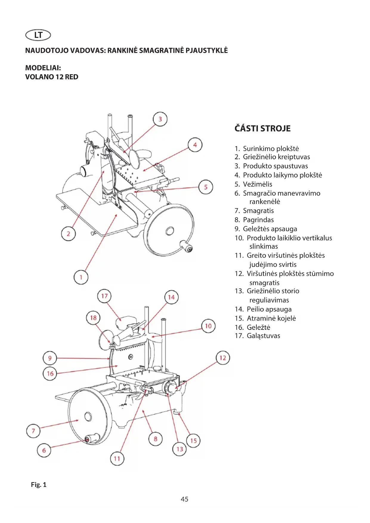 !49 - neleistino prietaiso modikavi- mo ir/ arba taisymo; - neoriginalių priedų ir atsargi- nių dalių naudojimo; - išimtinių įvykių. Prietaiso nuosavybės perdavi- mas automatiškai panaikina ga- mintojo atsakomybę dėl pjaus- tyklės. Identikacinėje plokštelėje nu- rodytas gamintojas, prietaisas, techninė informacija.50 TECHNINĖ INFORMACIJA SPECIFIKACIJOS Pjovimo apvalia forma pajėgumas 210 mm 215 mm Pjovimo stačiakampe forma pajėgumas 270x210 mm 280x215 mm Maksimalus griežinėlio storis 1,5 mm 1,5 mm Peilio skersmuo 300 mm 319 mm Svoris 44 Kg 53 kg VOLANO 12 RED51 HANDLEIDING: HANDSNIJMACHINE MODELLEN: VOLANO 12 RED ONDERDELEN