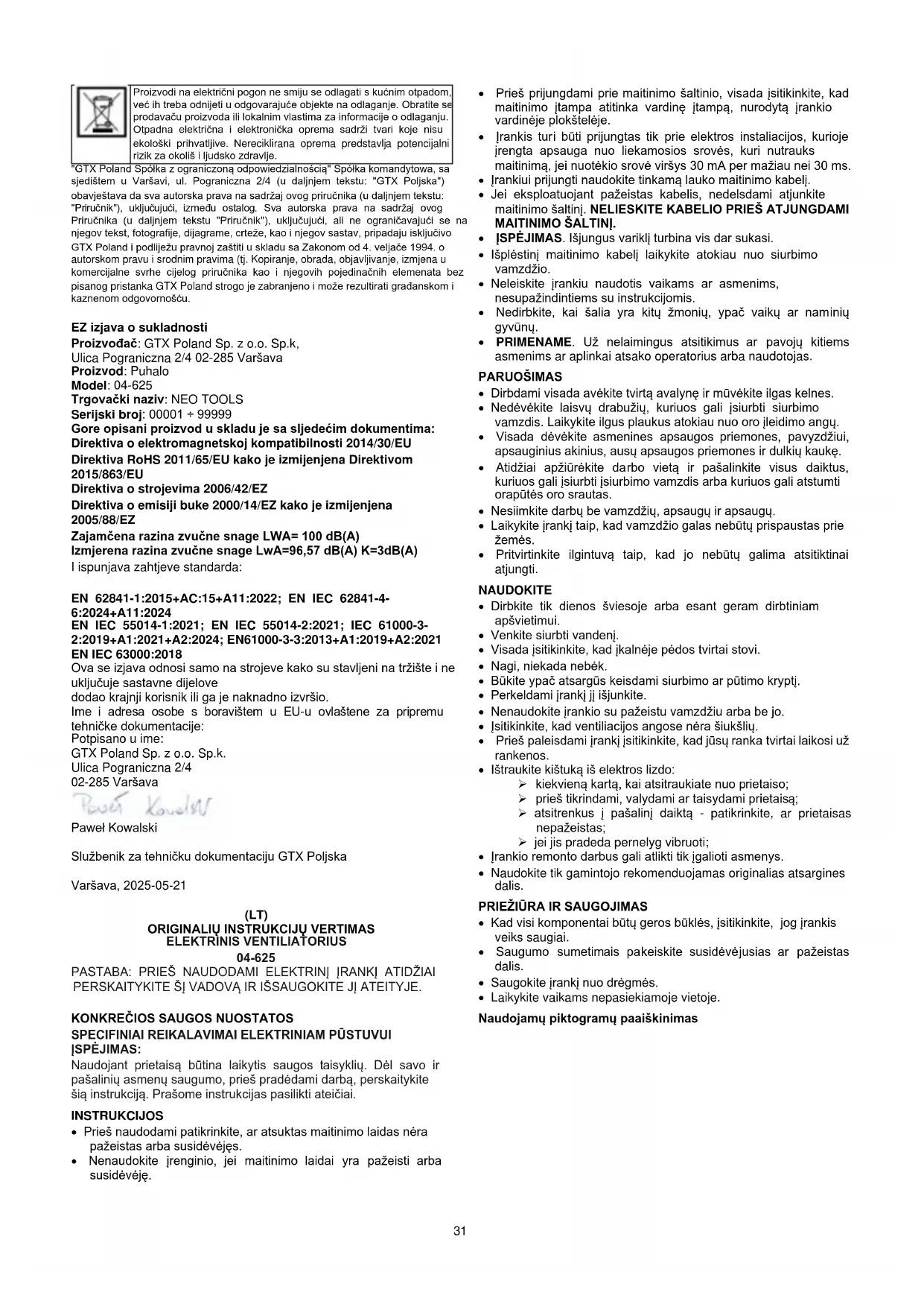 Elektra varomų gaminių negalima išmesti kartu su buitinėmis atliekomis, juos reikia pristatyti į atitinkamas utilizavimo vietas. Dėl informacijos apie šalinimą kreipkitės į gaminio pardavėją arba vietos valdžios instituciją. Elektros ir elektroninės įrangos atliekose yra medžiagų, kurios nėra nekenksmingos aplinkai. Neperdirbta įranga kelia potencialų pavojų aplinkai ir žmonių sveikatai. "GTX Poland Spółka z ograniczoną odpowiedzialnością" Spółka komandytowa, , kurios registruota buveinė yra Varšuvoje, ul. Pograniczna 2/4 (toliau - "GTX Lenkija "), informuoja, kad visos autorių teisės į šio vadovo (toliau - "Vadovas") turinį, įskaitant, be kita ko. Visos autorių teisės į šio vadovo (toliau - Vadovas) turinį, įskaitant, bet neapsiribojant, jo tekstą, nuotraukas, diagramas, brėžinius, taip pat jo kompoziciją, priklauso tik GTX Poland ir yra teisinės apsaugos objektas pagal 1994 m. vasario 4 d. Autorių teisių ir gretutinių teisių įstatymą (t. y. 2006 m. Įstatymų leidinio Nr. 90, 631 punktas su pakeitimais). Kopijuoti, apdoroti, publikuoti, keisti komerciniais tikslais visą vadovą ir atskirus jo elementus be raštiško "GTX Polska" sutikimo yra griežtai draudžiama ir gali užtraukti civilinę ir baudžiamąją atsakomybę. EB atitikties deklaracija Gamintojas: GTX Poland Sp. z o.o. Sp.k. Pograniczna gatvė 2/4 02-285 Varšuva Produktas: Dūmtraukis Modelis: 04-625 Prekybos pavadinimas: NEO TOOLS Serijos numeris: 00001 ÷ 99999 Pirmiau aprašytas gaminys atitinka šiuos dokumentus: Elektromagnetinio suderinamumo direktyva 2014/30/ES RoHS direktyva 2011/65/ES su pakeitimais, padarytais Direktyva 2015/863/ES Mašinų direktyva 2006/42/EB Triukšmo emisijos direktyva 2000/14/EB su pakeitimais, padarytais 2005/88/EB Garantuotas garso galios lygis LWA= 100 dB(A) Išmatuotas garso galios lygis LwA=96,57 dB(A) K=3dB(A) Ir atitinka standartų reikalavimus: EN 62841-1:2015+AC:15+A11:2022; EN IEC 62841-4- 6:2024+A11:2024 EN IEC 55014-1:2021; EN IEC 55014-2:2021; IEC 61000-3- 2:2019+A1:2021+A2:2024; EN61000-3-3:2013+A1:2019+A2:2021 EN IEC 63000:2018 Ši deklaracija taikoma tik tokioms mašinoms, kokios jos pateikiamos į rinką, ir neapima sudedamųjų dalių. prideda galutinis naudotojas arba atlieka vėliau. ES reziduojančio asmens, įgalioto rengti techninę dokumentaciją, vardas, pavardė ir adresas: Pasirašyta: GTX Poland Sp. z o.o. Sp.k. Pograniczna gatvė 2/4 02-285 Varšuva Paweł Kowalski Techninės dokumentacijos specialistas GTX Lenkija Varšuva, 2025-05-21 (LV)