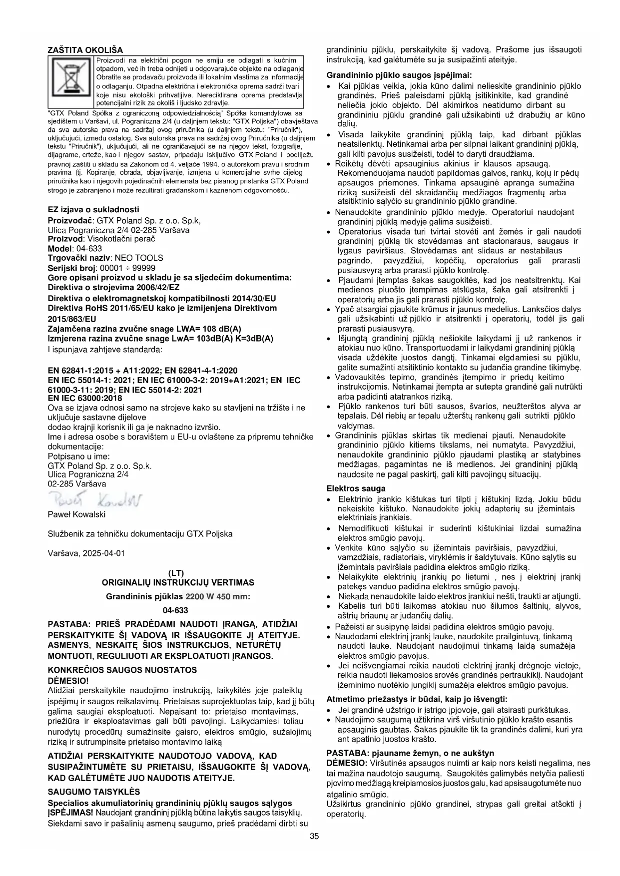 Elektra varomų gaminių negalima išmesti kartu su buitinėmis atliekomis, juos reikia pristatyti į atitinkamas utilizavimo vietas. Dėl informacijos apie šalinimą kreipkitės į gaminio pardavėją arba vietos valdžios instituciją. Elektros ir elektroninės įrangos atliekose yra medžiagų, kurios nėra nekenksmingos aplinkai. Neperdirbta įranga kelia potencialų pavojų aplinkai ir žmonių sveikatai. "GTX Poland Spółka z ograniczoną odpowiedzialnością" "Spółka komandytowa", kurios registruota buveinė yra Varšuvoje, ul. Pograniczna 2/4 (toliau - "GTX Poland") informuoja, kad visos autorių teisės į šio vadovo (toliau - "Vadovas") turinį, įskaitant, be kita ko. Visos autorių teisės į šio vadovo (toliau - Vadovas) turinį, įskaitant, bet neapsiribojant, jo tekstą, nuotraukas, diagramas, brėžinius, taip pat jo kompoziciją, priklauso tik GTX Poland ir yra teisinės apsaugos objektas pagal 1994 m. vasario 4 d. Autorių teisių ir gretutinių teisių įstatymą (t. y. 2006 m. Įstatymų leidinio Nr. 90, 631 punktas su pakeitimais). Kopijuoti, apdoroti, publikuoti, keisti komerciniais tikslais visą vadovą ir atskirus jo elementus be raštiško "GTX Polska" sutikimo yra griežtai draudžiama ir gali užtraukti civilinę ir baudžiamąją atsakomybę. EB atitikties deklaracija Gamintojas: GTX Poland Sp. z o.o. Sp.k. Pograniczna gatvė 2/4 02-285 Varšuva Produktas: Slėginis plovimo įrenginys Modelis: 04-633 Prekybos pavadinimas: NEO TOOLS Serijos numeris: 00001 ÷ 99999 Pirmiau aprašytas gaminys atitinka šiuos dokumentus: Mašinų direktyva 2006/42/EB Elektromagnetinio suderinamumo direktyva 2014/30/ES RoHS direktyva 2011/65/ES su pakeitimais, padarytais Direktyva 2015/863/ES Garantuotas garso galios lygis LWA= 108 dB(A) Išmatuotas garso galios lygis LwA= 103dB(A) K=3dB(A) Ir atitinka standartų reikalavimus: EN 62841-1:2015 + A11:2022; EN 62841-4-1:2020 EN IEC 55014-1: 2021; EN IEC 61000-3-2: 2019+A1:2021; EN IEC