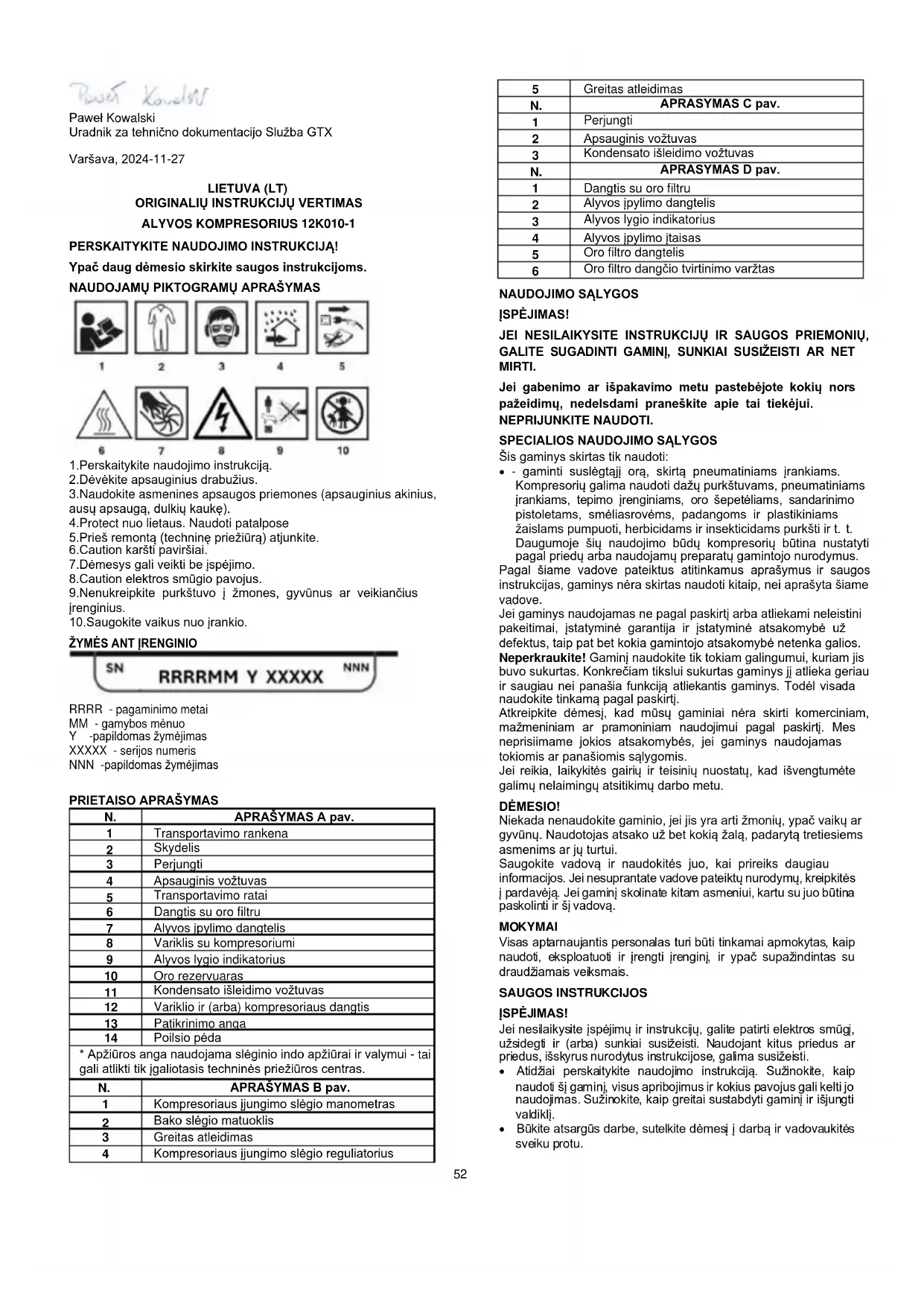 Elektra varomų gaminių negalima išmesti kartu su buitinėmis atliekomis, juos reikia pristatyti į atitinkamas utilizavimo vietas. Dėl informacijos apie šalinimą kreipkitės į gaminio pardavėją arba vietos valdžios instituciją. Elektros ir elektroninės įrangos atliekose yra medžiagų, kurios nėra nekenksmingos aplinkai. Neperdirbta įranga kelia potencialų pavojų aplinkai ir žmonių sveikatai. "GTX Poland Spółka z ograniczoną odpowiedzialnością" "Spółka komandytowa", kurios registruota buveinė yra Varšuvoje, ul. Pograniczna 2/4 (toliau - "GTX Poland ") informuoja, kad visos autorių teisės į šio vadovo (toliau - "Vadovas") turinį, įskaitant, be kita ko. Visos autorių teisės į šio vadovo (toliau - Vadovas) turinį, įskaitant, bet neapsiribojant, jo tekstą, nuotraukas, diagramas, brėžinius, taip pat jo kompoziciją, priklauso tik GTX Poland ir yra teisinės apsaugos objektas pagal 1994 m. vasario 4 d. Autorių teisių ir gretutinių teisių įstatymą (t. y. 2006 m. Įstatymų leidinio Nr. 90, 631 punktas su pakeitimais). Kopijuoti, apdoroti, publikuoti, keisti komerciniais tikslais visą vadovą ir atskirus jo elementus be raštiško "GTX Polska" sutikimo yra griežtai draudžiama ir gali užtraukti civilinę ir baudžiamąją atsakomybę. EB atitikties deklaracija Gamintojas: Sp.k, Pograniczna gatvė 2/4 02-285 Varšuva Produktas: Kompresorius Modelis: 12K010-1 Prekybos pavadinimas: NEO TOOLS Serijos numeris: 00001 ÷ 99999 Pirmiau aprašytas gaminys atitinka šiuos dokumentus: Mašinų direktyva 2006/42/EB Elektromagnetinio suderinamumo direktyva 2014/30/ES RoHS direktyva 2011/65/ES su pakeitimais, padarytais Direktyva 2015/863/ES Triukšmo emisijos direktyva 2000/14/EB su pakeitimais, padarytais Direktyva 2005/88/EB Garantuotas garso galios lygis LWA = 97 dB(A) Išmatuotas garso galios lygis LWA = 95,5 dB(A) K=1,93 dB(A) Ir atitinka standartų reikalavimus: EN 62841-1:2015; EN 62841-2-2:2014; EN IEC 61000-6-1:2019; EN IEC 61000-6-3:2021 EN IEC 63000:2018 EN 286-1: 1998/A2:2005 Ši deklaracija taikoma tik tokioms mašinoms, kokios jos pateikiamos į rinką, ir neapima sudedamųjų dalių. prideda galutinis naudotojas arba atlieka vėliau. ES reziduojančio asmens, įgalioto rengti techninę dokumentaciją, vardas, pavardė ir adresas: Pasirašyta: GTX Poland Sp. z o.o. Sp.k. Pograniczna gatvė 2/4 02-285 Varšuva Paweł Kowalski Techninės dokumentacijos pareigūnas GTX tarnyba Varšuva, 2024-11-27 LATVIJA (LV)
