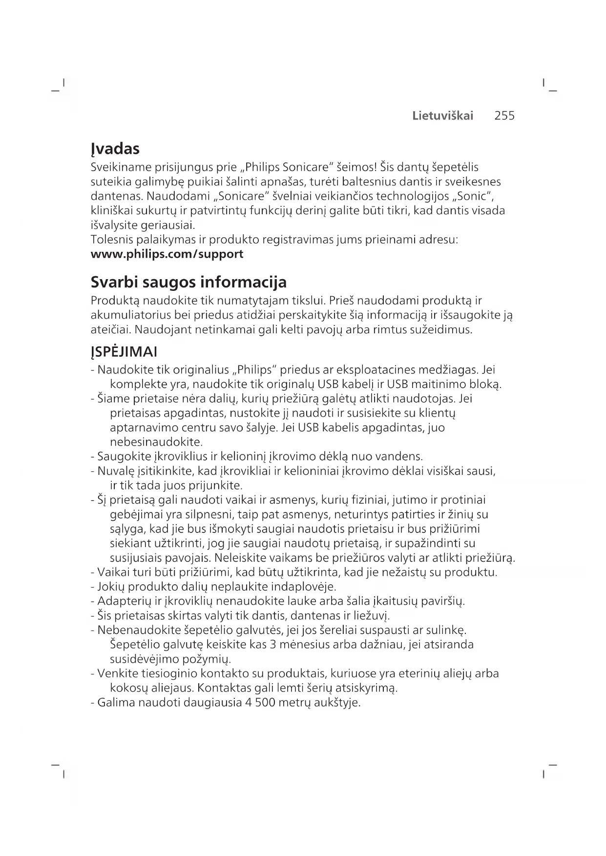 Lietuviškai Įvadas Sveikiname prisijungus prie „Philips Sonicare“ šeimos! Šis dantų šepetėlis suteikia galimybę puikiai šalinti apnašas, turėti baltesnius dantis ir sveikesnes dantenas. Naudodami „Sonicare“ švelniai veikiančios technologijos „Sonic“, kliniškai sukurtų ir patvirtintų funkcijų derinį galite būti tikri, kad dantis visada išvalysite geriausiai. Tolesnis palaikymas ir produkto registravimas jums prieinami adresu: www.philips.com/support Svarbi saugos informacija Produktą naudokite tik numatytajam tikslui. Prieš naudodami produktą ir akumuliatorius bei priedus atidžiai perskaitykite šią informaciją ir išsaugokite ją ateičiai. Naudojant netinkamai gali kelti pavojų arba rimtus sužeidimus. ĮSPĖJIMAI - Naudokite tik originalius „Philips“ priedus ar eksploatacines medžiagas. Jei komplekte yra, naudokite tik originalų USB kabelį ir USB maitinimo bloką. - Šiame prietaise nėra dalių, kurių priežiūrą galėtų atlikti naudotojas. Jei prietaisas apgadintas, nustokite jį naudoti ir susisiekite su klientų aptarnavimo centru savo šalyje. Jei USB kabelis apgadintas, juo nebesinaudokite. - Saugokite įkroviklius ir kelioninį įkrovimo dėklą nuo vandens. - Nuvalę įsitikinkite, kad įkrovikliai ir kelioniniai įkrovimo dėklai visiškai sausi, ir tik tada juos prijunkite. - Šį prietaisą gali naudoti vaikai ir asmenys, kurių fiziniai, jutimo ir protiniai gebėjimai yra silpnesni, taip pat asmenys, neturintys patirties ir žinių su sąlyga, kad jie bus išmokyti saugiai naudotis prietaisu ir bus prižiūrimi siekiant užtikrinti, jog jie saugiai naudotų prietaisą, ir supažindinti su susijusiais pavojais. Neleiskite vaikams be priežiūros valyti ar atlikti priežiūrą. - Vaikai turi būti prižiūrimi, kad būtų užtikrinta, kad jie nežaistų su produktu. - Jokių produkto dalių neplaukite indaplovėje. - Adapterių ir įkroviklių nenaudokite lauke arba šalia įkaitusių paviršių. - Šis prietaisas skirtas valyti tik dantis, dantenas ir liežuvį. - Nebenaudokite šepetėlio galvutės, jei jos šereliai suspausti ar sulinkę. Šepetėlio galvutę keiskite kas 3 mėnesius arba dažniau, jei atsiranda susidėvėjimo požymių. - Venkite tiesioginio kontakto su produktais, kuriuose yra eterinių aliejų arba kokosų aliejaus. Kontaktas gali lemti šerių atsiskyrimą. - Galima naudoti daugiausia 4500 metrų aukštyje.256 Lietuviškai