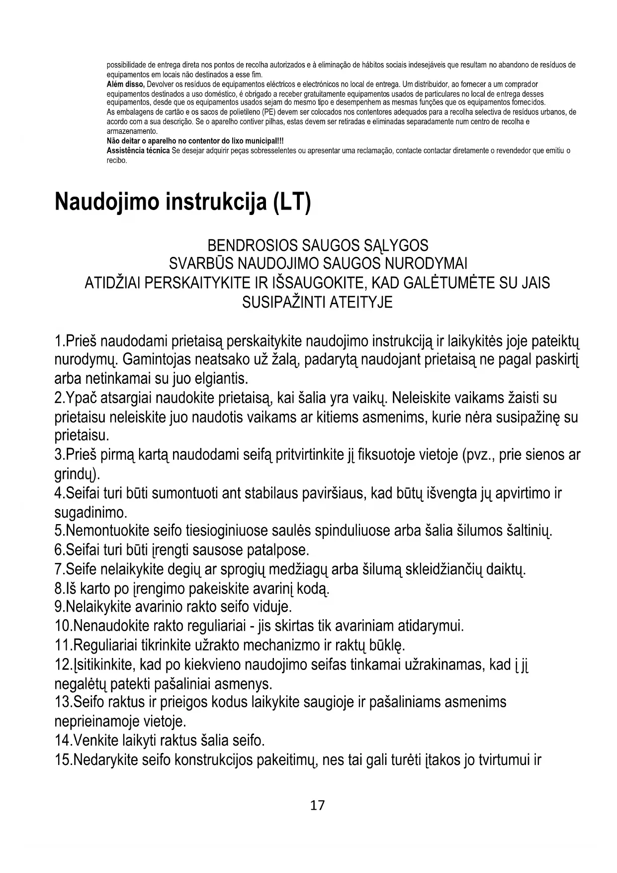 -Visada pakeiskite numatytąjį avarinį kodą iš karto po įdiegimo.19 -Nelaikykite rakto seifo viduje. -Paspauskite mygtuką CLEAR (*), kad ištrintumėte įvestą neteisingą kodą. -Po 4 neteisingų kodo bandymų seifas užsirakina 5 minutėms. Pasirodys pranešimas ("HOLD-5"). Išėmimo, baterijų keitimo būdas: Atidarykite talpyklą, išimkite panaudotas baterijas. Norėdami teisingai įdėti naujas baterijas, ypač atkreipkite dėmesį į poliškumą (+) pliusas ir (-) . Akumuliatorių dėžutės viduje arba aplink ją yra grafinis simbolis, kuris parodo, kaip teisingai įdėti baterijas į dėžutę, tada uždarykite baterijų dėžutę. Svarbi saugos informacija Netinkamai naudojant akumuliatorius gali ištekėti elektrolitas, jie gali perkaisti arba sprogti. Išsiliejęs elektrolitas yra korozijos šaltinis ir gali būti toksiškas. Jis gali sukelti odos ir akių nudegimus; taip pat kenksmingas jį prarijus. Norėdami sumažinti susižalojimo riziką: -Laikykite baterijas vaikams nepasiekiamoje vietoje. -Baterijų negalima kaitinti, atidaryti, pradurti, sunaikinti ar mesti į ugnį, taip pat jų negalima į prietaisą įdėti atvirkščiai. Ypatingą dėmesį atkreipkite į [+] ir [-] ženklus. -Nenaudokite vienu metu senų ir naujų baterijų arba skirtingų tipų baterijų ( pavyzdžiui, anglinių-cinko ir šarminių). -Nelieskite prietaiso baterijų gnybtų metaliniais daiktais. Šie komponentai gali įkaisti ir sukelti nudegimus. -Išimkite baterijas iš prietaiso, jei jos nusidėvėjo arba jei prietaisas bus ilgai laikomas. -Senas išsekusias arba panaudotas baterijas reikia išimti iš prietaiso ir išmesti arba perdirbti pagal nacionalines atliekų šalinimo taisykles. -Akumuliatoriams ištekėjus, išimkite visus akumuliatorius, vengdami ištekėjusio elektrolito sąlyčio su oda ar drabužiais. Jei akumuliatoriaus elektrolitas patenka ant odos ar drabužių, nedelsdami nuplaukite tą vietą vandeniu. Prieš įdėdami naujas baterijas, kruopščiai išvalykite baterijų skyrių drėgnu popieriniu rankšluosčiu. PASTABA -Pakeitus netinkamo tipo baterijas, gali įvykti sprogimas. Naudokite tik to paties dydžio ir tipo baterijas. -Neįkraukite paprastų baterijų ! TECHNINIAI DUOMENYS: