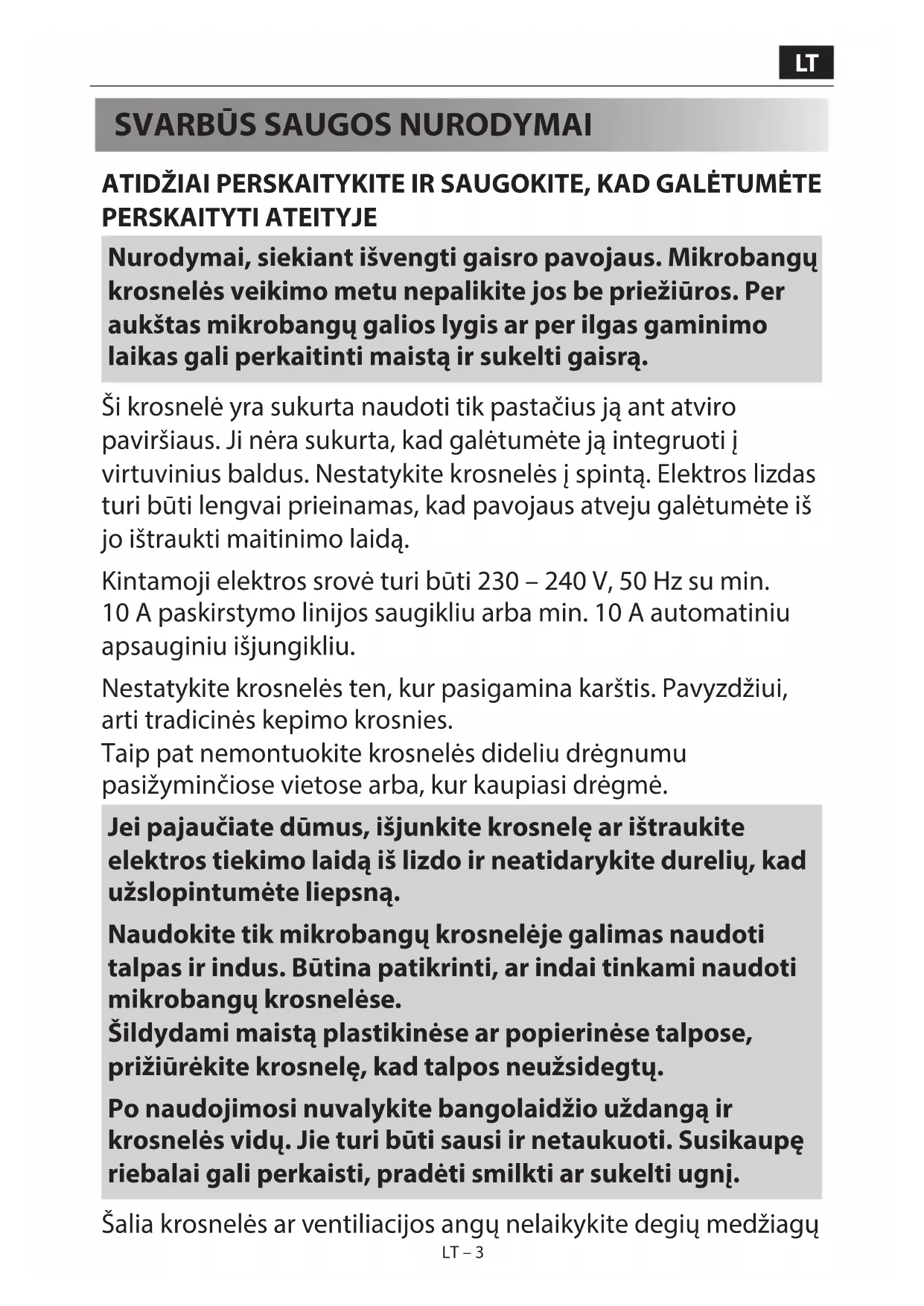 ATIDŽIAI PERSKAITYKITE IR SAUGOKITE, KAD GALĖTUMĖTE PERSKAITYTI ATEITYJE Nurodymai, siekiant išvengti gaisro pavojaus. Mikrobangų krosnelės veikimo metu nepalikite jos be priežiūros. Per aukštas mikrobangų galios lygis ar per ilgas gaminimo laikas gali perkaitinti maistą ir sukelti gaisrą. Ši krosnelė yra sukurta naudoti tik pastačius ją ant atviro paviršiaus. Ji nėra sukurta, kad galėtumėte ją integruoti į virtuvinius baldus. Nestatykite krosnelės į spintą. Elektros lizdas turi būti lengvai prieinamas, kad pavojaus atveju galėtumėte iš jo ištraukti maitinimo laidą. Kintamoji elektros srovė turi būti 230 – 240 V, 50 Hz su min. 10 A paskirstymo linijos saugikliu arba min. 10 A automatiniu apsauginiu išjungikliu. Nestatykite krosnelės ten, kur pasigamina karštis. Pavyzdžiui, arti tradicinės kepimo krosnies. Taip pat nemontuokite krosnelės dideliu drėgnumu pasižyminčiose vietose arba, kur kaupiasi drėgmė. Jei pajaučiate dūmus, išjunkite krosnelę ar ištraukite elektros tiekimo laidą iš lizdo ir neatidarykite durelių, kad užslopintumėte liepsną. Naudokite tik mikrobangų krosnelėje galimas naudoti talpas ir indus. Būtina patikrinti, ar indai tinkami naudoti mikrobangų krosnelėse. Šildydami maistą plastikinėse ar popierinėse talpose, prižiūrėkite krosnelę, kad talpos neužsidegtų. Po naudojimosi nuvalykite bangolaidžio uždangą ir krosnelės vidų. Jie turi būti sausi ir netaukuoti. Susikaupę riebalai gali perkaisti, pradėti smilkti ar sukelti ugnį. Šalia krosnelės ar ventiliacijos angų nelaikykite degių medžiagųLT LT – 3 LT – 3
