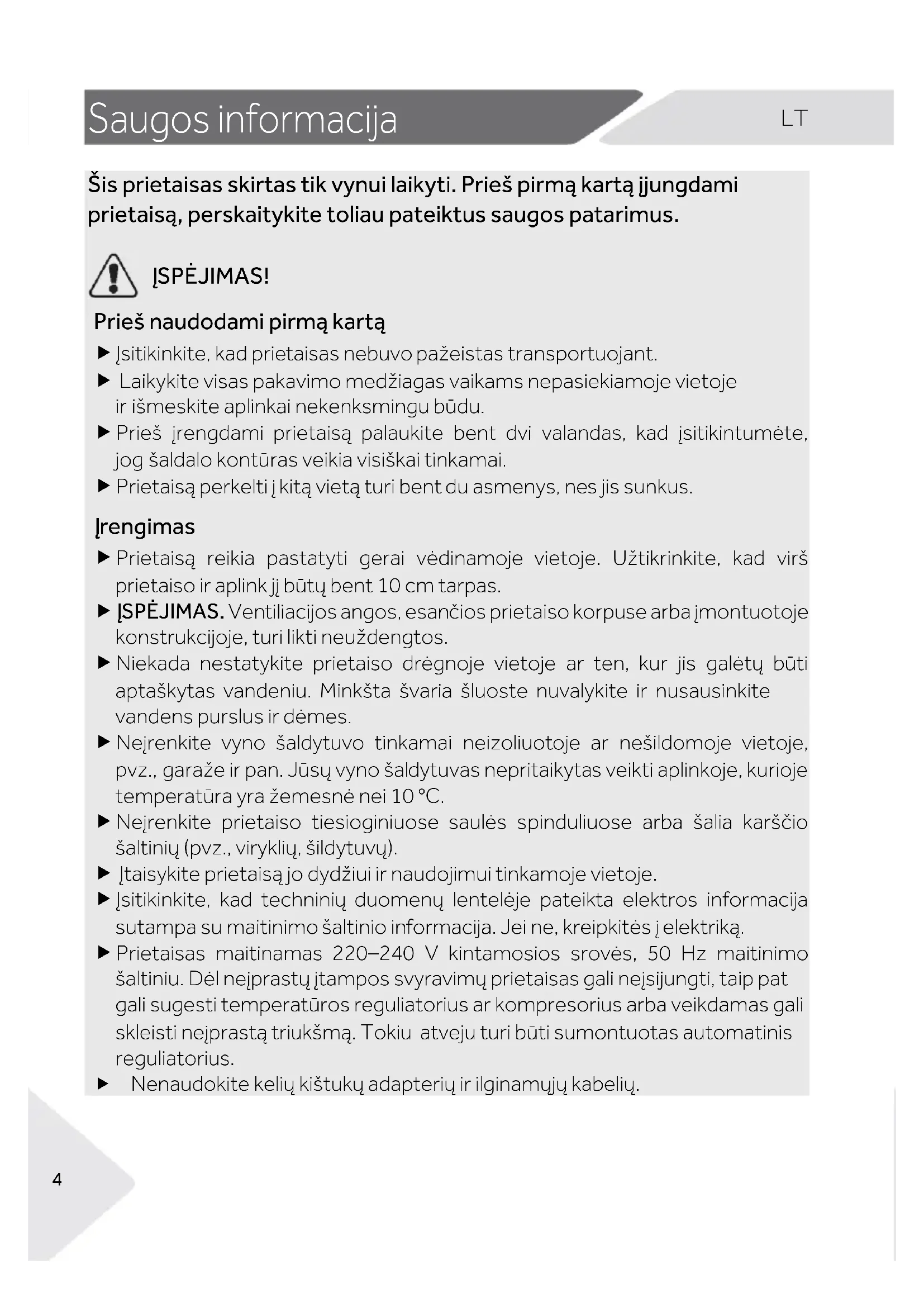Saugos informaci ja Šis prietaisas skirtas tik vynui laikyti. Prieš pirmą kartą įjungdami prietaisą, perskaitykite toliau pateiktus saugos patarimus. ĮSPĖJIMAS! Prieš naudodami pirmą kartą Įsitikinkite, kad prietaisas nebuvo pažeistas transportuojant. Laikykite visas pakavimo medžiagas vaikams nepasiekiamoje vietoje ir išmeskite aplinkai nekenksmingu būdu. Prieš įrengdami prietaisą palaukite bent dvi valandas, kad įsitikintumėte, jog šaldalo kontūras veikia visiškai tinkamai. Prietaisą perkelti į kitą vietą turi bent du asmenys, nes jis sunkus. Įrengimas Prietaisą reikia pastatyti gerai vėdinamoje vietoje. Užtikrinkite, kad virš prietaiso ir aplink jį būtų bent 10 cm tarpas. ĮSPĖJIMAS. Ventiliacijos angos, esančios prietaiso korpuse arba įmontuotoje konstrukcijoje, turi likti neuždengtos. Niekada nestatykite prietaiso drėgnoje vietoje ar ten, kur jis galėtų būti aptaškytas vandeniu. Minkšta švaria šluoste nuvalykite ir nusausinkite vandens purslus ir dėmes. Neįrenkite vyno šaldytuvo tinkamai neizoliuotoje ar nešildomoje vietoje, pvz., garaže ir pan. Jūsų vyno šaldytuvas nepritaikytas veikti aplinkoje, kurioje temperatūra yra žemesnė nei 10 °C. Neįrenkite prietaiso tiesioginiuose saulės spinduliuose arba šalia karščio šaltinių (pvz., viryklių, šildytuvų). Įtaisykite prietaisą jo dydžiui ir naudojimui tinkamoje vietoje. Įsitikinkite, kad techninių duomenų lentelėje pateikta elektros informacija sutampa su maitinimo šaltinio informacija. Jei ne, kreipkitės į elektriką. Prietaisas maitinamas 220–240 V kintamosios srovės, 50 Hz maitinimo šaltiniu. Dėl neįprastų įtampos svyravimų prietaisas gali neįsijungti, taip pat gali sugesti temperatūros reguliatorius ar kompresorius arba veikdamas gali skleisti neįprastą triukšmą. Tokiu atveju turi būti sumontuotas automatinis reguliatorius. Nenaudokite kelių kištukų adapterių ir ilginamųjų kabelių.Saugos informacija