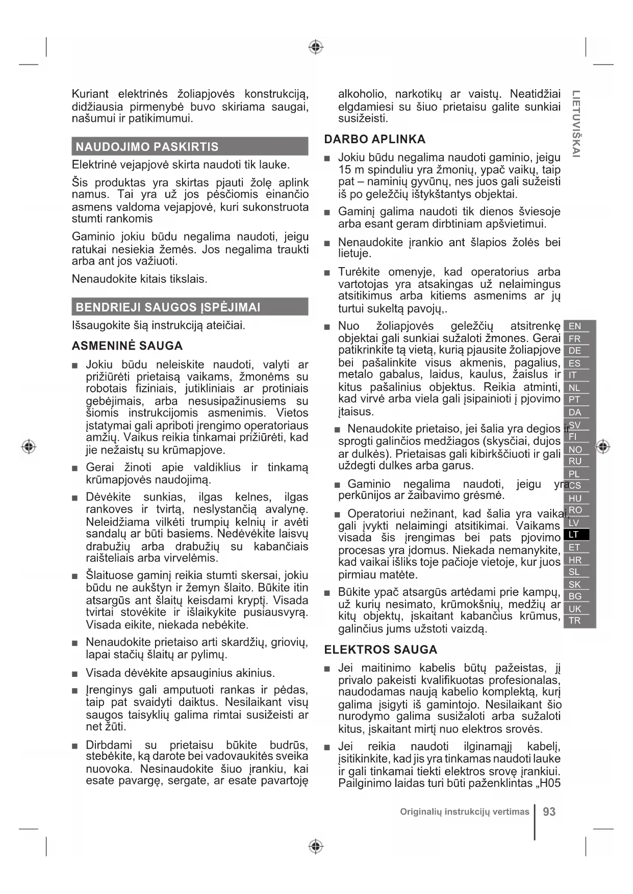 Kuriant elektrinės žoliapjovės konstrukciją, didžiausia pirmenybė buvo skiriama saugai, našumui ir patikimumui. NAUDOJIMO PASKIRTIS Elektrinė vejapjovė skirta naudoti tik lauke. Šis produktas yra skirtas pjauti žolę aplink namus. Tai yra už jos pėsčiomis einančio asmens valdoma vejapjovė, kuri sukonstruota stumti rankomis Gaminio jokiu būdu negalima naudoti, jeigu ratukai nesiekia žemės. Jos negalima traukti arba ant jos važiuoti. Nenaudokite kitais tikslais.