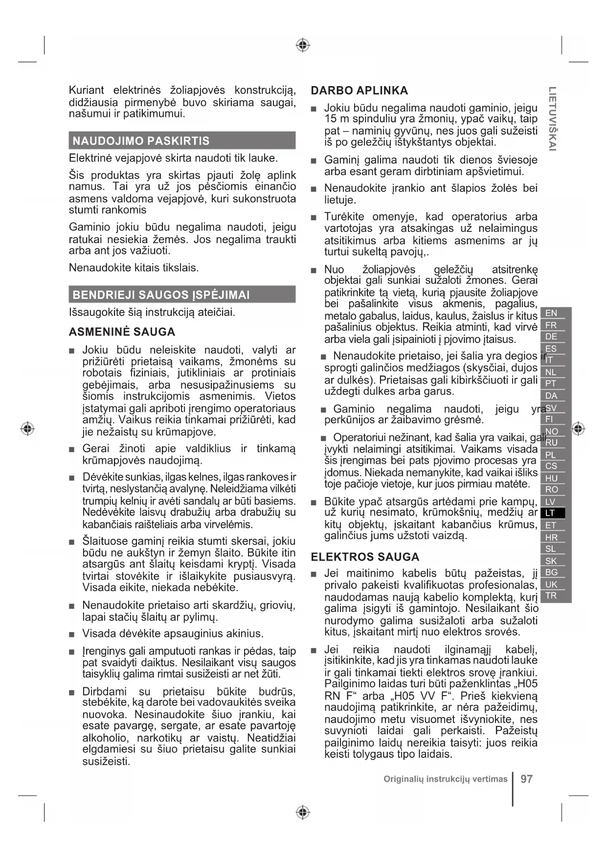 Kuriant elektrinės žoliapjovės konstrukciją, didžiausia pirmenybė buvo skiriama saugai, našumui ir patikimumui. NAUDOJIMO PASKIRTIS Elektrinė vejapjovė skirta naudoti tik lauke. Šis produktas yra skirtas pjauti žolę aplink namus. Tai yra už jos pėsčiomis einančio asmens valdoma vejapjovė, kuri sukonstruota stumti rankomis Gaminio jokiu būdu negalima naudoti, jeigu ratukai nesiekia žemės. Jos negalima traukti arba ant jos važiuoti. Nenaudokite kitais tikslais.
