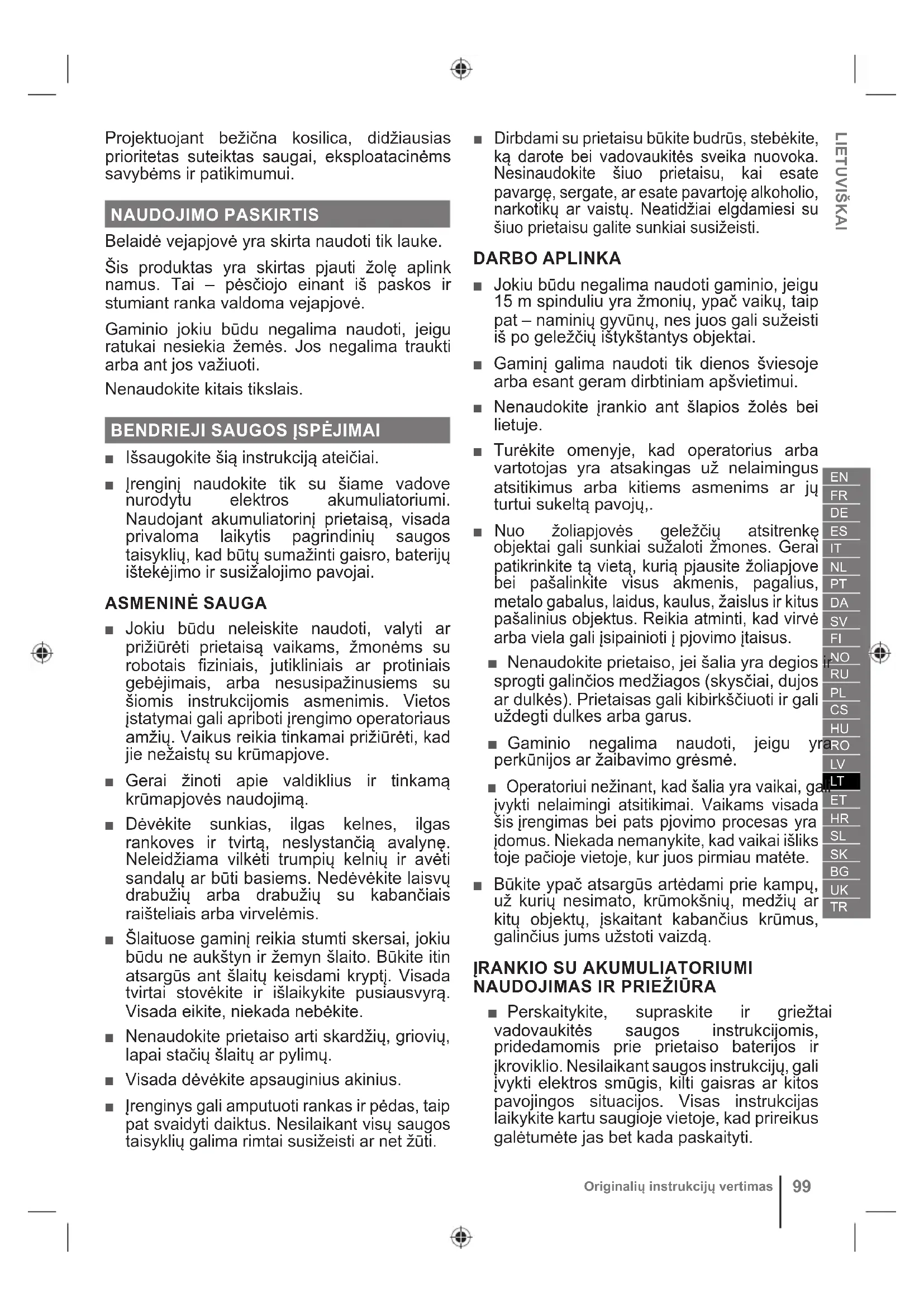 ■ Jokiu būdu negalima kelti gaminio ar jį nešti veikiant varikliui. ■ Sustabdykite gaminį, ištraukite izoliatoriaus raktą ir akumuliatorių. Patikrinkite, ar visos judančio dalys visiškai nustojo suktis. ● paliekant gaminį be priežiūros (taip pat išmetant žolės nuopjovas). ● prieš valydami užsikimšusią žolę arba atkimšdami iškrovimo angą ● prieš tikrindami ar valydami prietaisą arba prieš pradėdami juo pjauti žolę; ● Prieš nuimdami žolės gaudyklę arba atidarydami žolės išmetimo angos dangtį ● prietaisui atsitrenkus į pašalinį objektą: apžiūrėkite, ar prietaisas neapgadintas ir, jei reikia,, pasirūpinkite, kad prieš jį vėl paleidžiant ir naudojant būtų pataisytas; ● Prietaisui pradėjus neįprastai vibruoti (kuo skubiau patikrinkite). – reikia patikrinti, ar nėra gedimų, ypač – ar nepažeistos geležtės. – pakeiskite ar suremontuokite visas pažeistas dalis – patikrinkite, ar nėra atsilaisvinusių detalių ir jas priveržkite ■ Pjovimo geležtė turi suktis apytiksliai lygiagrečiai žemei, virš kurios ji stumiama. ■ Gaminio geležtė aštri. Montuojant, keičiant dalis, valant ar tikrinant varžtų įsukimo tvirtumą, reikia būti atsargiems ir mūvėti patvarias pirštines. ■ Gaminio jokiu būdu negalima naudoti, jeigu įj./išj. jungiklio ant vairalazdės neįmanoma tinkamai paleisti ir tai stabdo gaminį. ■ Jokiu būdu nemėginkite uždėti įj/.išj. jungiklio kaiščio, kai jungiklis ĮJUNGTAS: tai labai pavojinga. ■ Nenaudokite per didelės jėgos. Prietaisą naudodami pagal pagamintą tinkamą greitį, darbą atliksite geriau ir saugiau. ■ Stumdami žoliapjovę per žvyrą ar asfaltą, prietaisą išjunkite, kad geležtės sustotų. ■ Venkite skylių, provėžų, iškilimų, akmenų ar kitų paslėptų objektų. Nelygioje teritorijoje galima paslysti ir išgriūti. ■ Surenkant gaminį ar lankstant rankeną, būtinai reikia patikrinti, ar neįstrigęs, nesuspaustas ar kitaip nepažeistas variklio valdymo laidas. ■ Ilgiau naudojant, įrankis kelia sužeidimų pavojų ir apsunkina darbą. Naudodamiesi įrenginiu ilgesnį laiką, būtinai darykite pertraukas. PAPILDOMI AKUMULIATORIAUS