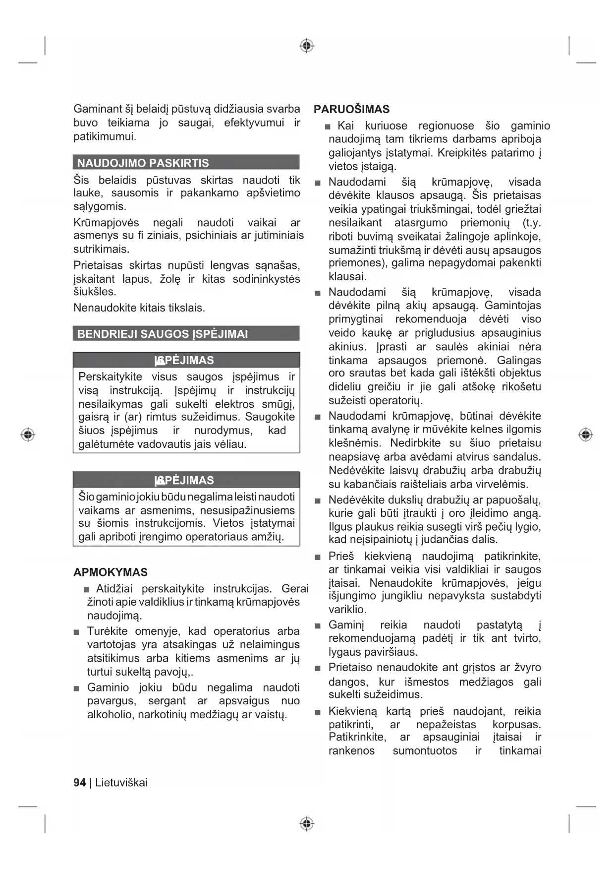 ĮSPĖJIMAS Perskaitykite visus saugos įspėjimus ir visą instrukciją. Įspėjimų ir instrukcijų nesilaikymas gali sukelti elektros smūgį, gaisrą ir (ar) rimtus sužeidimus. Saugokite šiuos įspėjimus ir nurodymus, kad galėtumėte vadovautis jais vėliau. ĮSPĖJIMAS Šio gaminio jokiu būdu negalima leisti naudoti vaikams ar asmenims, nesusipažinusiems su šiomis instrukcijomis. Vietos įstatymai gali apriboti įrengimo operatoriaus amžių. APMOKYMAS ■ Atidžiai perskaitykite instrukcijas. Gerai žinoti apie valdiklius ir tinkamą krūmapjovės naudojimą. ■ Turėkite omenyje, kad operatorius arba vartotojas yra atsakingas už nelaimingus atsitikimus arba kitiems asmenims ar jų turtui sukeltą pavojų,. ■ Gaminio jokiu būdu negalima naudoti pavargus, sergant ar apsvaigus nuo alkoholio, narkotinių medžiagų ar vaistų. PARUOŠIMAS ■ Kai kuriuose regionuose šio gaminio naudojimą tam tikriems darbams apriboja galiojantys įstatymai. Kreipkitės patarimo į vietos įstaigą. ■ Naudodami šią krūmapjovę, visada dėvėkite klausos apsaugą. Šis prietaisas veikia ypatingai triukšmingai, todėl griežtai nesilaikant atasrgumo priemonių (t.y. riboti buvimą sveikatai žalingoje aplinkoje, sumažinti triukšmą ir dėvėti ausų apsaugos priemones), galima nepagydomai pakenkti klausai. ■ Naudodami šią krūmapjovę, visada dėvėkite pilną akių apsaugą. Gamintojas primygtinai rekomenduoja dėvėti viso veido kaukę ar prigludusius apsauginius akinius. Įprasti ar saulės akiniai nėra tinkama apsaugos priemonė. Galingas oro srautas bet kada gali ištėkšti objektus dideliu greičiu ir jie gali atšokę rikošetu sužeisti operatorių. ■ Naudodami krūmapjovę, būtinai dėvėkite tinkamą avalynę ir mūvėkite kelnes ilgomis klešnėmis. Nedirbkite su šiuo prietaisu neapsiavę arba avėdami atvirus sandalus. Nedėvėkite laisvų drabužių arba drabužių su kabančiais raišteliais arba virvelėmis. ■ Nedėvėkite dukslių drabužių ar papuošalų, kurie gali būti įtraukti į oro įleidimo angą. Ilgus plaukus reikia susegti virš pečių lygio, kad neįsipainiotų į judančias dalis. ■ Prieš kiekvieną naudojimą patikrinkite, ar tinkamai veikia visi valdikliai ir saugos įtaisai. Nenaudokite krūmapjovės, jeigu išjungimo jungikliu nepavyksta sustabdyti variklio. ■ Gaminį reikia naudoti pastatytą į rekomenduojamą padėtį ir tik ant tvirto, lygaus paviršiaus. ■ Prietaiso nenaudokite ant grįstos ar žvyro dangos, kur išmestos medžiagos gali sukelti sužeidimus. ■ Kiekvieną kartą prieš naudojant, reikia patikrinti, ar nepažeistas korpusas. Patikrinkite, ar apsauginiai įtaisai ir rankenos sumontuotos ir tinkamai95 Lietuviškai |
