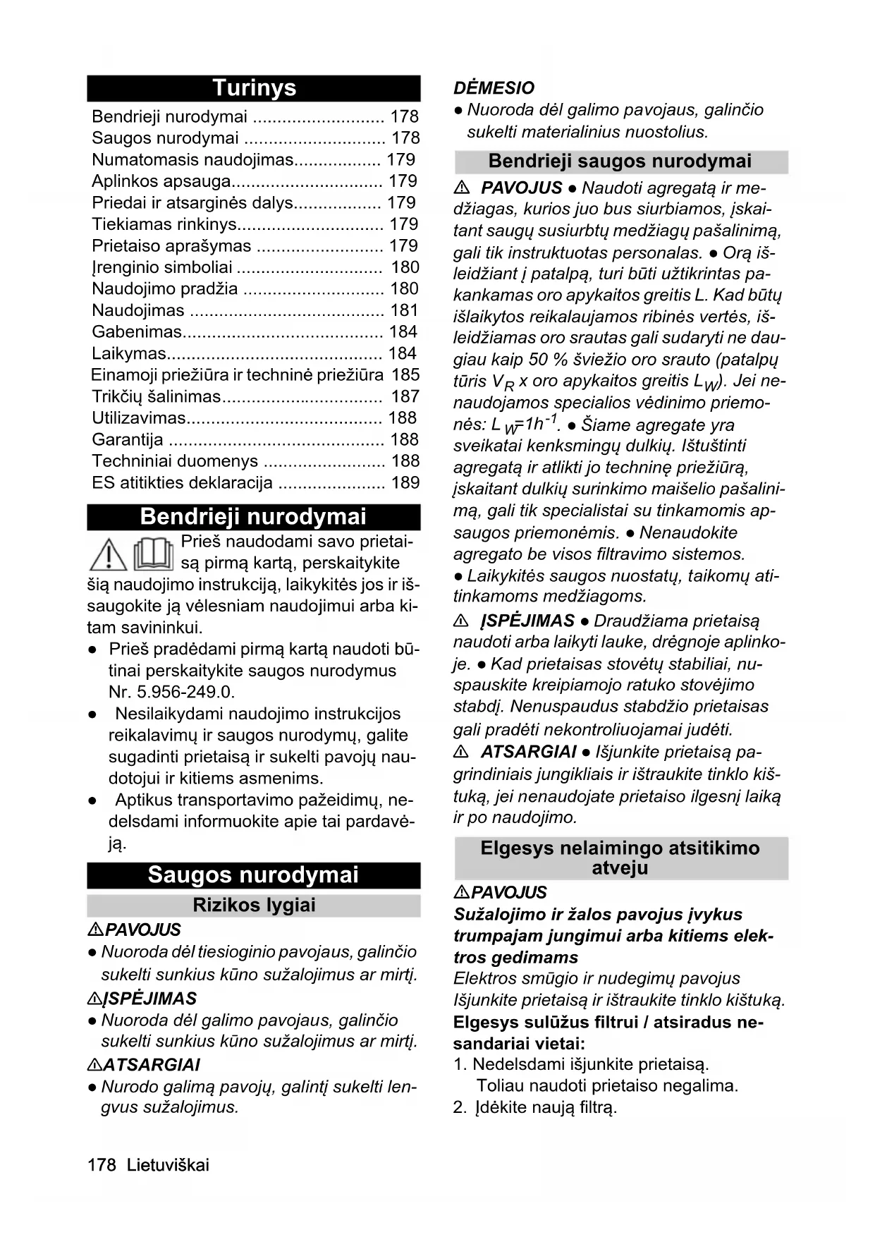 Kabeļu garums m 10178 Lietuviškai Turinys Bendrieji nurodymai Prieš naudodami savo prietai- są pirmą kartą, perskaitykite šią naudojimo instrukciją, laikykitės jos ir iš- saugokite ją vėlesniam naudojimui arba ki- tam savininkui. ● Prieš pradėdami pirmą kartą naudoti bū- tinai perskaitykite saugos nurodymus Nr. 5.956-249.0. ● Nesilaikydami naudojimo instrukcijos reikalavimų ir saugos nurodymų, galite sugadinti prietaisą ir sukelti pavojų nau- dotojui ir kitiems asmenims. ● Aptikus transportavimo pažeidimų, ne- delsdami informuokite apie tai pardavė- ją. Saugos nurodymai Rizikos lygiai PAVOJUS ● Nuoroda dėl tiesioginio pavojaus, galinčio sukelti sunkius kūno sužalojimus ar mirtį. 몇 ĮSPĖJIMAS ● Nuoroda dėl galimo pavojaus, galinčio sukelti sunkius kūno sužalojimus ar mirtį. 몇 ATSARGIAI ● Nurodo galimą pavojų, galintį sukelti len- gvus sužalojimus. DĖMESIO ● Nuoroda dėl galimo pavojaus, galinčio sukelti materialinius nuostolius. Bendrieji saugos nurodymai PAVOJUS ● Naudoti agregatą ir me- džiagas, kurios juo bus siurbiamos, įskai- tant saugų susiurbtų medžiagų pašalinimą, gali tik instruktuotas personalas. ● Orą iš- leidžiant į patalpą, turi būti užtikrintas pa- kankamas oro apykaitos greitis L. Kad būtų išlaikytos reikalaujamos ribinės vertės, iš- leidžiamas oro srautas gali sudaryti ne dau- giau kaip 50 % šviežio oro srauto (patalpų tūris V