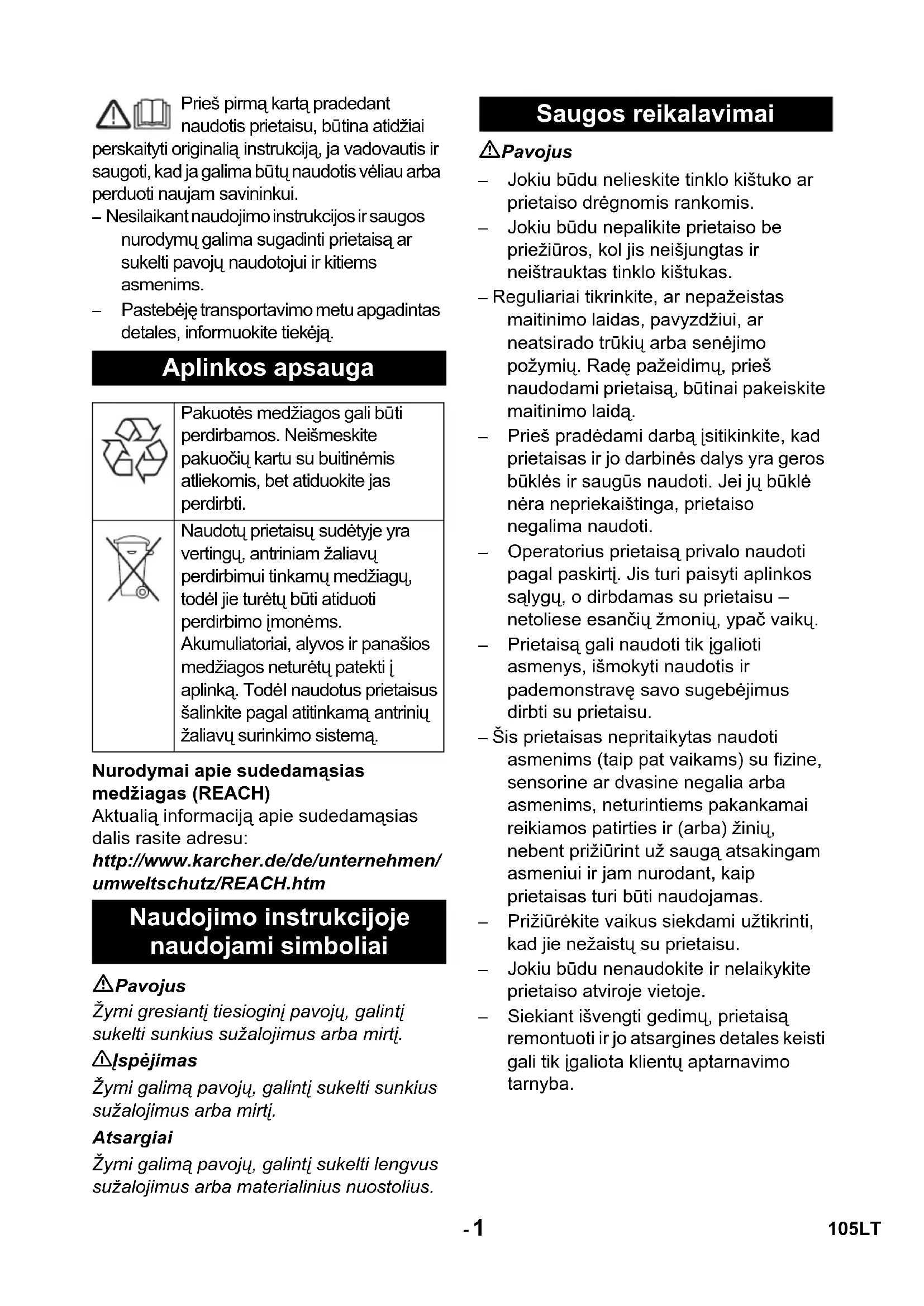 CEO Head of Approbation 104 LV- 1 Prieš pirmą kartą pradedant naudotis prietaisu, būtina atidžiai perskaityti originalią instrukciją, ja vadovautis ir saugoti, kad ja galima būtų naudotis vėliau arba perduoti naujam savininkui. – Nesilaikant naudojimo instrukcijos ir saugos nurodymų galima sugadinti prietaisą ar sukelti pavojų naudotojui ir kitiems asmenims. – Pastebėję transportavimo metu apgadintas detales, informuokite tiekėją. Nurodymai apie sudedamąsias medžiagas (REACH) Aktualią informaciją apie sudedamąsias dalis rasite adresu: http://www.karcher.de/de/unternehmen/ umweltschutz/REACH.htm Pavojus Žymi gresiantį tiesioginį pavojų, galintį sukelti sunkius sužalojimus arba mirtį. 몇 Įspėjimas Žymi galimą pavojų, galintį sukelti sunkius sužalojimus arba mirtį. Atsargiai Žymi galimą pavojų, galintį sukelti lengvus sužalojimus arba materialinius nuostolius. Pavojus – Jokiu būdu nelieskite tinklo kištuko ar prietaiso drėgnomis rankomis. – Jokiu būdu nepalikite prietaiso be priežiūros, kol jis neišjungtas ir neištrauktas tinklo kištukas. – Reguliariai tikrinkite, ar nepažeistas maitinimo laidas, pavyzdžiui, ar neatsirado trūkių arba senėjimo požymių. Radę pažeidimų, prieš naudodami prietaisą, būtinai pakeiskite maitinimo laidą. – Prieš pradėdami darbą įsitikinkite, kad prietaisas ir jo darbinės dalys yra geros būklės ir saugūs naudoti. Jei jų būklė nėra nepriekaištinga, prietaiso negalima naudoti. – Operatorius prietaisą privalo naudoti pagal paskirtį. Jis turi paisyti aplinkos sąlygų, o dirbdamas su prietaisu – netoliese esančių žmonių, ypač vaikų. – Prietaisą gali naudoti tik įgalioti asmenys, išmokyti naudotis ir pademonstravę savo sugebėjimus dirbti su prietaisu. – Šis prietaisas nepritaikytas naudoti asmenims (taip pat vaikams) su fizine, sensorine ar dvasine negalia arba asmenims, neturintiems pakankamai reikiamos patirties ir (arba) žinių, nebent prižiūrint už saugą atsakingam asmeniui ir jam nurodant, kaip prietaisas turi būti naudojamas. – Prižiūrėkite vaikus siekdami užtikrinti, kad jie nežaistų su prietaisu. – Jokiu būdu nenaudokite ir nelaikykite prietaiso atviroje vietoje. – Siekiant išvengti gedimų, prietaisą remontuoti ir jo atsargines detales keisti gali tik įgaliota klientų aptarnavimo tarnyba. Aplinkos apsauga Pakuotės medžiagos gali būti perdirbamos. Neišmeskite pakuočių kartu su buitinėmis atliekomis, bet atiduokite jas perdirbti. Naudotų prietaisų sudėtyje yra vertingų, antriniam žaliavų perdirbimui tinkamų medžiagų, todėl jie turėtų būti atiduoti perdirbimo įmonėms. Akumuliatoriai, alyvos ir panašios medžiagos neturėtų patekti į aplinką. Todėl naudotus prietaisus šalinkite pagal atitinkamą antrinių žaliavų surinkimo sistemą. Naudojimo instrukcijoje naudojami simboliai Saugos reikalavimai 105LT- 2 – Šis ventiliatorius yra skirtas drėgnuoju būdu valytiems kilimams ir kiliminėms dangoms džiovinti.– Šis prietaisas skirtas naudoti tik pramonėje.Prietaiso naudojimas kitais tikslais laikomas naudojimu ne pagal paskirtį. Už žalą, susidariusią dėl naudojimo ne pagal paskirtį, gamintojas neatsako; visa atsakomybė tenka naudotojui.1 Transportavimo rankena2 Transportavimo rankenos tvirtinimas3 Elektros laidas4 Transporto ratukas5 Fiksuojamoji dalis su kryžminėmis rankenomis6Pūtiklis7 Rankena8 Prietaiso jungiklisÎ Sumontuokite transportavimo rankenos. Pastaba: įrengiant prietaisą, reikia atkreipti dėmesį į tai, kad nebūtų uždengtos ventiliatoriaus grotelės. Î Siekdami pagerinti ventiliaciją, jei įmanoma, atverkite duris ir langus. Î Pastatykite prietaisą ant džiovinamo kilimo.Î Pakelkite kilimą. Î Pakiškite kilimą po prietaiso fiksuojamąja dalimi ir pritvirtinkite sukdami kryžmines rankenas.Î Įkiškite elektros laido kištuką.Î Įjunkite prietaisą.Î Išjunkite prietaisą. Î Ištraukite elektros laido kištuką. Naudojimas pagal paskirtį Prietaiso dalys Naudojimo pradžia