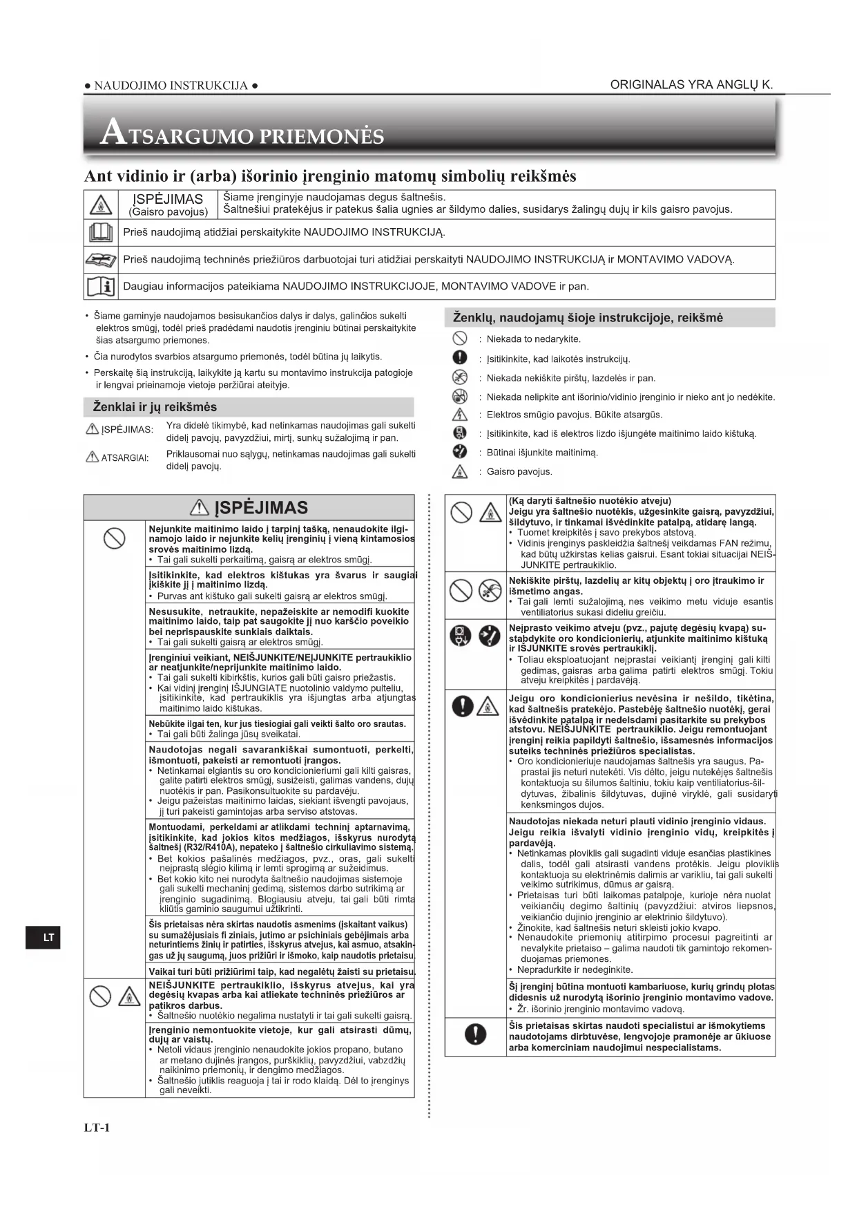 Ant vidinio ir (arba) išorinio įrenginio matomų simbolių reikšmės ĮSPĖJIMAS (Gaisro pavojus)Šiame įrenginyje naudojamas degus šaltnešis.Šaltnešiui pratekėjus ir patekus šalia ugnies ar šildymo dalies, susidarys žalingų dujų ir kils gaisro pavojus.Prieš naudojimą atidžiai perskaitykite NAUDOJIMO INSTRUKCIJĄ.Prieš naudojimą techninės priežiūros darbuotojai turi atidžiai perskaityti NAUDOJIMO INSTRUKCIJĄ ir MONTAVIMO VADOVĄ.Daugiau informacijos pateikiama NAUDOJIMO INSTRUKCIJOJE, MONTAVIMO VADOVE ir pan. RH79A019H03_22Lt.indd 1 2020/3/5 13:54:54LT-2 Siekiant užtikrinti tinkamą ir saugų naudojimą, prieš pradėdami naudoti įrenginį, atidžiai perskaitykite šią naudojimo instrukciją.