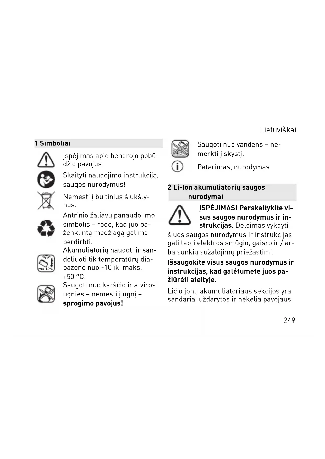 akumuliatoriaus naudojimo Akumuliatorius tiekiamas iš da lies įkrautas. Kad būtų užtikrinta visa akumuliatoriaus galia, prieš pirmąjį naudojimą akumuliatorių būtina pilnai įkrauti tinkamu krovikliu. Akumuliatorių papildomai įkrauti gali ma bet kuriuo metu, tai netrumpina jo tarnavimo laiko. Įkrovimo proceso per traukimas akumuliatoriui nekenkia. Elektriniam įrankiui išsijun gus automatiškai, jo jungik lio nebespausti. Tai gali pa kenkti akumuliatoriui. Akumuliatoriuje yra įrengta temperatū ros kontrolė, leidžianti įkrauti tik tem peratūrų diapazone nuo 0 iki 55 °C. Tai užtikrina ilgą akumuliatoriaus tarnavi mo laiką. – Akumuliatorių laikyti pagal galimybes vėsioje (nuo 5 iki 25 °C) ir sausoje (oro drėgnumas < 80 %) vietoje. – Todėl, pvz., vasarą akumuliatoriaus negalima palikti automobilyje. Lietuviškai 254– Po įkrovimo pastebimai sumažėjusi akumuliatoriaus naudojimo trukmė rodo, kad akumuliatorius susidėvėjo ir jį reikia keisti nauju. – Laikytis utilizavimo nurodymų.