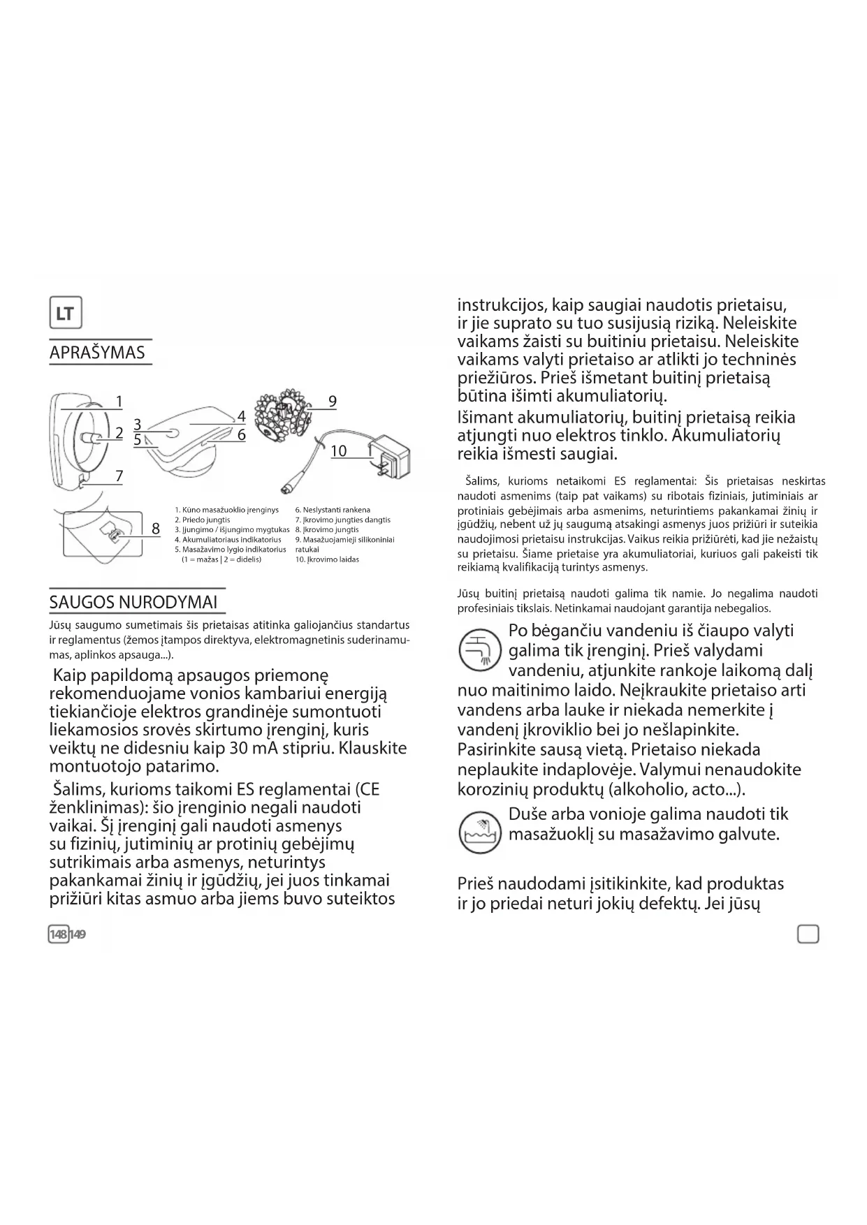 instrukcijos, kaip saugiai naudotis prietaisu, ir jie suprato su tuo susijusią riziką. Neleiskite vaikams žaisti su buitiniu prietaisu. Neleiskite vaikams valyti prietaiso ar atlikti jo techninės priežiūros. Prieš išmetant buitinį prietaisą būtina išimti akumuliatorių. Išimant akumuliatorių, buitinį prietaisą reikia atjungti nuo elektros tinklo. Akumuliatorių reikia išmesti saugiai. Šalims, kurioms netaikomi ES reglamentai: Šis prietaisas neskirtas naudoti asmenims (taip pat vaikams) su ribotais fiziniais, jutiminiais ar protiniais gebėjimais arba asmenims, neturintiems pakankamai žinių ir įgūdžių, nebent už jų saugumą atsakingi asmenys juos prižiūri ir suteikia naudojimosi prietaisu instrukcijas. Vaikus reikia prižiūrėti, kad jie nežaistų su prietaisu. Šiame prietaise yra akumuliatoriai, kuriuos gali pakeisti tik reikiamą kvalifikaciją turintys asmenys. Jūsų buitinį prietaisą naudoti galima tik namie. Jo negalima naudoti profesiniais tikslais. Netinkamai naudojant garantija nebegalios. Po bėgančiu vandeniu iš čiaupo valyti galima tik įrenginį. Prieš valydami vandeniu, atjunkite rankoje laikomą dalį nuo maitinimo laido. Neįkraukite prietaiso arti vandens arba lauke ir niekada nemerkite į vandenį įkroviklio bei jo nešlapinkite. Pasirinkite sausą vietą. Prietaiso niekada neplaukite indaplovėje. Valymui nenaudokite korozinių produktų (alkoholio, acto...). Duše arba vonioje galima naudoti tik masažuoklį su masažavimo galvute. Prieš naudodami įsitikinkite, kad produktas ir jo priedai neturi jokių defektų. Jei jūsų150 151 įrenginys yra pažeistas arba turi defektų, jo nebenaudokite. Jei jūsų prietaisas nukrito ir ėmė netinkamai veikti, nebenaudokite jo ir susisiekite su techninės priežiūros centru. Jei maitinimo laidas yra pažeistas, jį turi pakeisti gamintojas, jo techninės priežiūros specialistas arba panašios kvalifikacijos asmenys, kad būtų išvengta pavojaus.