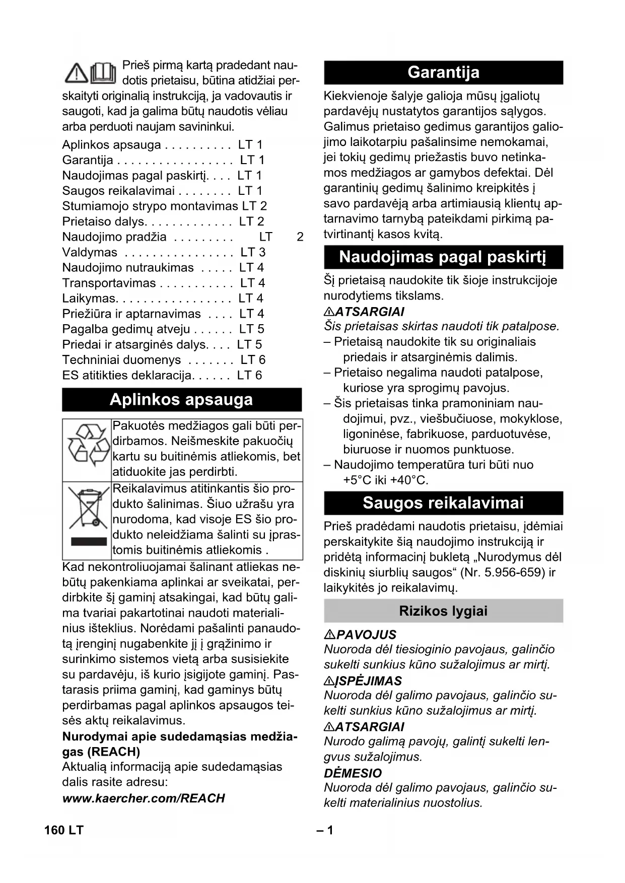 Chairman of the Board of Management Director Regulatory Affairs & Certification 159LV– 1 Prieš pirmą kartą pradedant nau- dotis prietaisu, būtina atidžiai per- skaityti originalią instrukciją, ja vadovautis ir saugoti, kad ja galima būtų naudotis vėliau arba perduoti naujam savininkui. Kad nekontroliuojamai šalinant atliekas ne- būtų pakenkiama aplinkai ar sveikatai, per- dirbkite šį gaminį atsakingai, kad būtų gali- ma tvariai pakartotinai naudoti materiali- nius išteklius. Norėdami pašalinti panaudo- tą įrenginį nugabenkite jį į grąžinimo ir surinkimo sistemos vietą arba susisiekite su pardavėju, iš kurio įsigijote gaminį. Pas- tarasis priima gaminį, kad gaminys būtų perdirbamas pagal aplinkos apsaugos tei- sės aktų reikalavimus. Nurodymai apie sudedamąsias medžia- gas (REACH) Aktualią informaciją apie sudedamąsias dalis rasite adresu: www.kaercher.com/REACH Kiekvienoje šalyje galioja mūsų įgaliotų pardavėjų nustatytos garantijos sąlygos. Galimus prietaiso gedimus garantijos galio- jimo laikotarpiu pašalinsime nemokamai, jei tokių gedimų priežastis buvo netinka- mos medžiagos ar gamybos defektai. Dėl garantinių gedimų šalinimo kreipkitės į savo pardavėją arba artimiausią klientų ap- tarnavimo tarnybą pateikdami pirkimą pa- tvirtinantį kasos kvitą. Šį prietaisą naudokite tik šioje instrukcijoje nurodytiems tikslams. 몇 ATSARGIAI Šis prietaisas skirtas naudoti tik patalpose. – Prietaisą naudokite tik su originaliais priedais ir atsarginėmis dalimis. – Prietaiso negalima naudoti patalpose, kuriose yra sprogimų pavojus. – Šis prietaisas tinka pramoniniam nau- dojimui, pvz., viešbučiuose, mokyklose, ligoninėse, fabrikuose, parduotuvėse, biuruose ir nuomos punktuose. – Naudojimo temperatūra turi būti nuo +5°C iki +40°C. Prieš pradėdami naudotis prietaisu, įdėmiai perskaitykite šią naudojimo instrukciją ir pridėtą informacinį bukletą „Nurodymus dėl diskinių siurblių saugos“ (Nr. 5.956-659) ir laikykitės jo reikalavimų. PAVOJUS Nuoroda dėl tiesioginio pavojaus, galinčio sukelti sunkius kūno sužalojimus ar mirtį. 몇 ĮSPĖJIMAS Nuoroda dėl galimo pavojaus, galinčio su- kelti sunkius kūno sužalojimus ar mirtį. 몇 ATSARGIAI Nurodo galimą pavojų, galintį sukelti len- gvus sužalojimus. DĖMESIO Nuoroda dėl galimo pavojaus, galinčio su- kelti materialinius nuostolius. Aplinkos apsauga . . . . . . . . . . LT 1 Garantija . . . . . . . . . . . . . . . . . LT 1 Naudojimas pagal paskirtį. . . . LT 1 Saugos reikalavimai . . . . . . . . LT 1 Stumiamojo strypo montavimas LT 2 Prietaiso dalys. . . . . . . . . . . . . LT 2 Naudojimo pradžia . . . . . . . . . LT 2 Valdymas . . . . . . . . . . . . . . . . LT 3 Naudojimo nutraukimas . . . . . LT 4 Transportavimas . . . . . . . . . . . LT 4 Laikymas. . . . . . . . . . . . . . . . . LT 4 Priežiūra ir aptarnavimas . . . . LT 4 Pagalba gedimų atveju . . . . . . LT 5 Priedai ir atsarginės dalys. . . . LT 5 Techniniai duomenys . . . . . . . LT 6 ES atitikties deklaracija. . . . . . LT 6 Aplinkos apsauga Pakuotės medžiagos gali būti per- dirbamos. Neišmeskite pakuočių kartu su buitinėmis atliekomis, bet atiduokite jas perdirbti. Reikalavimus atitinkantis šio pro- dukto šalinimas. Šiuo užrašu yra nurodoma, kad visoje ES šio pro- dukto neleidžiama šalinti su įpras- tomis buitinėmis atliekomis . Garantija Naudojimas pagal paskirtį Saugos reikalavimai Rizikos lygiai 160 LT– 2 Saugos įranga apsaugo naudotoją, todėl jos negalima keisti arba nenaudoti. Užtikrina, kad prietaisas nebūtų įjungiamas netyčia. Norėdami įjungti įrenginį nuspaus- kite blokavimo panaikinimo mygtuką, tada ĮJUNGIMO / IŠJUNGIMO jungiklį. Prieš pradėdami naudoti įrenginį, kaip pa- rodyta, sumontuokite stumiamąjį strypą ir įjunkite įrenginį į maitinimo tinklą. Paveikslas pateiktas viršelyje Prietaiso iliustracijoje pateikiamas prietai- sas „BDS 43/150 C Classic“. „BDS 43 / Duo C“ prietaisas šiek tiek skiriasi nuo „BDS 43 / 150 C Classic“. 1 Laikiklis, diskinis šepetys / valymo pado diskas 2 Šepetys / varančiosios rato plokštės pa- das 3 Valomojo tirpalo dozavimo svirtis (pasi- renkama) 4 Pagrindinis jungiklis 5 Kabelio kablys 6 Atblokavimo mygtukas 7 Rankena 8 Polinkio reguliatorius 9 Šepečio pavaros saugiklis 10 Šakutės lizdas priedams 11 Valymo priemonių bakas (pasirenka- mas priedas) 12 Variklio korpusas 13 Šepečio sūkių dažnio nustatymo jungi- klis (taikoma tik „BDS 43 / Duo C“) ** netiekiama kartu su įrenginiu Reguliariai tikrinkite, ar nepažeistas maitinimo laidas, pavyzdžiui, ar neatsi- rado trūkių arba senėjimo požymių. Radę pažeidimų, prieš naudodami prie- taisą, būtinai pakeiskite maitinimo laidą. Sugedus prietaisui, kad patikrinimo ir remonto darbus atliktų klientų aptarna- vimo tarnyba. – Elektros įrangos charakteristikos pa- teiktos techninėje specifikacijoje ir duo- menų lentelėje. – Elektros instaliaciją turi atlikti elektrikas vadovaudamasis IEC 60364-1 reikala- vimais. PAVOJUS Srovės smūgio pavojus. – Nepervažiuokite per maitinimo kabelį. PAVOJUS Sužalojimų pavojus! – Jokiu būdu nedėkite maitinimo kabelio apie kūną ar kaklą. – Užtikrinkite, kad maitinimo kabelis ne- prisiliestų prie besisukančio šepečio ar valymo pado. Saugos įranga Fiksatorius Stumiamojo strypo montavimas Prietaiso dalys