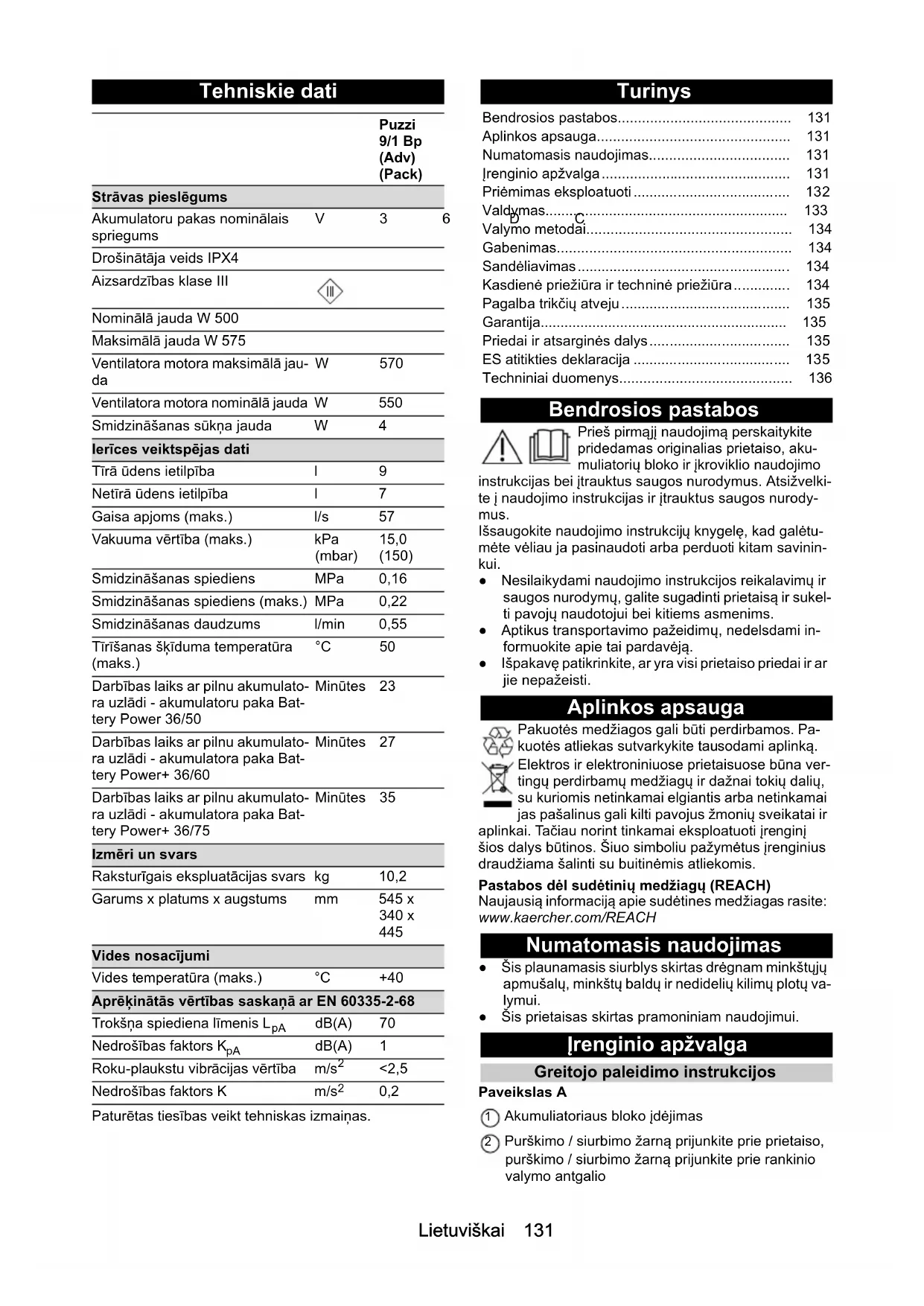 Parakstītāji rīkojas valdes vārdā un ar tās pilnvaru. Pilnvarotais sagatavot dokumentāciju: S. Reizers (S. Reiser) Alfred Kärcher SE & Co. KG Alfred-Kärcher-Str. 28 - 40 71364 Winnenden (V ācija) Tālr.: +49 7195 14-0 Fakss: +49 7195 14-2212 Winnenden, 2020/10/01 Apzīmējums Pasūtījuma numurs, re- zerves daļa Artikula nu- murs, neie- saiņots Akumulatoru paka Battery Power+ 36/75 2.445-043.0 6.445-059.0 Akumulatoru paka Battery Power+ 36/60 2.042-022.0 6.445-085.0 Akumulatoru paka Battery Power 36/50 2.445-031.0 6.445-039.0 Ātrās uzlādes ierīce Bat- tery Power+ 36/60 (EU) 2.445-045.0 6.445-063.0 Ātrās uzlādes ierīce Bat- tery Power+ 36/60 (GB) 2.445-047.0 6.445-065.0 Ātrās uzlādes ierīce Bat- tery Power+ 36/60 (AU) 2.445-051.0 6.445-069.0Lietuviškai 131 Tehniskie dati Paturētas tiesības veikt tehniskas izmaiņas. Turinys Bendrosios pastabos Prieš pirmąjį naudojimą perskaitykite pridedamas originalias prietaiso, aku- muliatorių bloko ir įkroviklio naudojimo instrukcijas bei įtrauktus saugos nurodymus. Atsižvelki- te į naudojimo instrukcijas ir įtrauktus saugos nurody- mus. Išsaugokite naudojimo instrukcijų knygelę, kad galėtu- mėte vėliau ja pasinaudoti arba perduoti kitam savinin- kui. ● Nesilaikydami naudojimo instrukcijos reikalavimų ir saugos nurodymų, galite sugadinti prietaisą ir sukel- ti pavojų naudotojui bei kitiems asmenims. ● Aptikus transportavimo pažeidimų, nedelsdami in- formuokite apie tai pardavėją. ● Išpakavę patikrinkite, ar yra visi prietaiso priedai ir ar jie nepažeisti. Aplinkos apsauga Pakuotės medžiagos gali būti perdirbamos. Pa- kuotės atliekas sutvarkykite tausodami aplinką. Elektros ir elektroniniuose prietaisuose būna ver- tingų perdirbamų medžiagų ir dažnai tokių dalių, su kuriomis netinkamai elgiantis arba netinkamai jas pašalinus gali kilti pavojus žmonių sveikatai ir aplinkai. Tačiau norint tinkamai eksploatuoti įrenginį šios dalys būtinos. Šiuo simboliu pažymėtus įrenginius draudžiama šalinti su buitinėmis atliekomis. Pastabos dėl sudėtinių medžiagų (REACH) Naujausią informaciją apie sudėtines medžiagas rasite: www.kaercher.com/REACH Numatomasis naudojimas ● Šis plaunamasis siurblys skirtas drėgnam minkštųjų apmušalų, minkštų baldų ir nedidelių kilimų plotų va- lymui. ● Šis prietaisas skirtas pramoniniam naudojimui. Įrenginio apžvalga Greitojo paleidimo instrukcijos Paveikslas A 1 Akumuliatoriaus bloko įdėjimas 2 Purškimo / siurbimo žarną prijunkite prie prietaiso, purškimo / siurbimo žarną prijunkite prie rankinio valymo antgalio Puzzi 9/1 Bp (Adv) (Pack) Strāvas pieslēgums Akumulatoru pakas nominālais spriegums V36 DC Drošinātāja veids IPX4 Aizsardzības klase III Nominālā jauda W 500 Maksimālā jauda W 575 Ventilatora motora maksimālā jau-