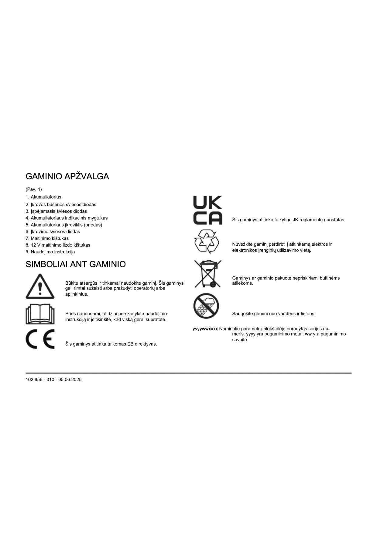 Būkite atsargūs ir tinkamai naudokite gaminį. Šis gaminys gali rimtai sužeisti arba pražudyti operatorių arba aplinkinius. Prieš naudodami, atidžiai perskaitykite naudojimo instrukciją ir įsitikinkite, kad viską gerai supratote. Šis gaminys atitinka taikomas EB direktyvas. Šis gaminys atitinka taikytinų JK reglamentų nuostatas. Nuvežkite gaminį perdirbti į atitinkamą elektros ir elektronikos įrenginių utilizavimo vietą. Gaminys ar gaminio pakuotė nepriskiriami buitinėms atliekoms. Saugokite gaminį nuo vandens ir lietaus. yyyywwxxxx Nominalių parametrų plokštelėje nurodytas serijos nu- meris. yyyy yra pagaminimo metai, ww yra pagaminimo savaitė. 102 856 - 010 - 05.06.2025Pasižymėkite: Kiti ant gaminio pateikti simboliai (lipdukai), skirti kitų komercinių teritorijų sertifikavimo reikalavimams. Produkto pažeidimai Mes neatsakome už mūsų gaminio sugadinimą, jei: