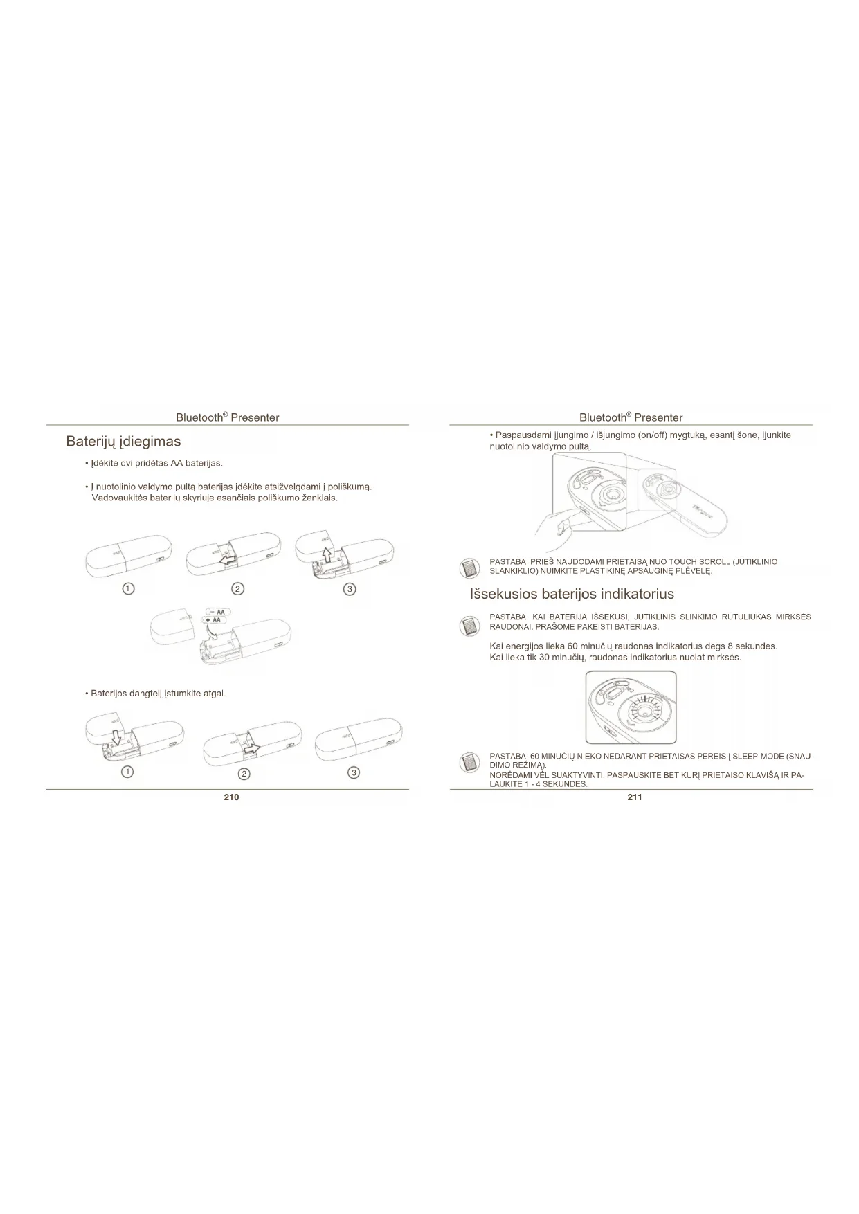 Išsekusios baterijos indikatorius PASTABA: KAI BATERIJA IŠSEKUSI, JUTIKLINIS SLINKIMO RUTULIUKAS MIRKSĖS RAUDONAI. PRAŠOME PAKEISTI BATERIJAS. Kai energijos lieka 60 minučių raudonas indikatorius degs 8 sekundes. Kai lieka tik 30 minučių, raudonas indikatorius nuolat mirksės.Bluetooth