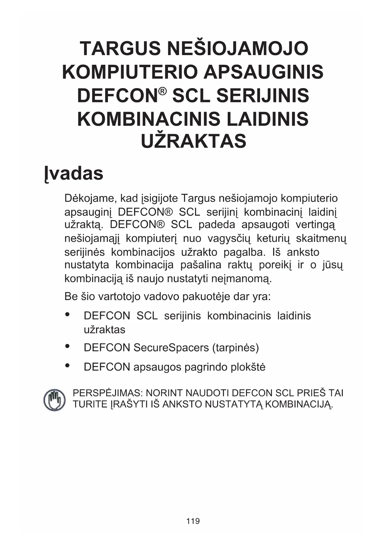 Dėkojame, kad įsigijote Targus nešiojamojo kompiuterio apsauginį DEFCON® SCL serijinį kombinacinį laidinį užraktą. DEFCON® SCL padeda apsaugoti vertingą nešiojamąjį kompiuterį nuo vagysčių keturių skaitmenų serijinės kombinacijos užrakto pagalba. Iš anksto nustatyta kombinacija pašalina raktų poreikį ir o jūsų kombinaciją iš naujo nustatyti neįmanomą. Be šio vartotojo vadovo pakuotėje dar yra: DEFCON SCL serijinis kombinacinis laidinis užraktas DEFCON SecureSpacers (tarpinės) DEFCON apsaugos pagrindo plokštė PERSPĖJIMAS: NORINT NAUDOTI DEFCON SCL PRIEŠ TAI TURITE ĮRAŠYTI IŠ ANKSTO NUSTATYTĄ KOMBINACIJĄ.