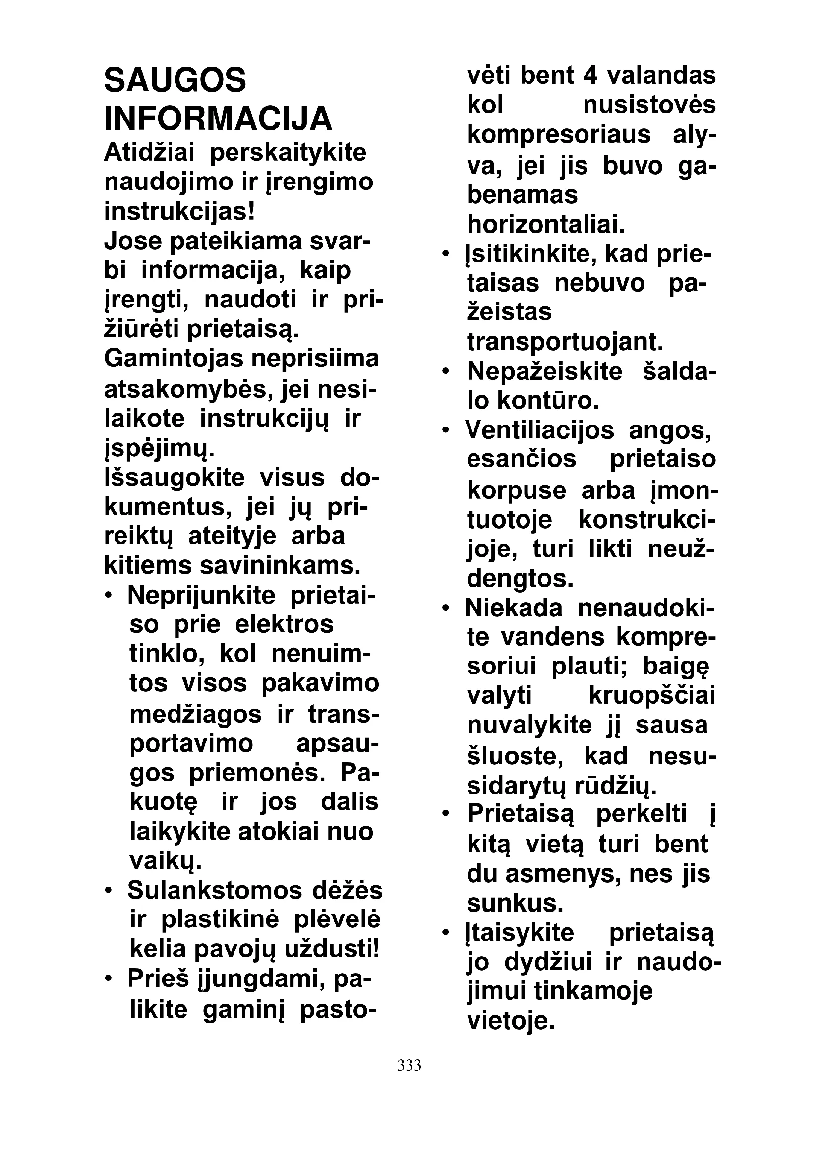 - Prieš įjungdami, pa- likite gaminį pasto- vėti bent 4 valandas kol nusistovės kompresoriaus aly- va, jei jis buvo ga- benamas horizontaliai.