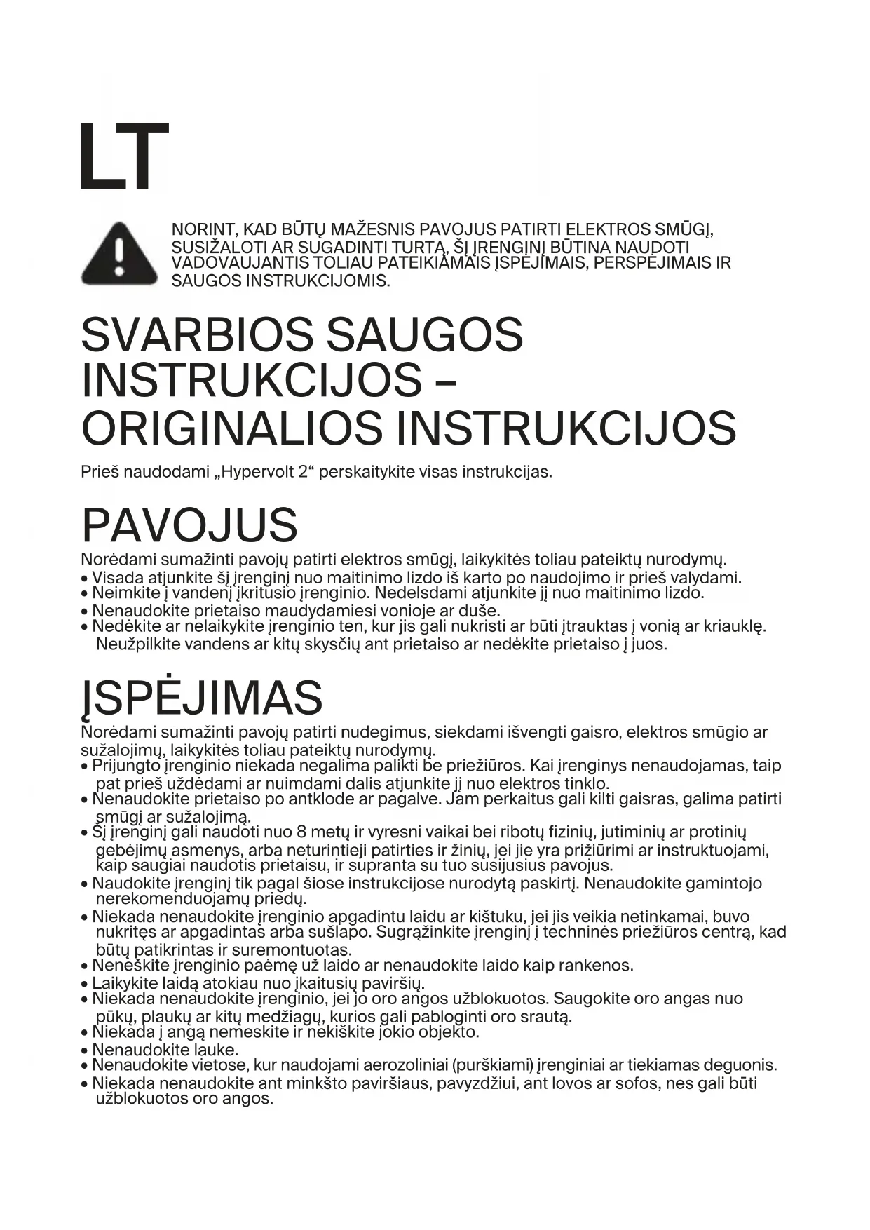 7LT NORINT, KAD BŪTŲ MAŽESNIS PAVOJUS PATIRTI ELEKTROS SMŪGĮ, SUSIŽALOTI AR SUGADINTI TURTĄ, ŠĮ ĮRENGINĮ BŪTINA NAUDOTI VADOVAUJANTIS TOLIAU PATEIKIAMAIS ĮSPĖJIMAIS, PERSPĖJIMAIS IR SAUGOS INSTRUKCIJOMIS. SVARBIOS SAUGOS INSTRUKCIJOS – ORIGINALIOS INSTRUKCIJOS Prieš naudodami „Hypervolt 2“ perskaitykite visas instrukcijas. PAVOJUS Norėdami sumažinti pavojų patirti elektros smūgį, laikykitės toliau pateiktų nurodymų.