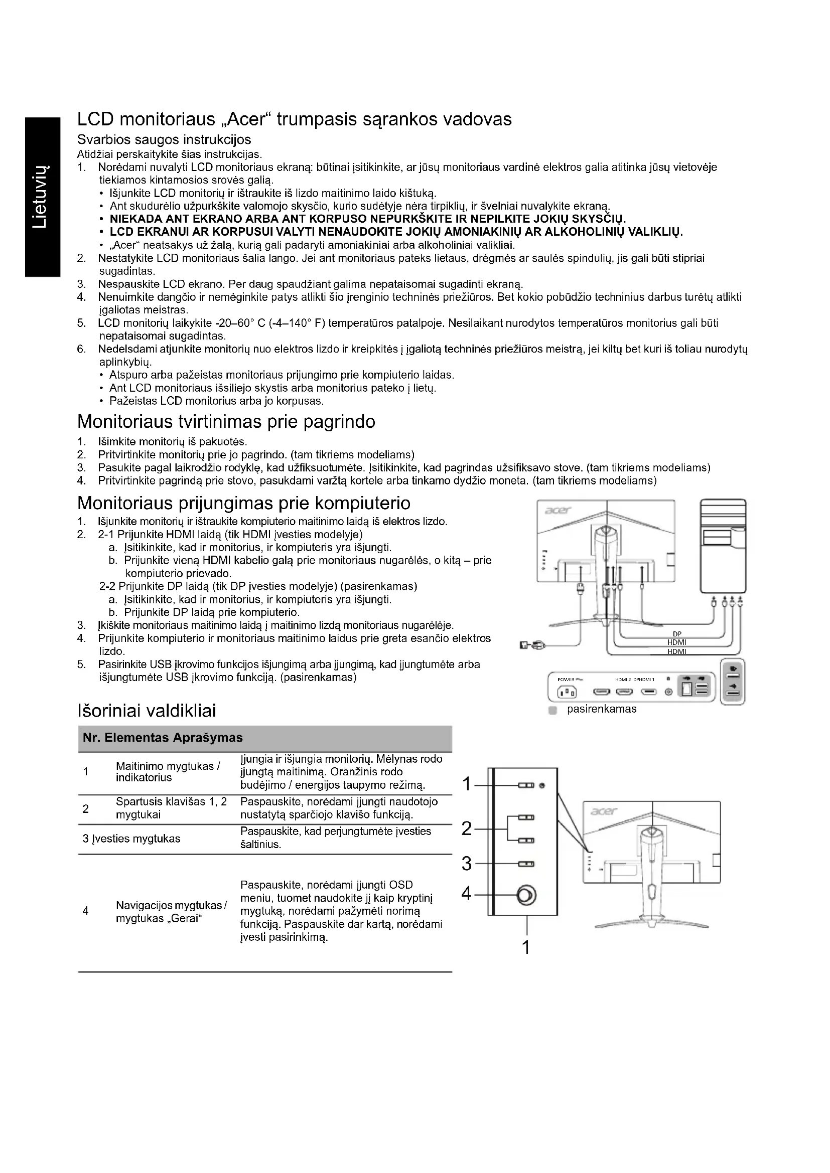 4Lietuvių Reglamentai ir saugos pranešimai FCC pranešimas Šis įrenginys išbandytas ir nustatyta, kad jis atitinka pagal FCC taisyklių 15 dalį B klasės skaitmeniniams įrenginiams taikomus apribojimus. Šie apribojimai skirti užtikrinti pagrįstą apsaugą nuo žalingų trukdžių gyvenamojoje aplinkoje. Šis prietaisas generuoja, naudoja ir gali skleisti radijo dažnio energiją. Jei jis bus įrengtas ir naudojamas nesilaikant šių instrukcijų, jis gali skleisti žalingus radijo ryšio trukdžius. Tačiau nėra garantijų, kad tam tikroje aplinkoje trukdžių nekils. Jei šis įrenginys sukelia žalingus radijo arba televizijos signalų trukdžius (tai galima nustatyti įjungus ir išjungus prietaisą), naudotojui rekomenduojama tokius trukdžius pašalinti atlikus vieną ar kelis toliau nurodytus veiksmus: pakeisti antenos kryptį arba vietą, padidinti atstumą tarp įrenginio ir imtuvo, prijungti prietaisą prie kito maitinimo lizdo arba kitos maitinimo grandinės, nei yra prijungtas imtuvas, kreiptis pagalbos į pardavimo atstovą arba patyrusį radijo ar televizijos meistrą. CE atitikties deklaracija „Acer Inc.“ pareiškia, kad šis LCD monitorius atitinka EMC direktyvos 2014/30/ES, Žemos įtampos įrenginių direktyvos 2014/35/ES, RoHS direktyvos 2011/65/ES ir Direktyvos 2009/125/EB būtinuosius reikalavimus ir kitas susijusias nuostatas dėl su energija susijusių gaminių ekologinio projektavimo reikalavimų sistemos sukūrimo. Įspėjimas: Kad neapgadintumėte monitoriaus, nekelkite jo už pagrindo. Įspėjimas: ekranuotieji kabeliai Visos jungtys į skaičiavimo įrenginius turi būti sudarytos iš ekranuotųjų kabelių, kad būtų užtikrinta atitiktis EMC reglamentams. Įspėjimas: išoriniai įrenginiai Prie šio įrenginio galima jungti tik patvirtintus B klasės apribojimus atitinkančius išorinius įrenginius (įvesties/išvesties įrenginius, terminalus, spausdintuvus ir kt.). Naudojant nesertifikuotus išorinius įrenginius gali kilti radijo ir televizijos signalų priėmimo trukdžių. Įspėjimas Gamintojo aiškiai nepatvirtinti pakeitimai panaikina Federalinės komunikacijų komisijos leidimą naudoti šį gaminį. Naudojimo sąlygos Šis įrenginys atitinka FCC taisyklių 15 dalį. Naudojimui taikomos šios dvi sąlygos: 1) įrenginys negali kelti žalingų trukdžių; 2) šis įrenginys turi priimti bet kokius gautus trukdžius, įskaitant ir nepageidaujamą veikimą galinčius sukelti trukdžius. Įspėjimas: naudotojams Kanadoje Šis B klasės skaitmeninis prietaisas atitinka Kanados teisės aktą ICES-003. Remarque à l'intention des utilisateurs canadiens Cet appareil numérique de la classe B est conforme à la norme NMB-003 du Canada. Privačių namų ūkių naudotojų įrangos atliekų šalinimas Europos Sąjungoje Šis ant gaminio arba jo pakuotės esantis simbolis rodo, kad gaminio negalima išmesti su kitomis buitinėmis atliekomis. Jūs esate atsakingi už įrangos atliekų atidavimą į specialų elektrinės ir elektroninės įrangos perdirbimo surinkimo punktą. Atskiras įrangos atliekų surinkimas ir perdirbimas padės išsaugoti gamtos išteklius ir užtikrinti, kad įranga būtų perdirbta žmogaus sveikatai ir aplinkai saugiu būdu. Daugiau informacijos apie tai, kur galima palikti savo įrangos atliekas perdirbti, gausite iš savo vietos savivaldybės, buitinių atliekų išvežimo tarnybos arba parduotuvėje, kurioje įsigijote šį gaminį.Lietuvių TECHNINIAI DUOMENYS „Acer“ gaminio vadovus ir kitus dokumentus rasite oficialioje „Acer“ palaikymo svetainėje. *Energijos sąnaudos per metus apskaičiuojamos naudojant įprastas 4 valandų per dieną, 365 dienų per metus sąnaudas. LCD plokštė Valdymo sistema TFT spalvinis LCD Dydis 24,5”W (62 cm) Vaizdo taškų dydis 0,283 mm (H) x 0,280 mm (V) Ryškumas Savasis: 400 cd/m