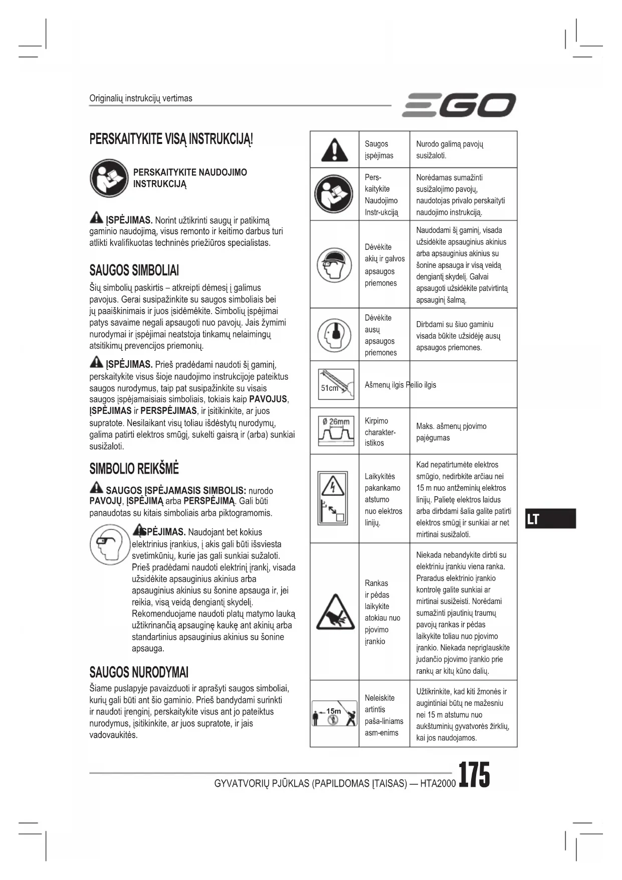 TriukšmasGarantuojamas garso galios lygis. Triukšmo sklaida į aplinką atitinka Europos Bendrijos direktyvą.V Voltas Įtampamm Milimetras Ilgis arba dydiscm Centim-etras Ilgis arba dydiskg Kilogr-amas SvorisBENDRIEJI ĮSPĖJIMAI DĖL ĮRENGINIO NAUDOJIMO SAUGOS ĮSPĖJIMAS! PERSKAITYKITE IR PERŽIŪRĖKITE VISUS SU ŠIUO ĮRENGINIU PATEIKTUS SAUGOS NURODYMUS, INSTRUKCIJAS, PAVEIKSLĖLIUS IR SPECIFIKACIJAS. Nesilaikant visų toliau išdėstytų nurodymų galima patirti elektros smūgį, sukelti gaisrą ir (ar) sunkiai susižaloti.IŠSAUGOKITE VISAS INSTRUKCIJAS SU ĮSPĖJIMAIS, NES JŲ GALI PRIREIKTI ATEITYJE.Įspėjimuose vartojamu terminu „elektrinis įrankis“ vadinamas iš elektros lizdo maitinamas (laidinis) arba akumuliatorinis elektrinis įrankis.SAUGA DARBO VIETOJE ◾ Darbo vieta turi būti švari ir gerai apšviesta. Jei darbo vieta netvarkinga ar blogai apšviesta, gali įvykti nelaimingas atsitikimas. ◾ Nedirbkite su įrenginiu sprogioje aplinkoje, pvz., ten, kur yra degiųjų skysčių, dujų arba dulkių. Įrenginys kibirkščiuoja, o kibirkštys gali uždegti dulkes arba garus. ◾ Dirbdami su elektriniu įrenginiu, neleiskite artintis vaikams ir pašaliniams asmenims. Dėl dėmesio blaškymo galite nesuvaldyti prietaiso.ELEKTROSAUGA ◾ Elektrinio įrankio kištukas turi tikti elektros lizdui. Niekada jokiais būdais kištuko neperdarykite. Su įžemintais elektriniais įrenginiais nenaudokite jokių kištuko adapterių. Originalūs kištukai, tiksliai tinkantys elektros tinklo lizdui, sumažina elektros smūgio pavojų. ◾ Nesilieskite prie įžemintų paviršių, pavyzdžiui, vamzdžių, radiatorių, viryklių ir šaldytuvų. Jei jūsų kūnas bus įžemintas, padidės elektros smūgio pavojus. ◾ Nenaudokite įrenginio lyjant ar drėgmės sąlygomis. Į įrenginį patekęs vanduo gali padidinti elektros smūgio arba gedimo pavojų, dėl kurio galite susižaloti. ◾ Atsargiai elkitės su maitinimo laidu. Niekada nenaudokite laido nešimui, traukimui arba įkroviklio atjungimui nuo maitinimo tinklo. Saugokite laidą nuo kaitros šaltinių, alyvos, aštrių briaunų ir judančių dalių. Pažeidus arba supainiojus laidus išauga pavojus patirti elektros smūgį. ◾ Kai su elektriniu įrenginiu dirbate lauke, naudokite laukui skirtą laido ilgintuvą. Naudojant laukui skirtą maitinimo laidą sumažėja pavojus patirti elektros smūgį. ◾ Jei nėra galimybės išvengti elektrinio įrenginio naudojimo drėgnoje vietoje, naudokite maitinimo šaltinį, apsaugotą nuotėkio rele. Nuotėkio relė sumažina pavojų patirti elektros smūgį.ASMENINĖ SAUGA ◾ Naudodami įrenginį būkite budrūs, stebėkite, ką darote, ir vadovaukitės sveika nuovoka. Nedirbkite su įrenginiu, jei esate pavargę arba vartojote narkotikus, alkoholį ar medikamentus. Neatidumo akimirka dirbant su įrenginiais gali lemti sunkią traumą. ◾ Naudokite asmeninės apsaugos priemones. Visada būkite su apsauginiais akiniais. Atitinkamomis sąlygomis naudojamos apsaugos priemonės, pvz., respiratorius, neslidūs apsauginiai batai, šalmas arba ausinės, sumažina pavojų susižaloti. ◾ Apsisaugokite nuo atsitiktinio įjungimo. Prieš jungdami įrenginį prie maitinimo šaltinio ir (ar) sudėtinės baterijos, prieš įrenginį keldami arba nešdami įsitikinkite, kad jungiklis yra išjungimo padėtyje. Nešant elektrinius įrenginius uždėjus pirštą ant jungiklio arba netyčia įjungiant įrenginį su įjungtu jungikliu, gali įvykti nelaimingas atsitikimas. ◾ Prieš įjungdami įrenginį patraukite į šalį visus reguliavimo raktus ir veržliarakčius. Įrenginio sukamojoje dalyje likus raktui ar veržliarakčiui galima susižaloti. ◾ Nesistenkite pasiekti pernelyg toli. Visada stovėkite tvirtai ir išlaikykite pusiausvyrą. Taip geriau suvaldysite įrenginį netikėtose situacijose.GYVATVORIŲ PJŪKLAS (PAPILDOMAS ĮTAISAS) — HTA2000 177