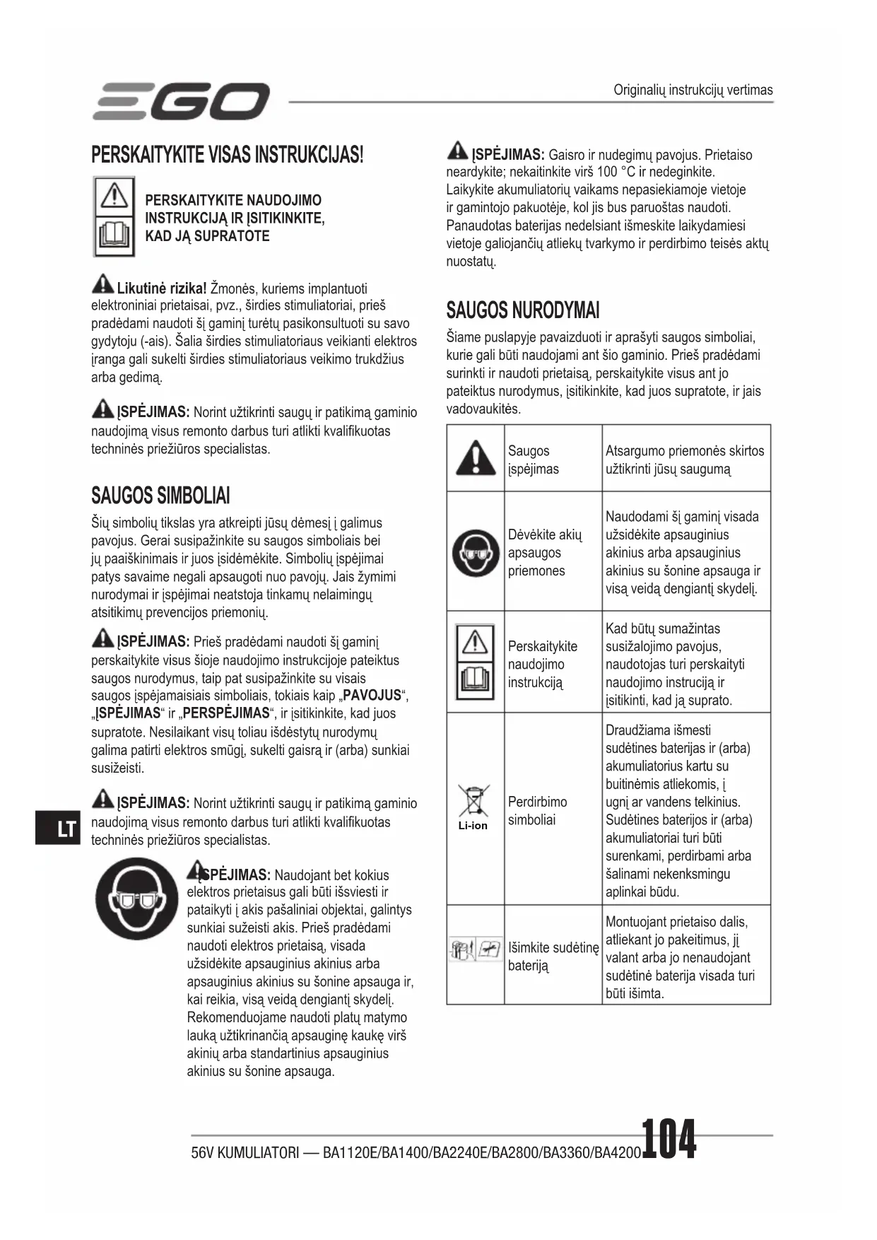 Sudėtinės baterijos įkrovimo aplinkos temperatūra Pre dosiahnutie najlepších výsledkov je potrebné batérie nabíjať na mieste, kde je teplota vyššia ako 5 ° C a nižšia ako 40 ° C. V Voltas Napätie A Amperas Prúd Hz Hercas Frekvencia (cyklov za sekundu) W Vatas Výkon min Minutės Čas Kintamoji elektros srovė Typ prúdu Nuolatinė elektros srovė Typ alebo charakteristika prúdu ĮSPĖJIMAS: Perskaitykite ir išsiaiškinkite visus nurodymus. Nesilaikant visų nurodymų galima patirti elektros smūgį, sukelti gaisrą ir (arba) sunkiai susižeisti. Visuose įspėjimuose vartojama sąvoka „elektros prietaisas“ taikoma elektriniams ir naudojamiems su maitinimo elementais (belaidžiams) EGO vejų ir sodų įrenginiams.