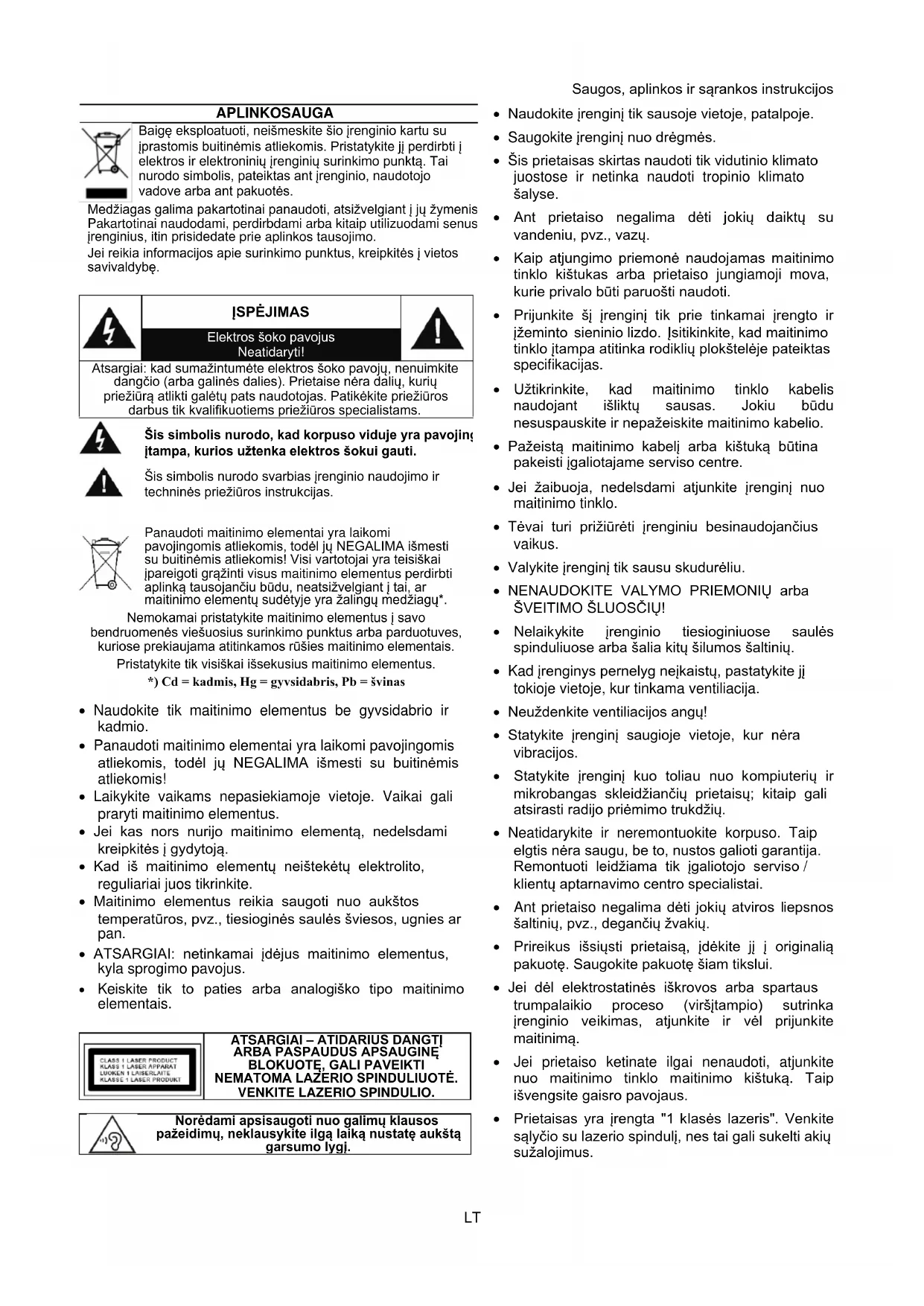 Panaudoti maitinimo elementai yra laikomi pavojingomis atliekomis, todėl jų NEGALIMA išmesti su buitinėmis atliekomis! Visi vartotojai yra teisiškai įpareigoti grąžinti visus maitinimo elementus perdirbti aplinką tausojančiu būdu, neatsižvelgiant į tai, ar maitinimo elementų sudėtyje yra žalingų medžiagų*. Nemokamai pristatykite maitinimo elementus į savo bendruomenės viešuosius surinkimo punktus arba parduotuves, kuriose prekiaujama atitinkamos rūšies maitinimo elementais. Pristatykite tik visiškai išsekusius maitinimo elementus. *) Cd = kadmis, Hg = gyvsidabris, Pb = švinas