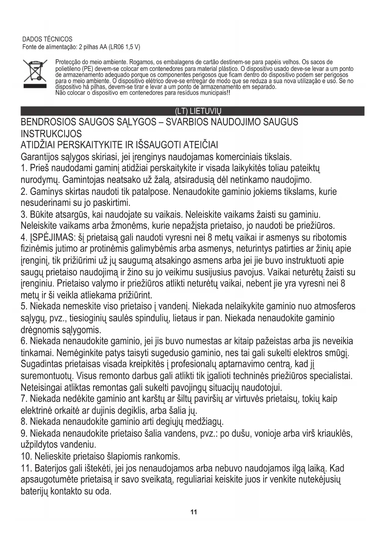 11. Baterijos gali išteketi, jei jos nenaudojamos arba nebuvo naudojamos ilgă laika. Kad apsaugotumete prietaisă ir savo sveikata, reguliariai keiskite juos ir venkite nutekëjusiu bateriju kontakto su oda.