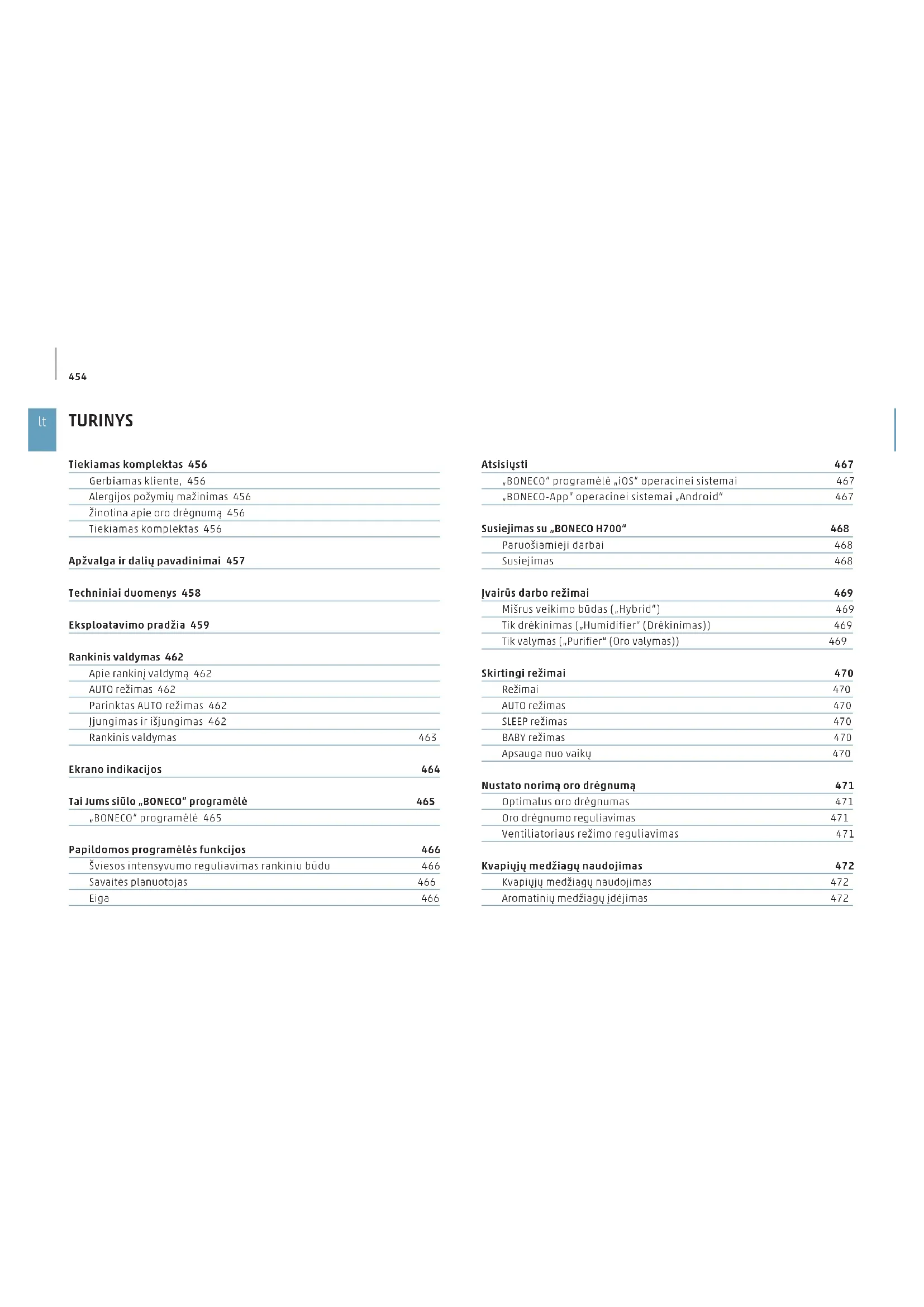 TURINYS Tiekiamas komplektas 456 Gerbiamas kliente, 456 Alergijos požymių mažinimas 456 Žinotina apie oro drėgnumą 456 Tiekiamas komplektas 456 Apžvalga ir dalių pavadinimai 457 Techniniai duomenys 458 Eksploatavimo pradžia 459 Rankinis valdymas 462 Apie rankinį valdymą 462 AUTO režimas 462 Parinktas AUTO režimas 462 Įjungimas ir išjungimas 462 Rankinis valdymas 463 Ekrano indikacijos 464 Tai Jums siūlo „BONECO“ programėlė 465 „BONECO“ programėlė 465 Papildomos programėlės funkcijos 466 Šviesos intensyvumo reguliavimas rankiniu būdu 466 Savaitės planuotojas 466 Eiga 466 Atsisiųsti 467 „BONECO“ programėlė „iOS“ operacinei sistemai 467 „BONECO-App“ operacinei sistemai „Android“ 467 Susiejimas su „BONECO H700“ 468 Paruošiamieji darbai 468 Susiejimas 468 Įvairūs darbo režimai 469 Mišrus veikimo būdas („Hybrid“) 469 Tik drėkinimas („Humidifier“ (Drėkinimas)) 469 Tik valymas („Purifier“ (Oro valymas)) 469 Skirtingi režimai 470 Režimai 470 AUTO režimas 470 SLEEP režimas 470 BABY režimas 470 Apsauga nuo vaikų 470 Nustato norimą oro drėgnumą 471 Optimalus oro drėgnumas 471 Oro drėgnumo reguliavimas 471 Ventiliatoriaus režimo reguliavimas 471 Kvapiųjų medžiagų naudojimas 472 Kvapiųjų medžiagų naudojimas 472 Aromatinių medžiagų įdėjimas 472455