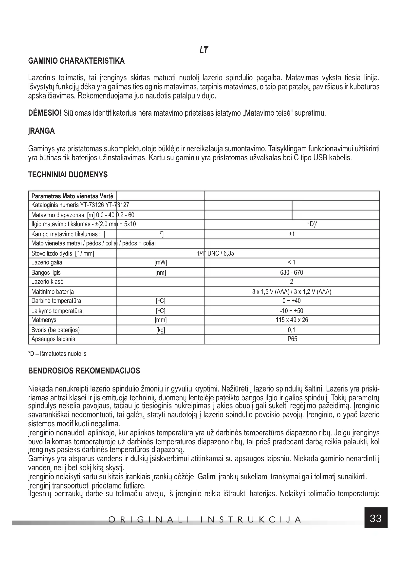 C] -10 ~ +50 Matmenys [mm] 115 x 49 x 26 Svoris (be baterijos) [kg] 0,1 Apsaugos laipsnis IP65 *D – išmatuotas nuotolis BENDROSIOS REKOMENDACIJOS Niekada nenukreipti lazerio spindulio žmonių ir gyvulių kryptimi. Nežiūrėti į lazerio spindulių šaltinį. Lazeris yra priski- riamas antrai klasei ir jis emituoja techninių duomenų lentelėje pateikto bangos ilgio ir galios spindulį. Tokių parametrų spindulys nekelia pavojaus, tačiau jo tiesioginis nukreipimas į akies obuolį gali sukelti regėjimo pažeidimą. Įrenginio savarankiškai nedemontuoti, tai galėtų statyti naudotoją į lazerio spindulio poveikio pavojų. Įrenginio, o ypač lazerio sistemos modifikuoti negalima. Įrenginio nenaudoti aplinkoje, kur aplinkos temperatūra yra už darbinės temperatūros diapazono ribų. Jeigu įrenginys buvo laikomas temperatūroje už darbinės temperatūros diapazono ribų, tai prieš pradedant darbą reikia palaukti, kol įrenginys pasieks darbinės temperatūros diapazoną. Gaminys yra atsparus vandens ir dulkių įsiskverbimui atitinkamai su apsaugos laipsniu. Niekada gaminio nenardinti į vandenį nei į bet kokį kitą skystį. Įrenginio nelaikyti kartu su kitais įrankiais įrankių dėžėje. Galimi įrankių sukeliami trankymai gali tolimatį sunaikinti. Įrenginį transportuoti pridėtame futliare. Ilgesnių pertraukų darbe su tolimačiu atveju, iš įrenginio reikia ištraukti baterijas. Nelaikyti tolimačio temperatūrojeORIGINALI INSTRUKCIJA
