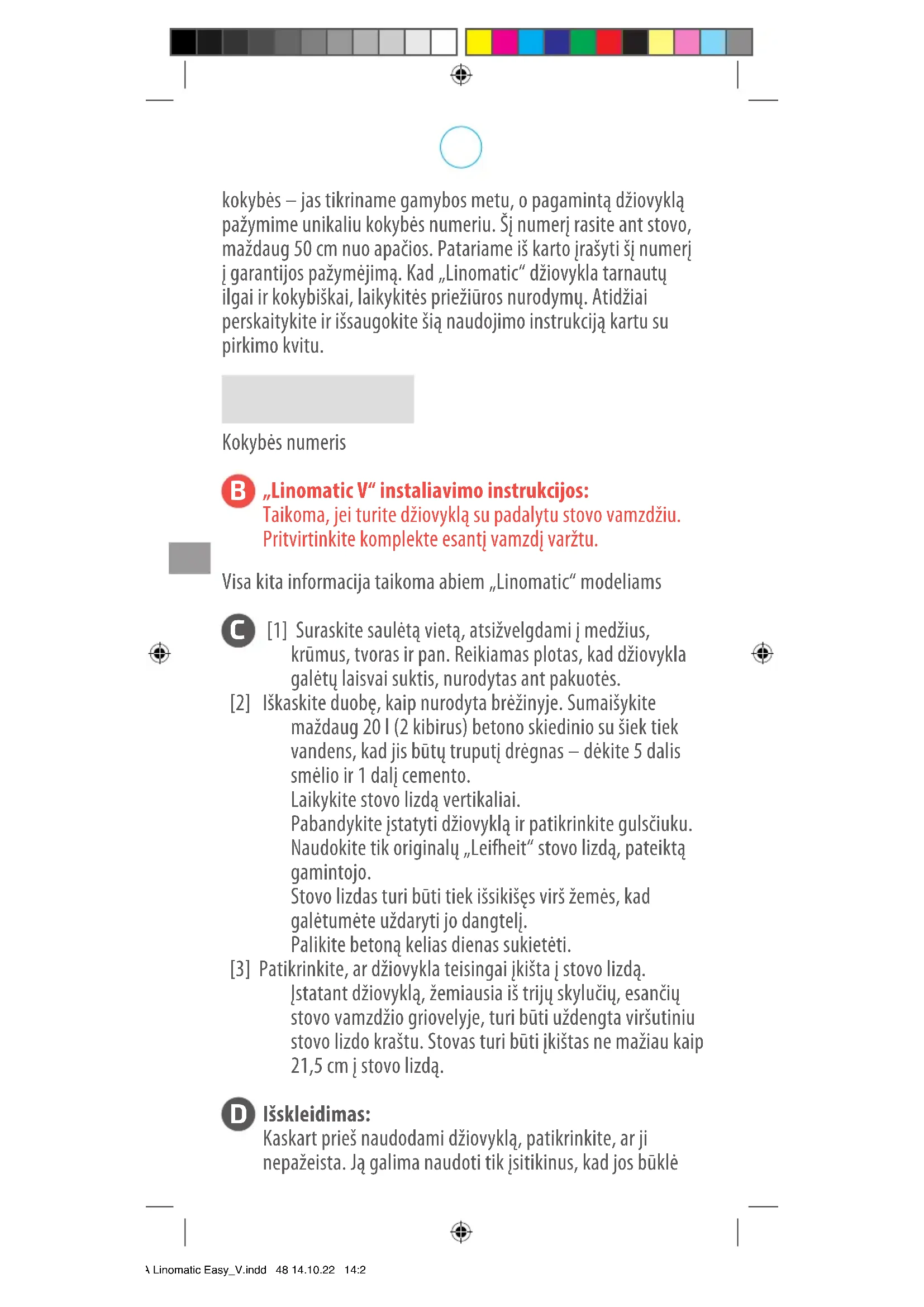 Reguliariai valykite stovą indų plovikliu suvilgyta drėgna šluoste. Stovą taip pat kartais galite patrinti ant šluostės užpurkšta sintetine valymo priemone. Kai džiovykla išskleista, į virvių įtraukimo angas galima įpurkšti šiek tiek priežiūros purškalo. Reguliariai nuvalykite nuo stovo lizdo žemę, smėlį ir vandenį. *BA Linomatic Easy_V.indd 49 14.10.22 14:26Saugaus naudojimo nurodymai: „Leifheit“ džiovykla „Linomatic“ yra skirta asmeniniam naudojimui lauke ir gali būti naudojamas tik pagal šioje naudojimo instrukcijoje pateiktą informaciją. Draudžiama naudoti ne pagal paskirtį. Naudojant džiovyklą, vaikai gali pasismaugti jos virvėmis. Kad išvengtumėte pasismaugimo virvėmis ir įsipainiojimo jose, džiovyklą naudokite tik vaikų nepasiekiamoje vietoje. Virvės gali apsivynioti aplink vaiko kaklą. Virvių nesuriškite. Užtikrinkite, kad virvės nesusisuktų ir nesudarytų kilpų. Prieš kiekvieną naudojimą patikrinkite džiovyklą ir išskleidimo virvę dėl pažeidimų. Pažeistos džiovyklos nenaudokite. Vor dem Önen sicherstellen, dass der Deckel der Bodenhülse an dem entsprechenden Gegenstück am Standrohr arretiert ist.