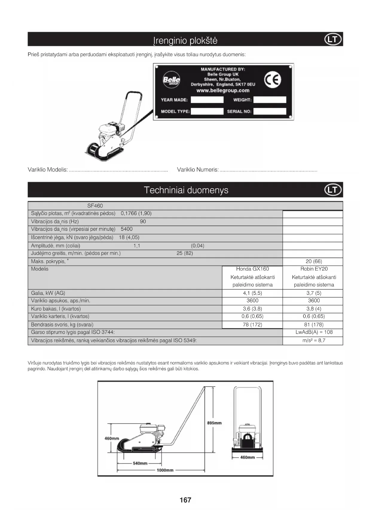 (kvadratinės pėdos) 0,1766 (1,90) Vibracijos da˛nis (Hz) 90 Vibracijos da˛nis (virpesiai per minutę) 5400 Išcentrinė jėga, kN (svaro jėga/pėda) 18 (4,05) Amplitudė, mm (coliai) 1,1 (0,04) Judėjimo greitis, m/min. (pėdos per min.) 25 (82) Maks. pokrypis, ˚ 20 (66) Modelis Honda GX160 Robin EY20 Keturtaktė atšokanti Keturtaktė atšokanti paleidimo sistema paleidimo sistema Galia, kW (AG) 4,1 (5,5) 3,7 (5) Variklio apsukos, aps./min. 3600 3600 Kuro bakas, l (kvartos) 3,6 (3,8) 3,8 (4) Variklio karteris, l (kvartos) 0,6 (0,65) 0,6 (0,65) Bendrasis svoris, kg (svarai) 78 (172) 81 (178) Garso stiprumo lygis pagal ISO 3744: LwAdB(A) = 108 Vibracijos reikšmės, ranką veikiančios vibracijos reikšmės pagal ISO 5349: m/s² = 8,7 Viršuje nurodytas triukšmo lygis bei vibracijos reikšmės nustatytos esant normalioms variklio apsukoms ir veikiant vibracijai. Įrenginys buvo padėtas ant lankstaus pagrindo. Naudojant įrenginį dėl atitinkamų darbo sąlygų šios reikšmės gali būti kitokios.168 Saugos instrukcijos