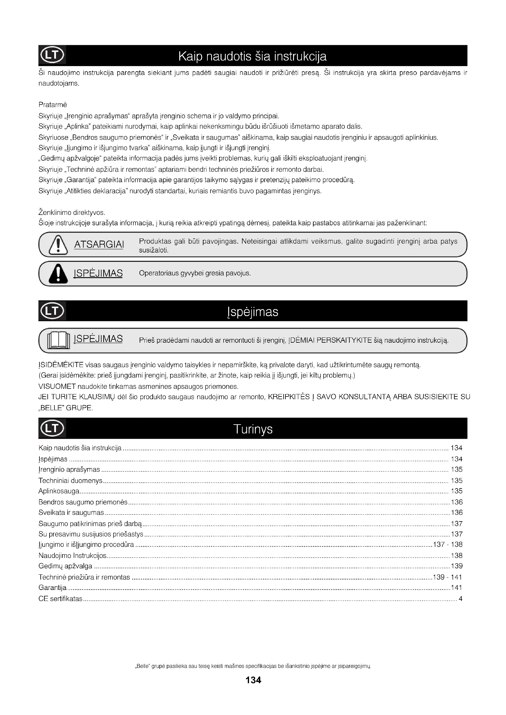 Prieš pradėdami naudoti ar remontuoti ši įrenginį, ĮDĖMIAI PERSKAITYKITE šią naudojimo instrukciją. ĮSPĖJIMAS Turinys „Belle” grupė pasilieka sau teisę keisti mašinos specifikacijas be išankstinio įspėjimo ar įsipareigojimų.