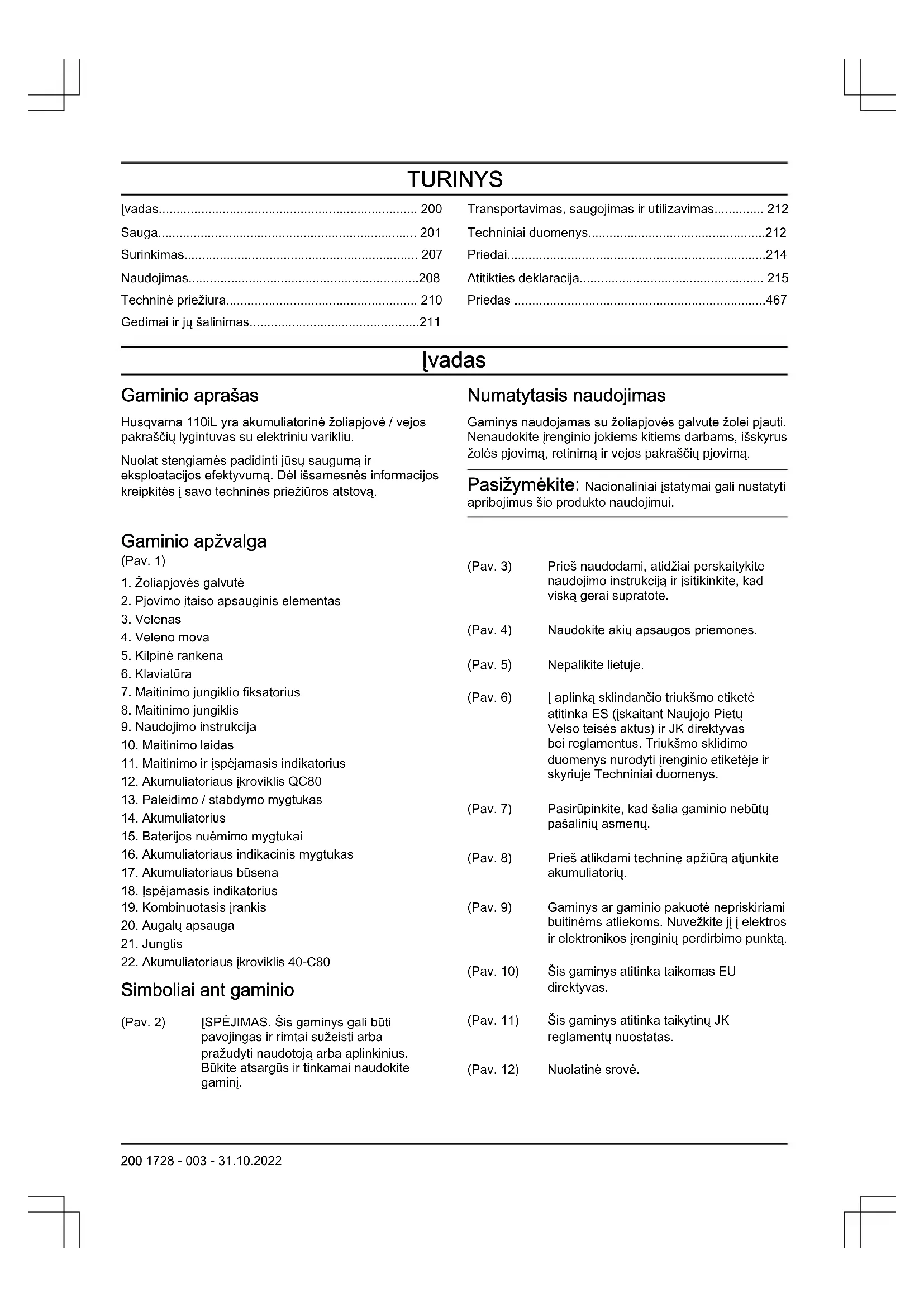 Simboliai ant gaminio (Pav. 2) ĮSPĖJIMAS. Šis gaminys gali būti pavojingas ir rimtai sužeisti arba pražudyti naudotoją arba aplinkinius. Būkite atsargūs ir tinkamai naudokite gaminį. (Pav. 3) Prieš naudodami, atidžiai perskaitykite naudojimo instrukciją ir įsitikinkite, kad viską gerai supratote. (Pav. 4) Naudokite akių apsaugos priemones. (Pav. 5) Nepalikite lietuje. (Pav. 6) Į aplinką sklindančio triukšmo etiketė atitinka ES (įskaitant Naujojo Pietų Velso teisės aktus) ir JK direktyvas bei reglamentus. Triukšmo sklidimo duomenys nurodyti įrenginio etiketėje ir skyriuje Techniniai duomenys. (Pav. 7) Pasirūpinkite, kad šalia gaminio nebūtų pašalinių asmenų. (Pav. 8) Prieš atlikdami techninę apžiūrą atjunkite akumuliatorių. (Pav. 9) Gaminys ar gaminio pakuotė nepriskiriami buitinėms atliekoms. Nuvežkite jį į elektros ir elektronikos įrenginių perdirbimo punktą. (Pav. 10) Šis gaminys atitinka taikomas EU direktyvas. (Pav. 11) Šis gaminys atitinka taikytinų JK reglamentų nuostatas. (Pav. 12) Nuolatinė srovė. 200 1728 - 003 - 31.10.2022yyyywwxxxxx Vardinėje parametrų arba lazeriu įspaustoje plokšte- lėje nurodytas serijos nu- meris. yyyy yra pagamini- mo metai, o ww yra paga- minimo savaitė. Simboliai ant akumuliatoriaus ir (ar) akumuliatoriaus įkroviklio (Pav. 16) Nuvežkite šį gaminį į elektros ir elektronikos įrenginių perdir- bimo punktą. (galioja tik Euro- poje) (Pav. 13) Apsaugotas transformatorius. (Pav. 14) Akumuliatoriaus įkroviklį naudokite ir laikykite tik uždarose patalpose. (Pav. 15) Dviguba izoliacija. Atsakomybė už gaminį Kaip nurodyta atsakomybės už gaminį įstatymuose, mes nesame atsakingi už mūsų gaminio sukeltą žalą, jei: